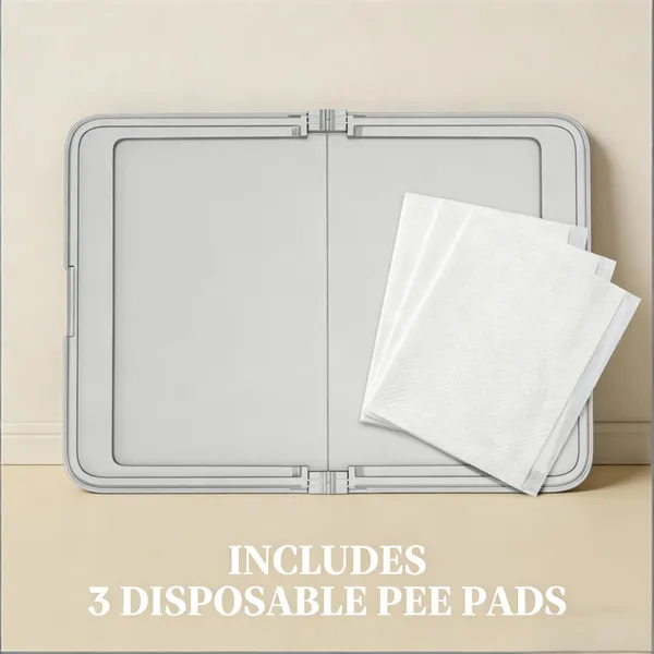 Features: - A generous 33.9" x 24.4" tray provides ample potty space, preventing messy spills - Use it flat or create a 90-degree wall for male dogs who lift their leg - Pad clamps and non-slip feet ensure this dog litter box remains securely in place - Folds down to 24.4" x 17.3" x 3.7" for compact storage or travel - Made from high-quality PP material that is super easy to rinse clean after use - Includes three disposable 35.4" x 23.6" pads for immediate use right out of the box - No assembly required Specification: - Color: Gray, White - Material: PP, Non-woven Fabric - Overall Dimension: 33.9" L x 24.4" W x 1.9" H - Inner Dimension: 26.8" L x 19.3" W - Folding Size: 24.4" L x 17.3" W x 3.7" H