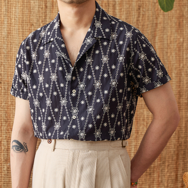 Holiday Pure Cotton Embroidery Cuban Collar Loose Shirt