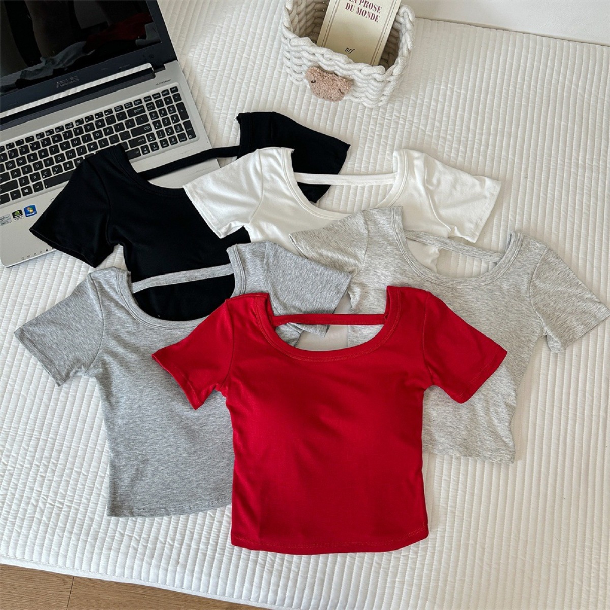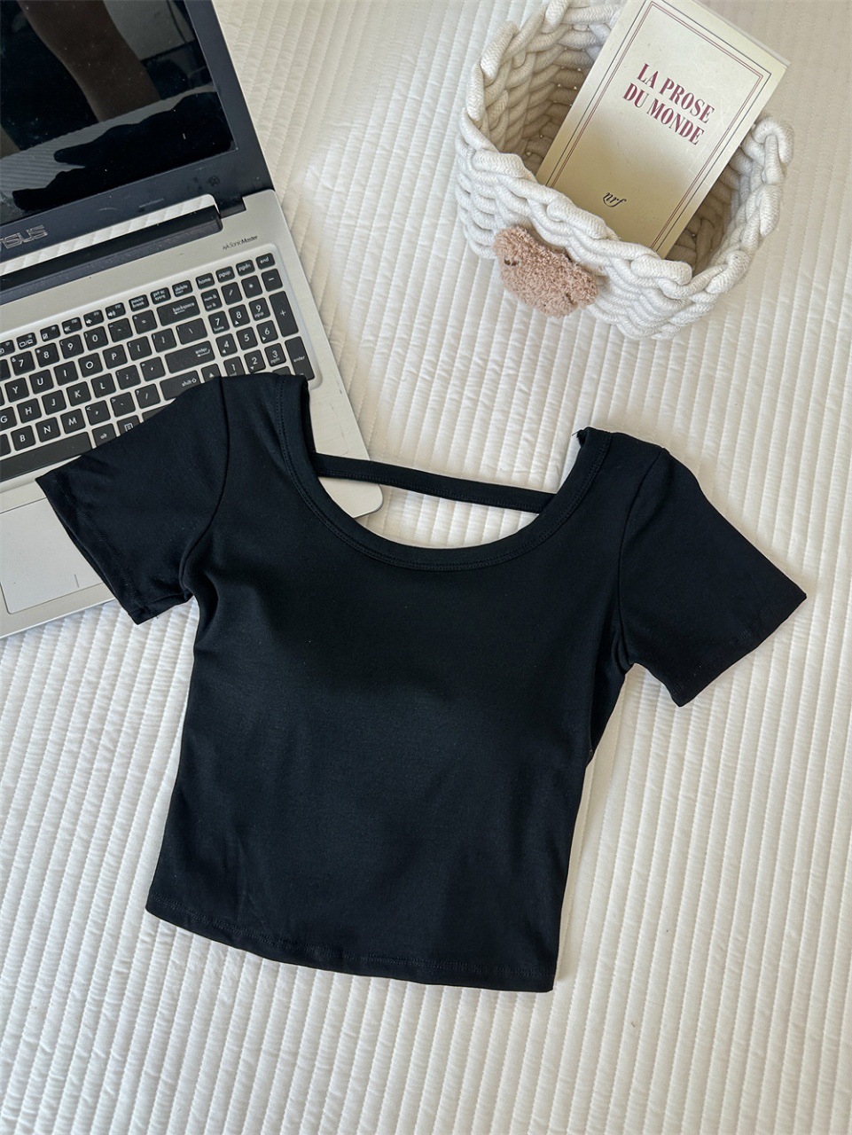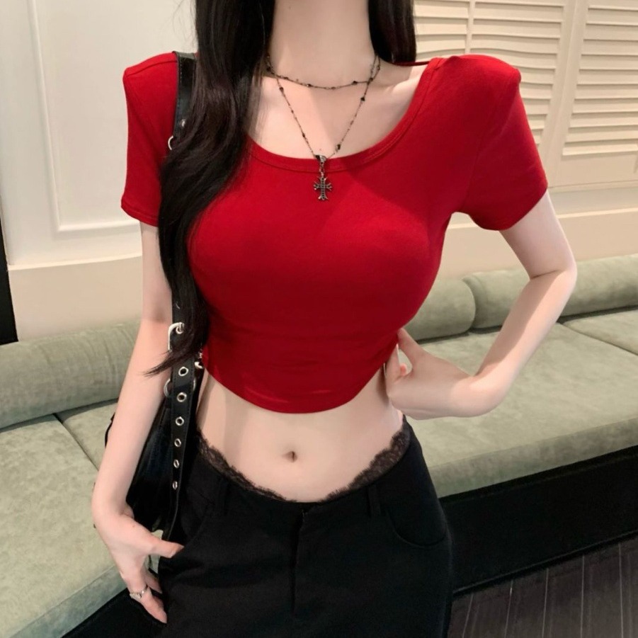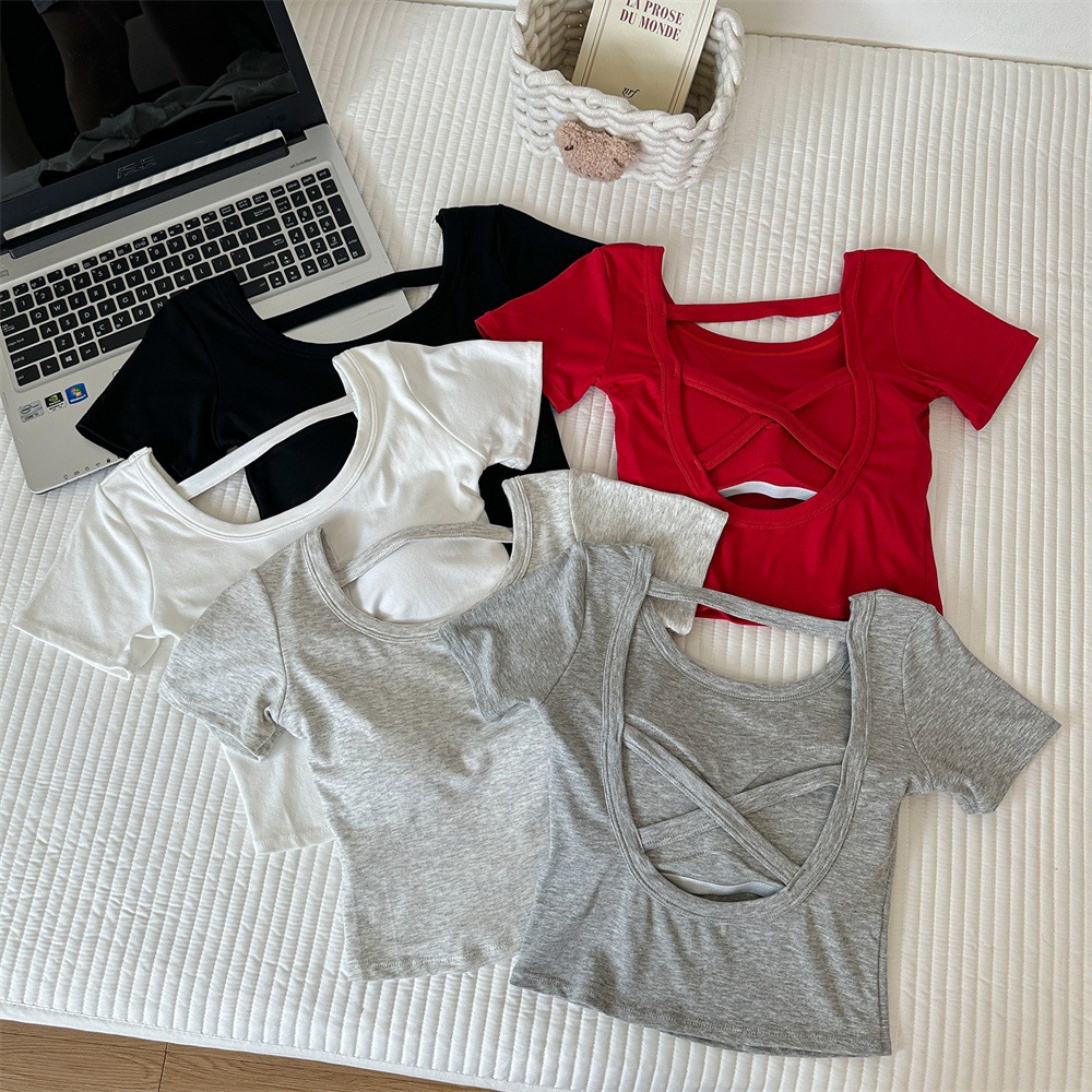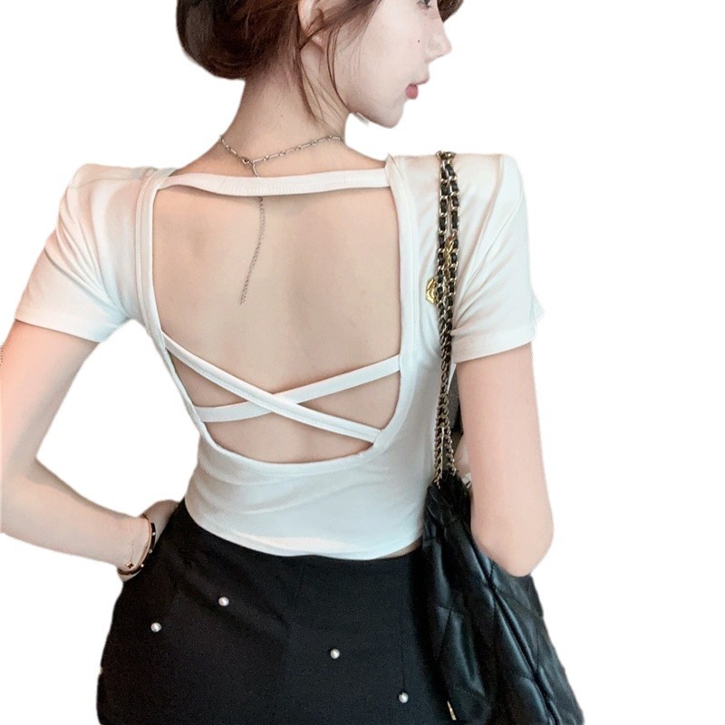 Hollow-out Cross Backless Tight Belt Chest Pad All-matching Round Neck T-shirt