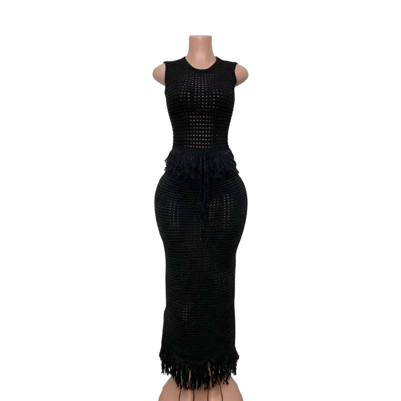 Hollow-out Fringe Sleeveless High-neck Top With Bodycon Long Skirt Two-piece Set