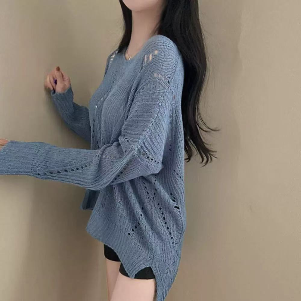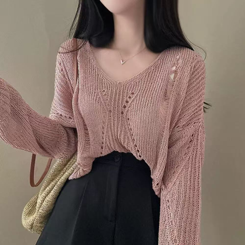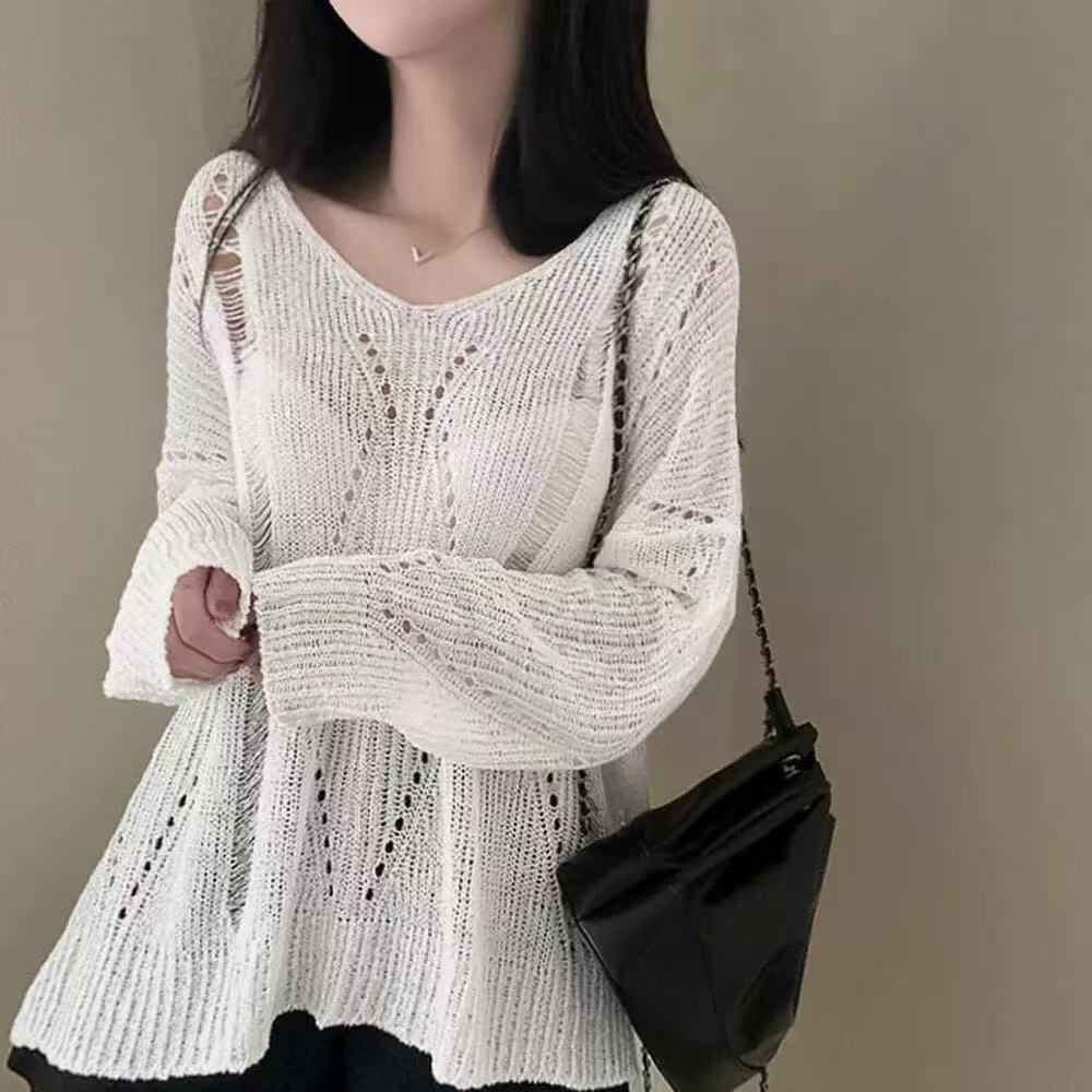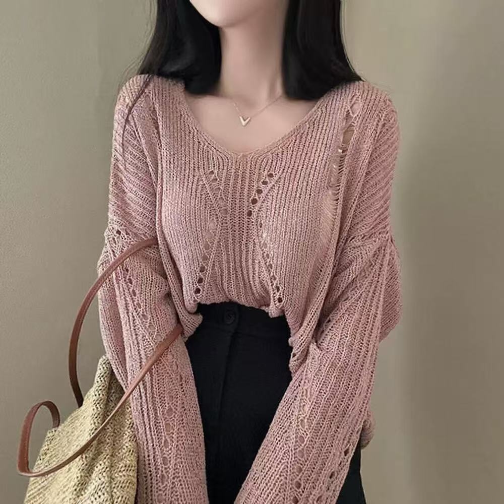 Hollow-out Ice Silk Thin Long Sleeve Mid-length V-neck Sweater