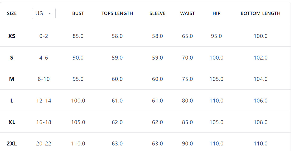 Sizes: XS, S, M, L, XL, XXL