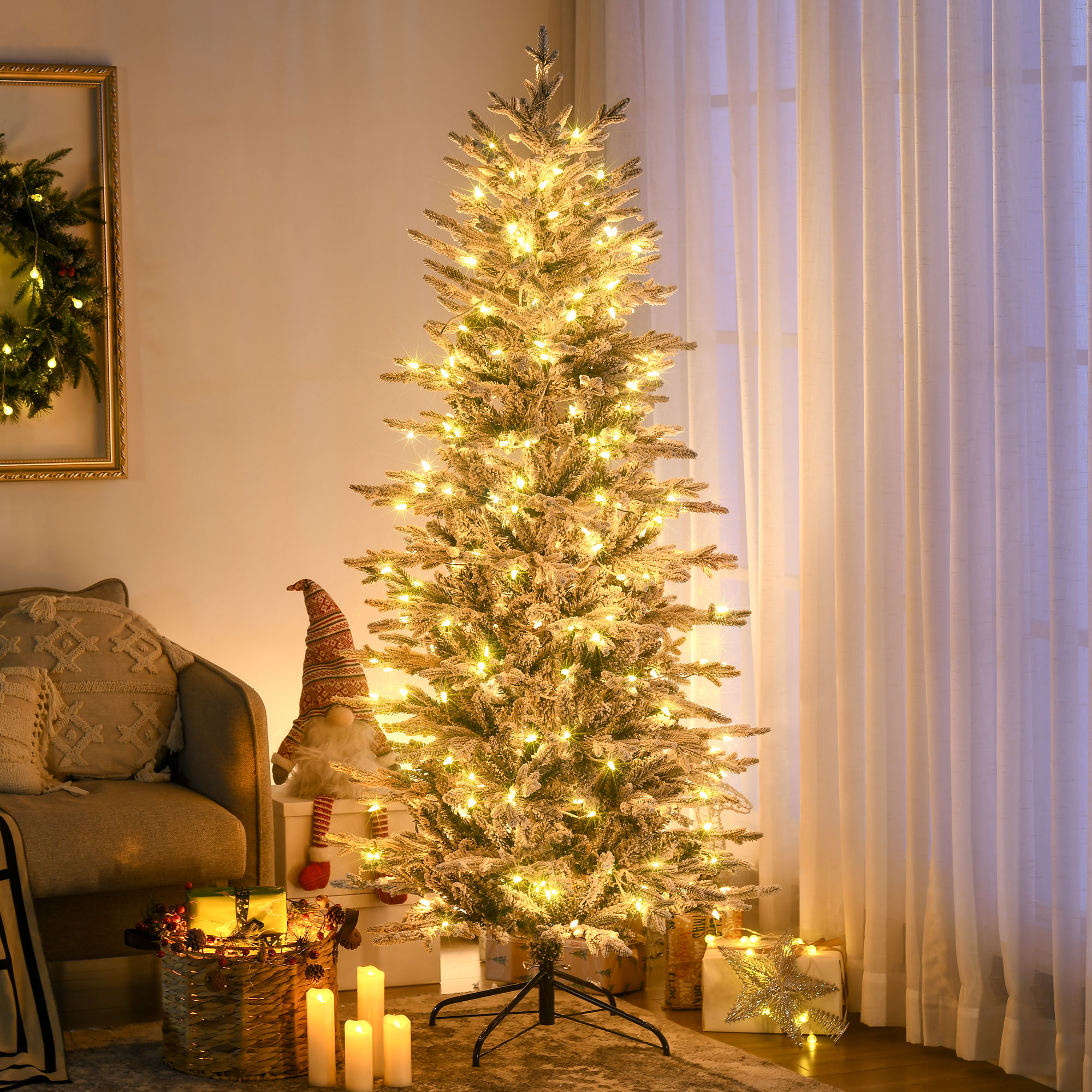 Product Name:HOMCOM 6ft Tall Prelit Artificial Christmas Tree Holiday Décor with 636 Snow Flocked Branches, 250 Warm Yellow Clear Lights, Auto Open, Extra Bulb