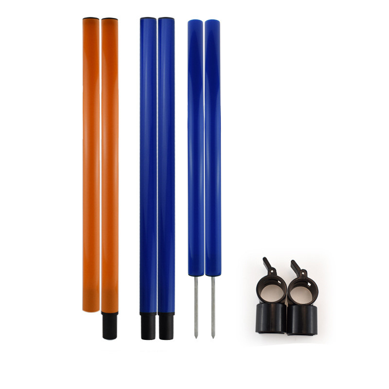 Four vertical rods are combined into two vertical rods, and two horizontal rods are combined into one horizontal rod, which is inserted into the bottom end of the vertical rod to fix the position on the grass. The fixing clip is used to hold the horizontal rod and the vertical rod. The height of the pole can be adjusted arbitrarily; the jump pole is composed of two horizontal bars, which can be used in a fixed Position on the grass