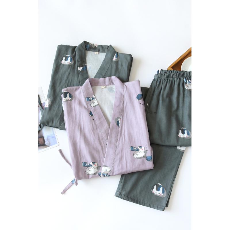 Color classification: Purple-Gauze Kimono Drunk Cat-Female Dark Green-Gauze Kimono Drunk Cat-Men's Pants