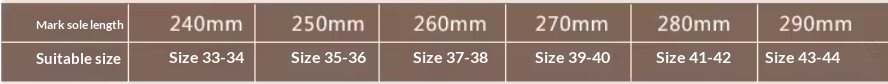 Shoe sizes: 25 (suitable for sizes 35-36), 26 (suitable for sizes 37-38), 27 (suitable for sizes 39-40), 28 (suitable for sizes 41-42), 29 (suitable for sizes 43-44)