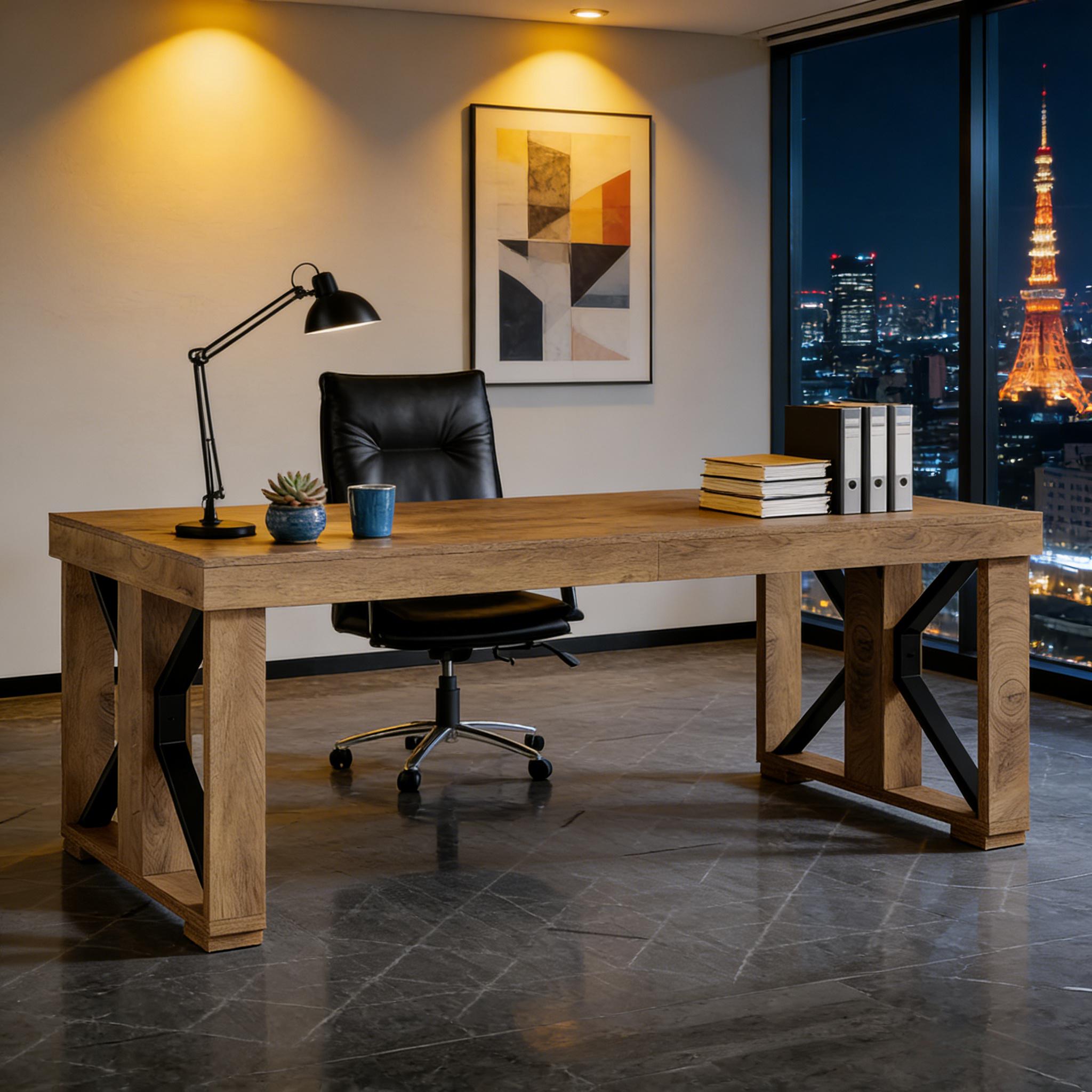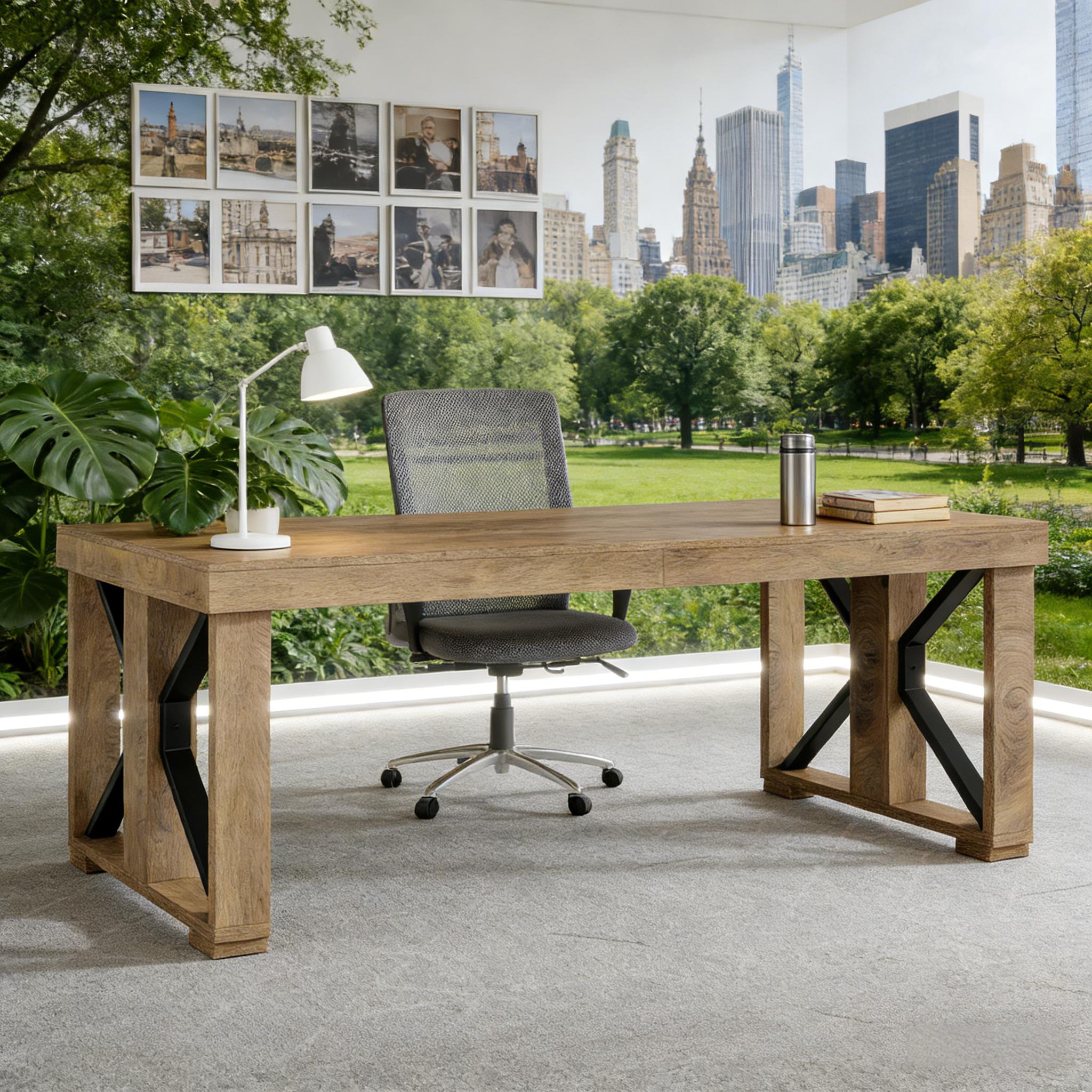 Important Reminder!!! 1) Attention: All products in our store do not support Canada self pickup ordering. Please do not create shipping labels for Canada. Our American products do not support self pickup to Canada 2)We do not ship to Alaska, Hawaii, US protectorates (e.g., Puerto Rico), P.O. boxes, or APO/FPO addresse 3)We don’t accept non-defective remorse returns Modern Minimalist Aesthetics - Enhance your workspace with this executive desk, characterized by a warm brown wood-grain finish and sleek lines. The combination of modern elegance and streamlined efficiency lends a sophisticated touch to any office or home workspace. Expansive Workspace - With dimensions of 70.87" W x 31.5" D, this large office desk provides ample space for your computer, paperwork, and essential office supplies, all within arm's reach. The generous 29.53" of legroom guarantees comfortable usage without compromising productivity. Flexible Use - This straightforward office desk is designed for adaptability and effortlessly fits into any space. It can be used as an executive desk, a computer workstation, a conference table, or even a dining table, maximizing utility in smaller areas. Robust and Steady Construction - Constructed from top-quality particle board and bolstered by metal supports, this desk is built to withstand daily use while remaining stable. The solid base can hold up to 200 lb, guaranteeing long-term stability. Effortless Assembly - Bid farewell to exasperating setups! With clear instructions and well-labeled parts, assembling this desk is a cinch, allowing you to refresh your workspace in no time.
