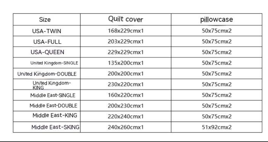 Size specification: US-Double pillowcase: 50*75*2; Quilt cover: width 168 * length 229(1.2kg), US-full pillowcase: 50*75*2; Quilt cover: width 203 * length 229(1.5kg), USA-Queen pillowcase: 50*75*2; Quilt cover: width 229 * length 229(1.7kg), UK-single pillowcase: 50*75*2; Quilt cover: width 135 * Length 200(0.9kg), UK-double pillowcase: 50*75*2; Quilt cover: width 200 * Length 200(1.3kg), UK-King pillowcase: 50*75*2; Quilt cover: width 230 * length 220(1.7kg),AR-single pillowcase: 50*75*2; Quilt cover: width 160 * length 220(1.1kg),AR-double pillowcase: 50*75*2; Quilt Cover: width 230 * Length 200(1.5kg),ar-king pillowcase: 50*75*2; Quilt cover: width 240 * length 220(1.7kg),ar-sking pillowcase: 51*92*2; Quilt: width 240 * length 260(1.9)