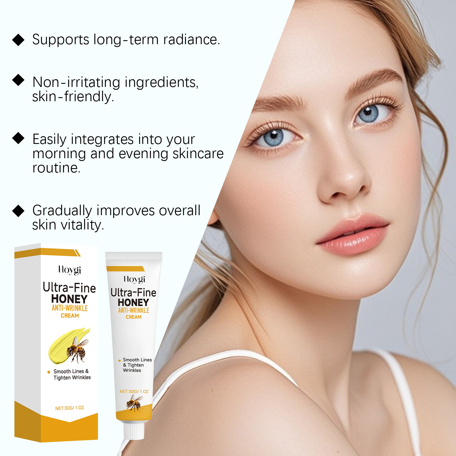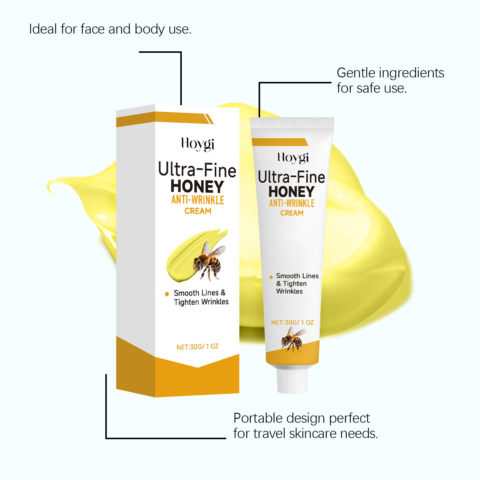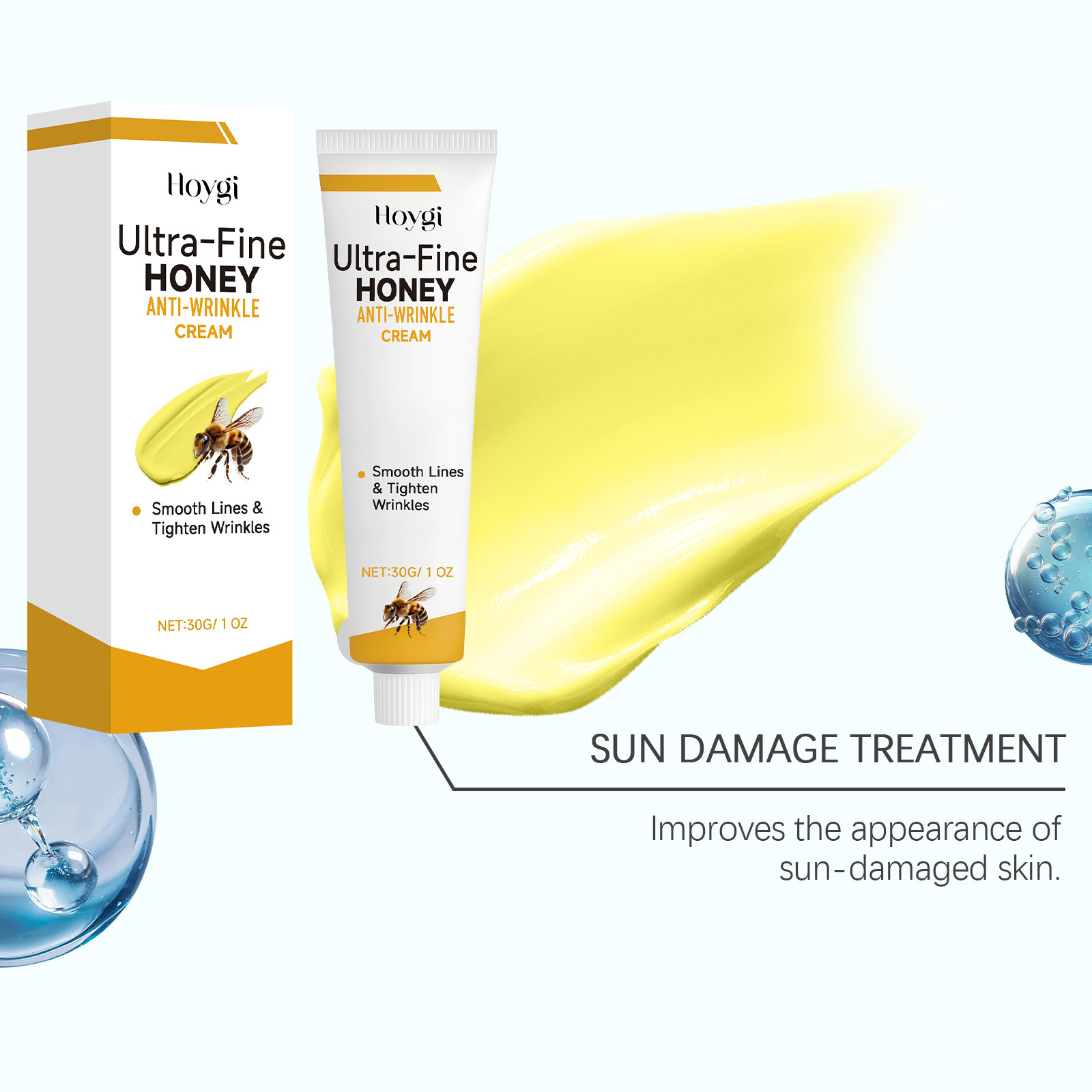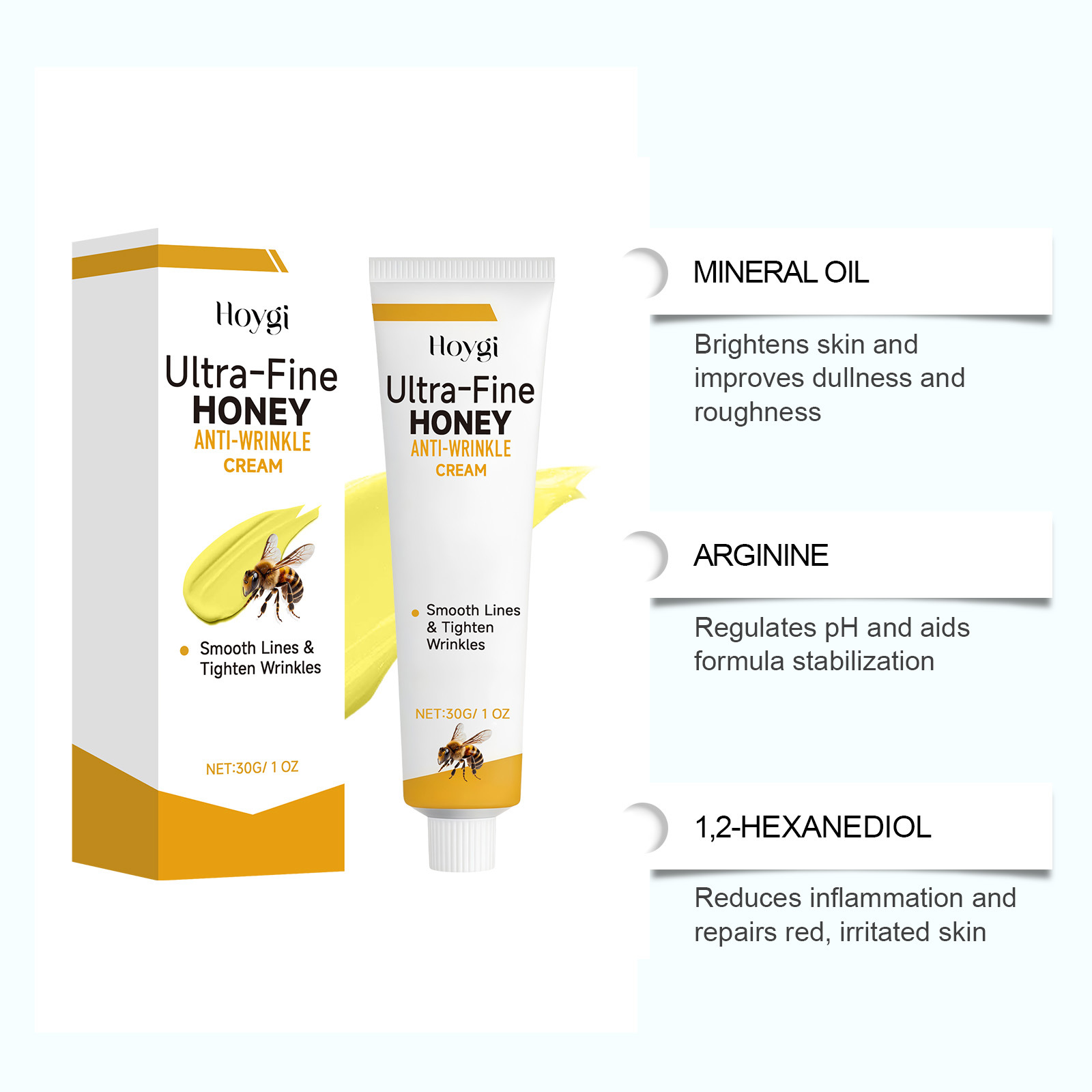 Ingredients: water, glycerin, mineral oil, 1,2-hexanediol, glyceryl stearate, carbomer, arginine, tocopherol, hydrolyzed collagen, nicotinamide, bee venom and hyaluronic acid.