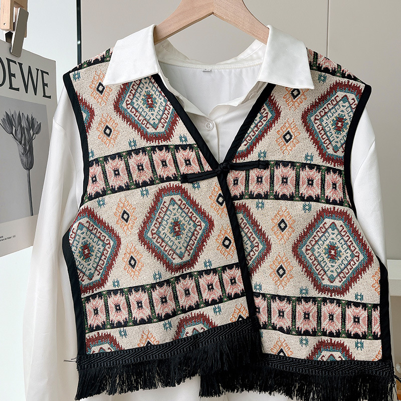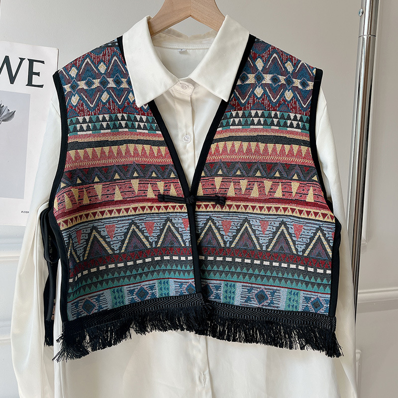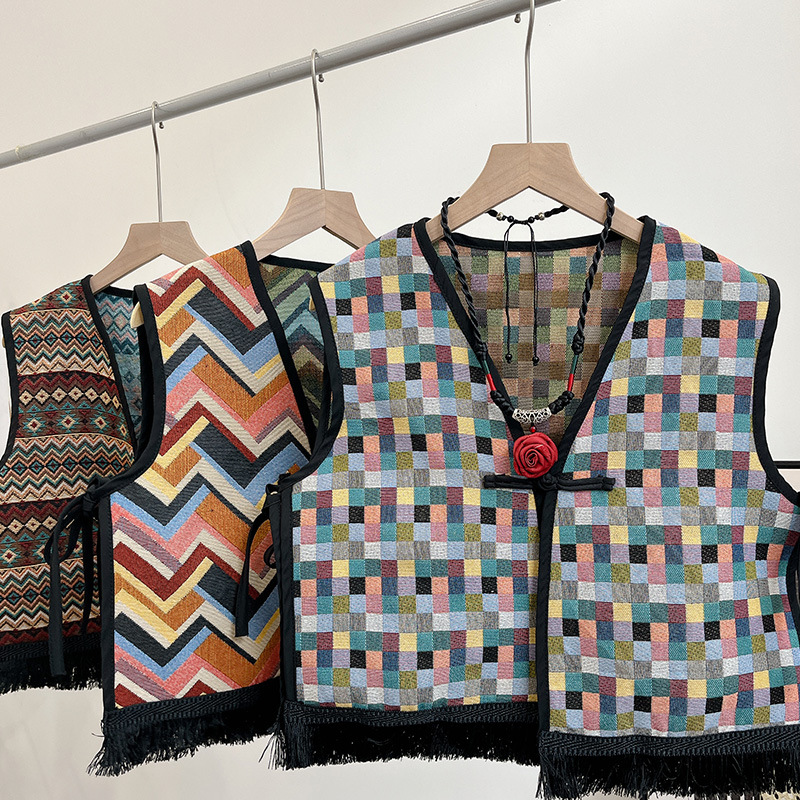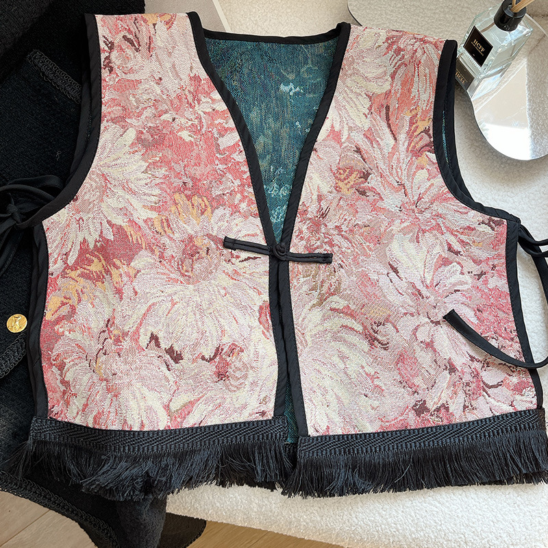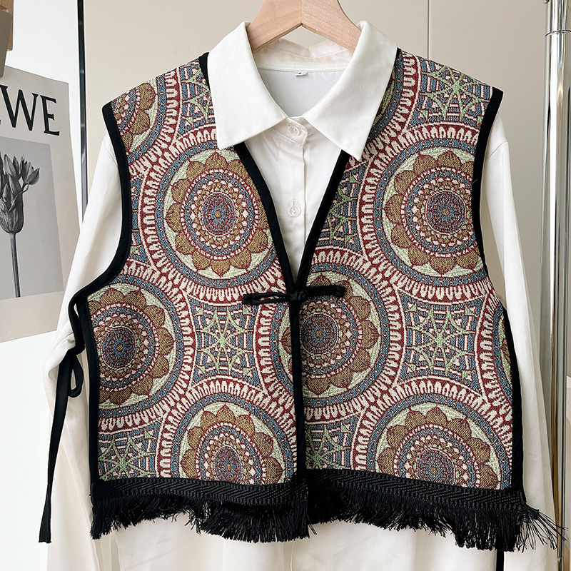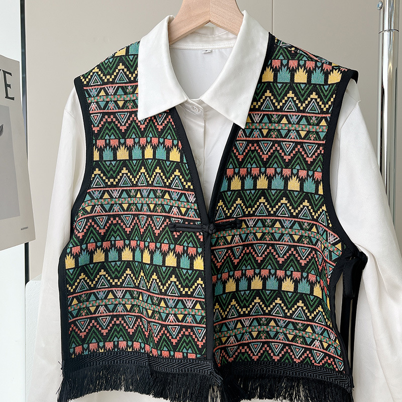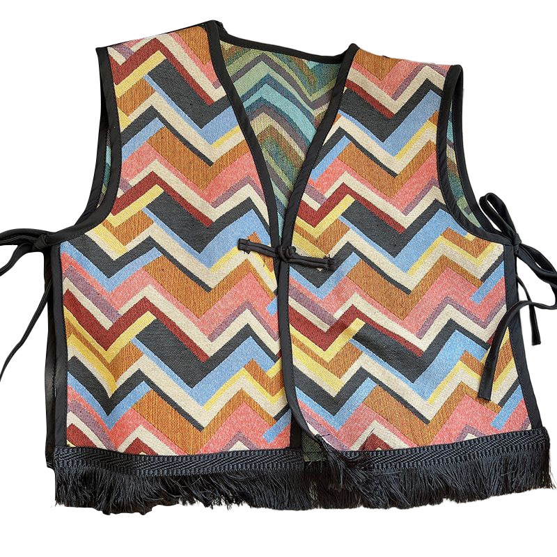 Color: Black fringe edge ~ green hillside vest, black fringe edge-2 plaid vest, black fringe edge-Egyptian triangle vest, black fringe edge-Lily camel vest, black tassel edge layer triangle landscape vest, black tassel edge-pink flower picture vest, black tassel edge-black ancient vest, black tassel edge-Pat vintage vest, black tassel edge round large flower vest, black tassel edge round cell vest