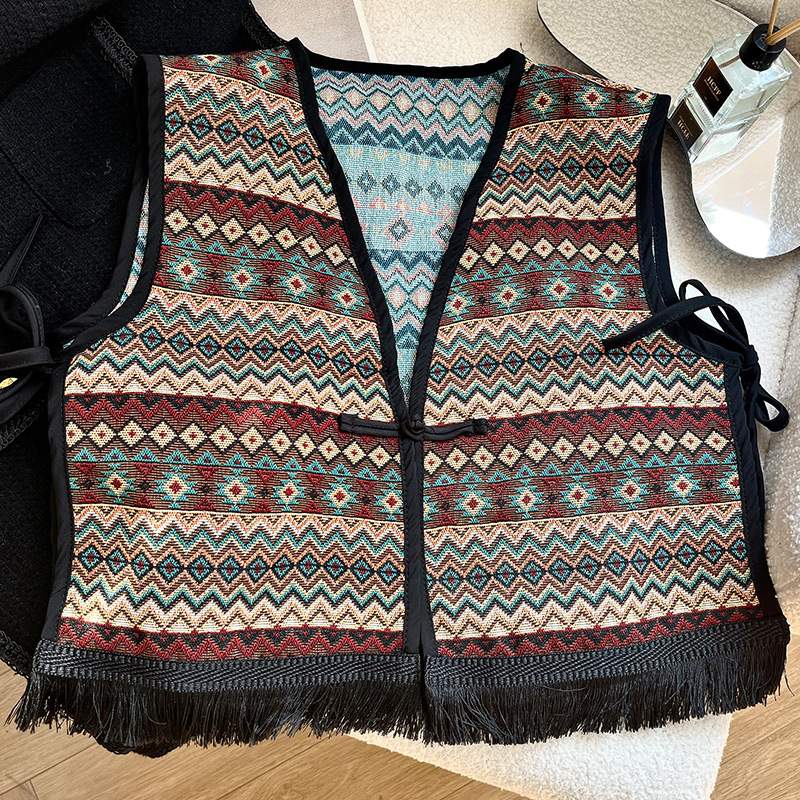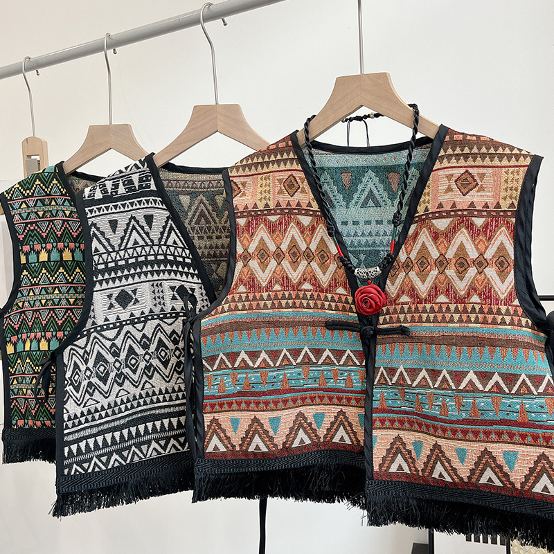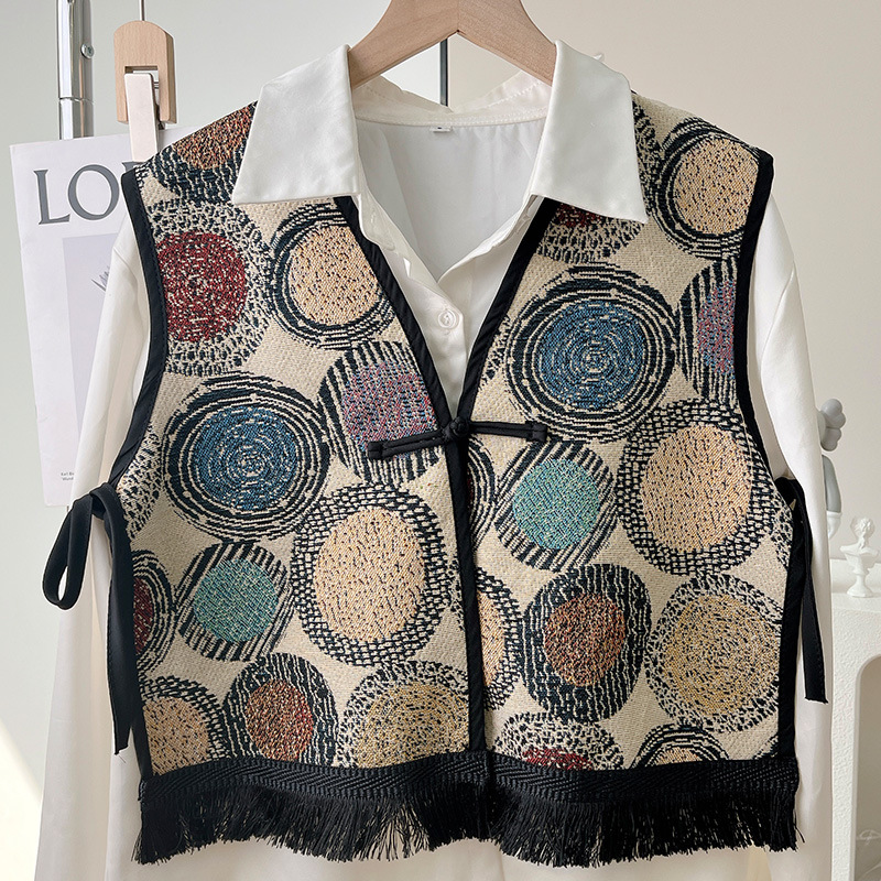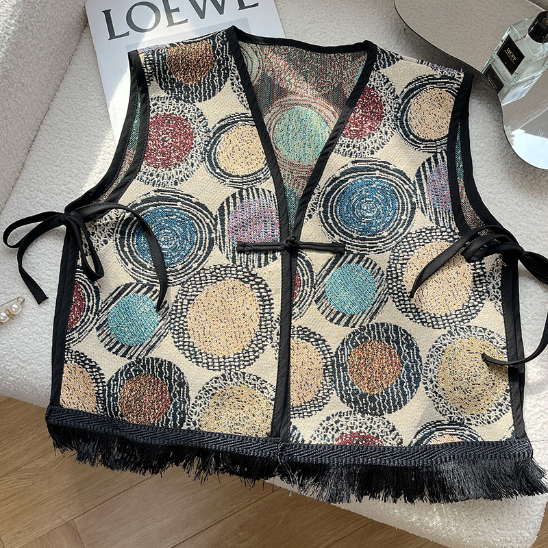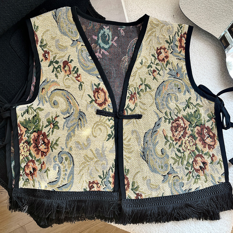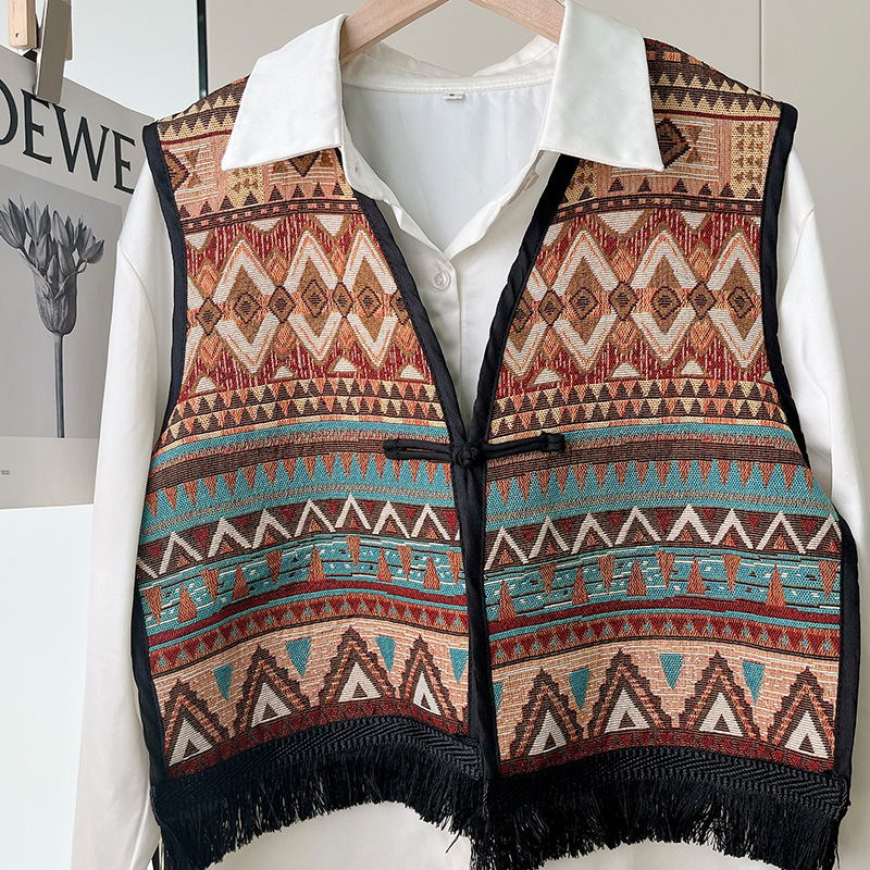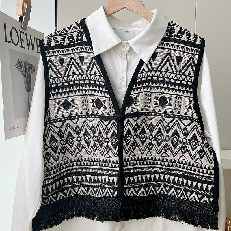 Color: Black fringe edge ~ green hillside vest, black fringe edge-2 plaid vest, black fringe edge-Egyptian triangle vest, black fringe edge-Lily camel vest, black tassel edge layer triangle landscape vest, black tassel edge-pink flower picture vest, black tassel edge-black ancient vest, black tassel edge-Pat vintage vest, black tassel edge round large flower vest, black tassel edge round cell vest