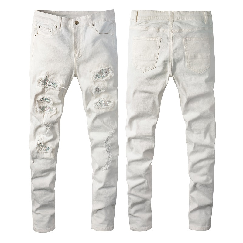 Hot Drill Patch Hole White Slim-fit Pants Male