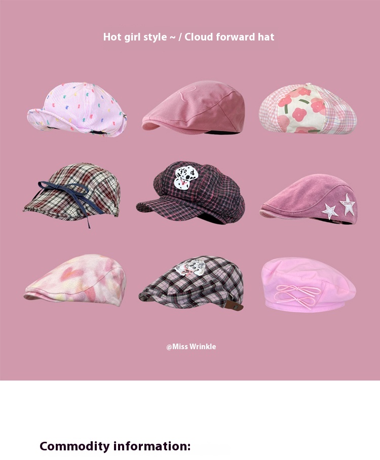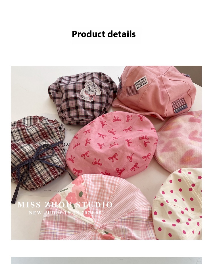 Color: lace-up plaid bow advance hats, kitten Plaid advance hats pink, spotted dog Plaid octagonal cap 25, large Plaid advance hats-pink, double bow beret-Cherry Blossom powder, small flower stitching beret-pink, love heart advance hats-pink, three-color bow advance hats Rose Red, bow Plaid duck tongue bud pink, bubble beret raspberry, classic style beret pink, Button macaron pink, rainbow plaid beret beret, xx Plaid advance hats Brown, xxx washed baseball cap Rose Red