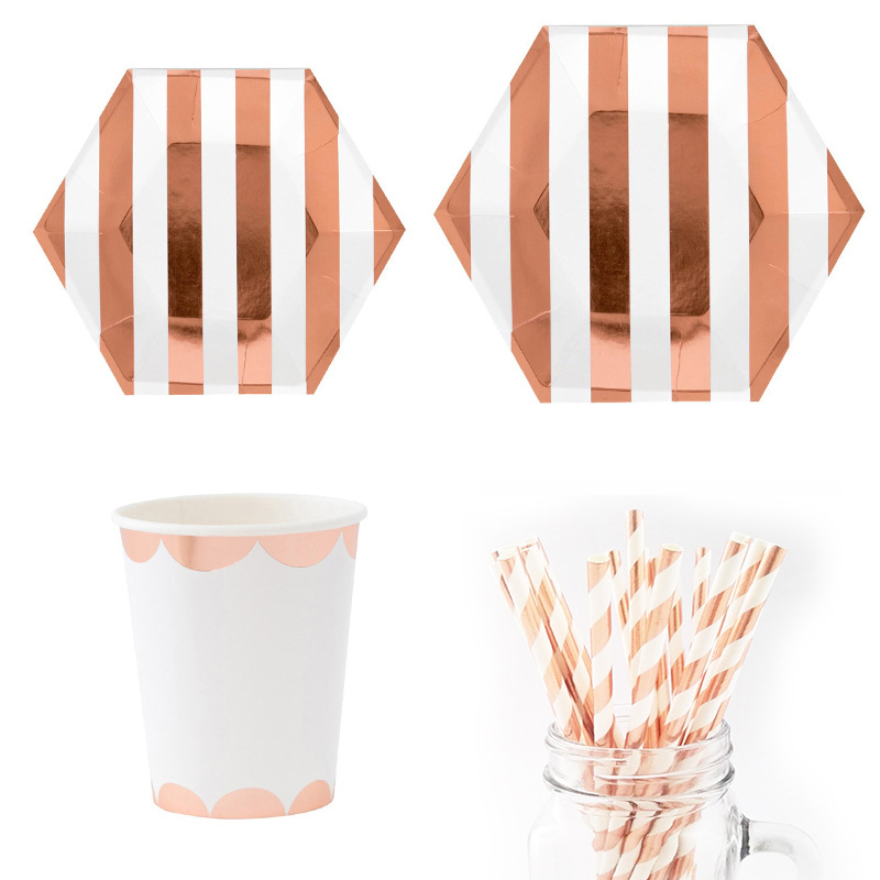 Color: 1: 8 sets of 4 hot-stamping rose gold striped paper plates,