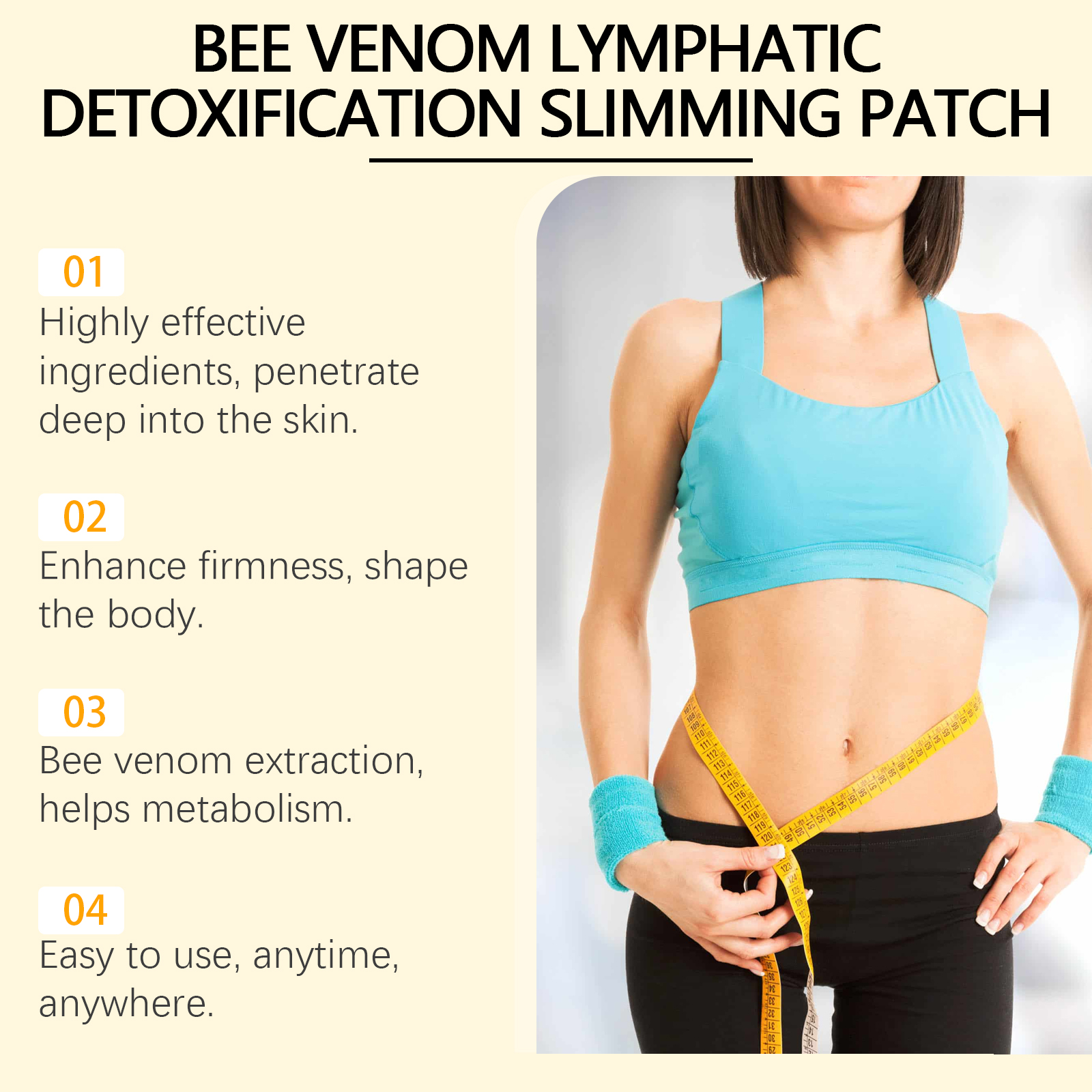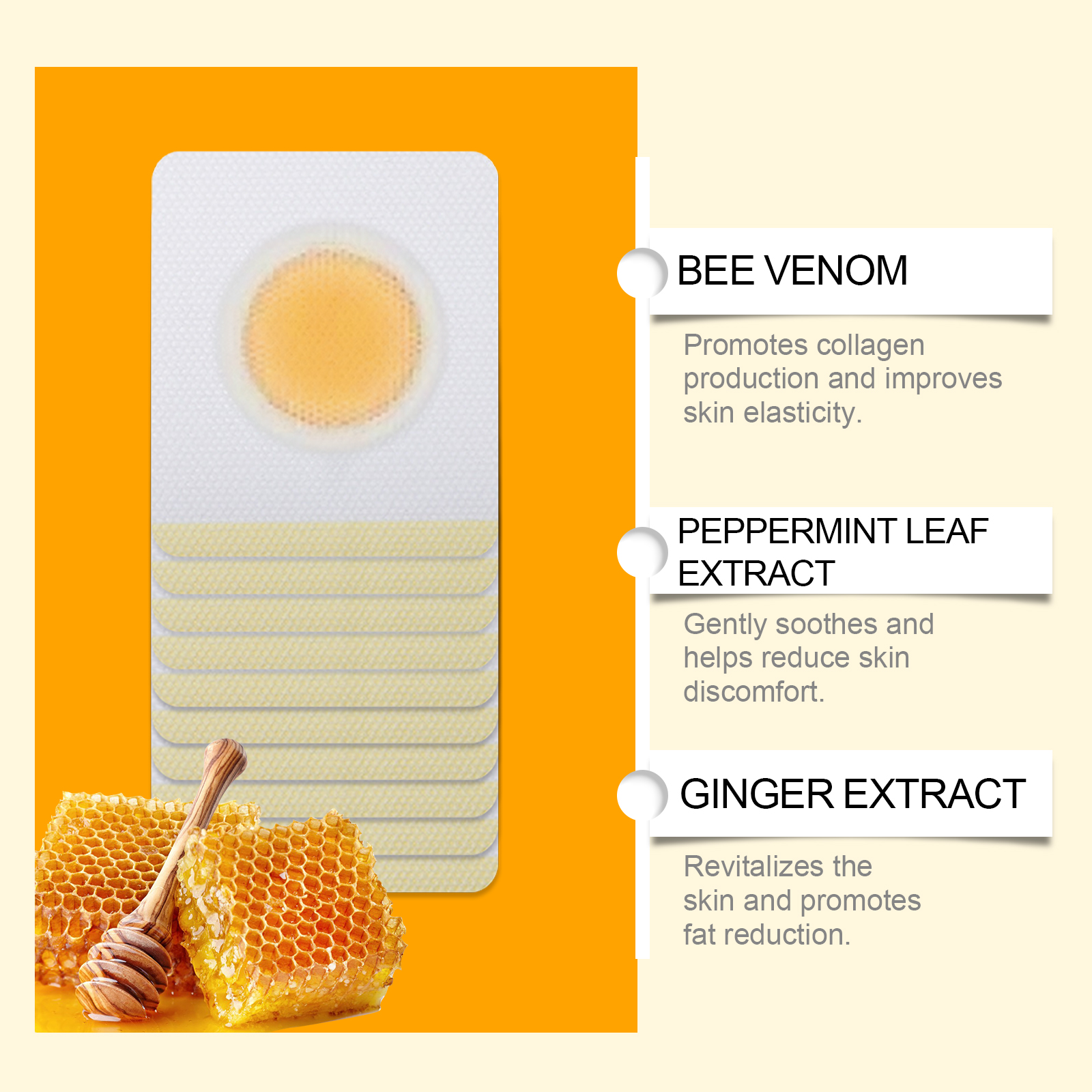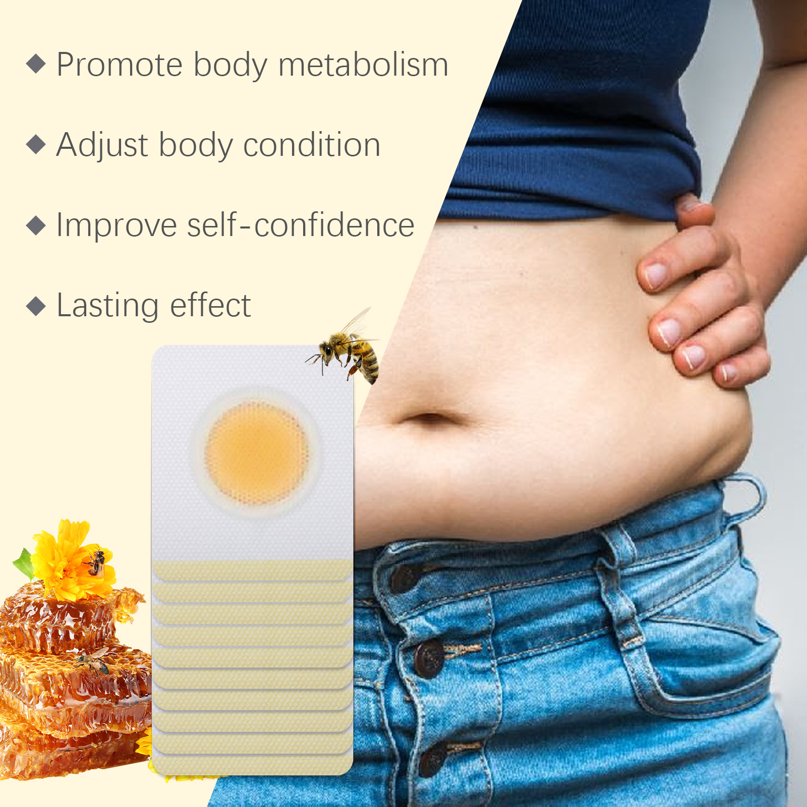 Our bee venom body patch is carefully formulated with bee venom, milk thistle extract and ginger extract. Specifically designed to effectively accelerate the body's metabolism. The visible effect enhances user confidence and reduces the uncomfortable design caused by bad living habits. The usage method is extremely convenient: 1. Clean the abdomen and keep it dry. 2. Remove the patch, apply it to the abdomen, and gently press to ensure adhesion. 3. Wait for 3 to 4 hours and then remove the patch. And it can continuously release technology to ensure long-term effects. It is portable and suitable for business trips.
