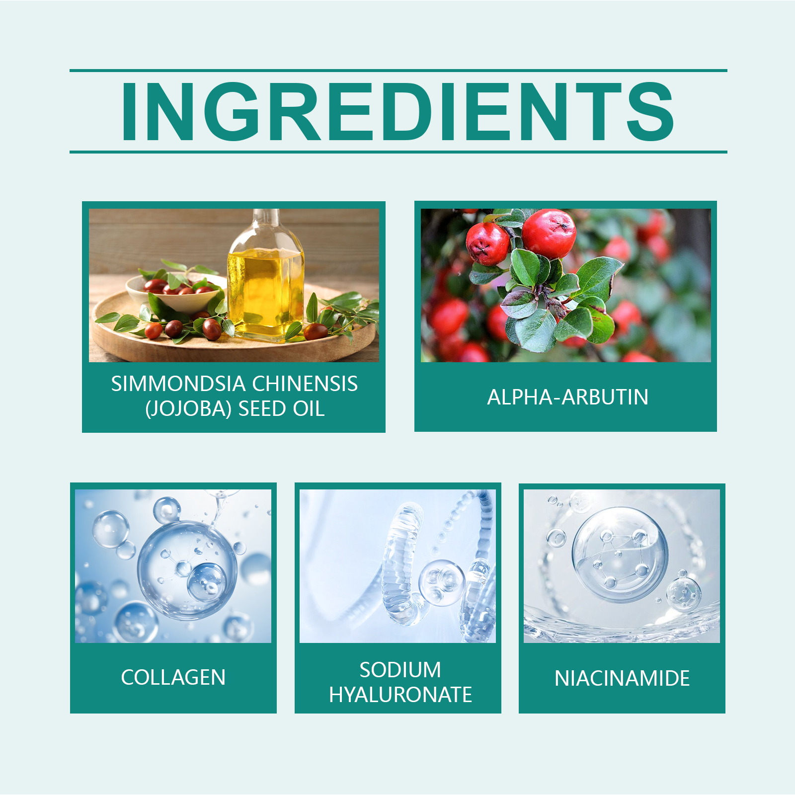 Our moisturizing cream contains Jojoba seed oil, collagen, and sodium hyaluronate. It traps moisture, keeping skin moist and elastic. Its application method is simple: 1. Clean facial skin and keep it dry. 2. Apply proper amount of the cream to your face evenly. 3. Gently massage in a circular motion with your fingertips until it is completely absorbed. Effectively lighten the stain, even the skin tone. Collagen deeply nourishes and helps reduce fine lines and wrinkles.
