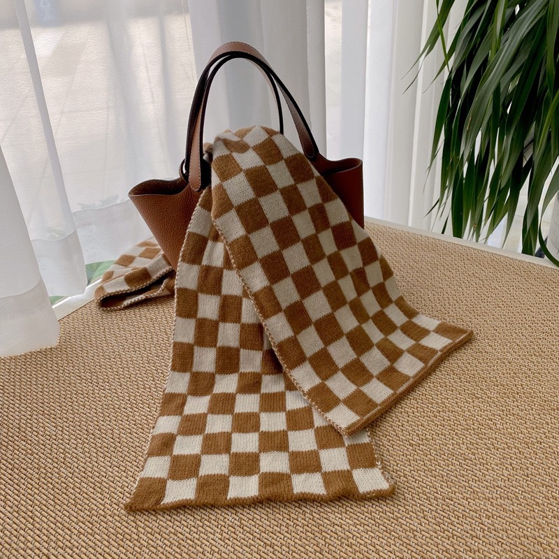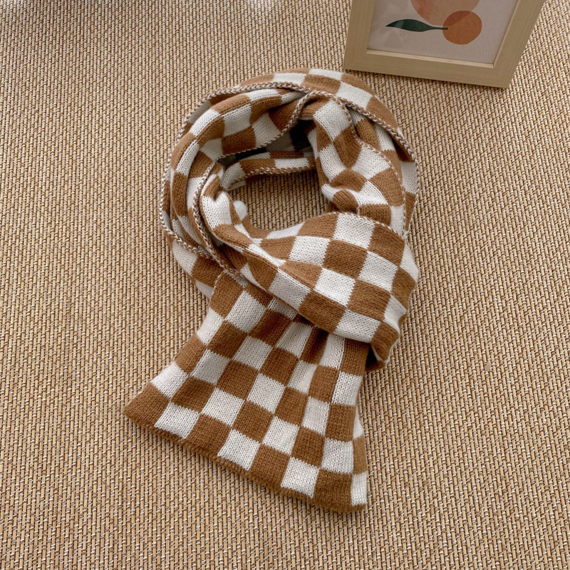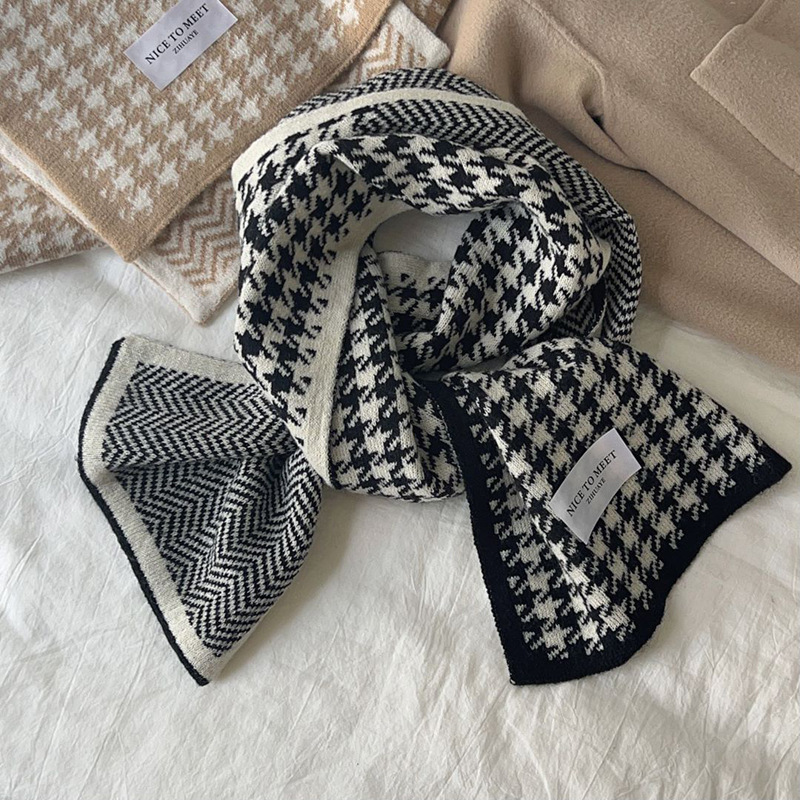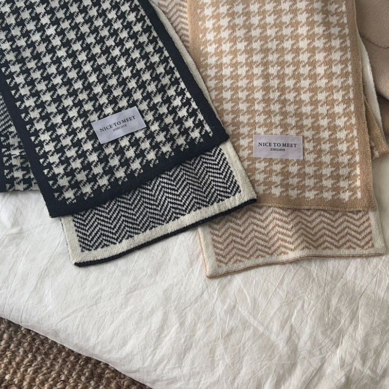 Houndstooth And Wave Pattern Print Scarf Women's Winter Korean Style Fashion Versatile Knitted Double-sided Warm Woolen Scarf