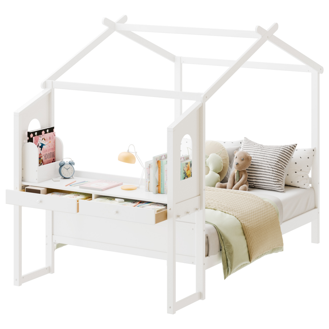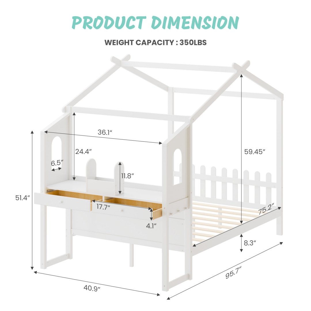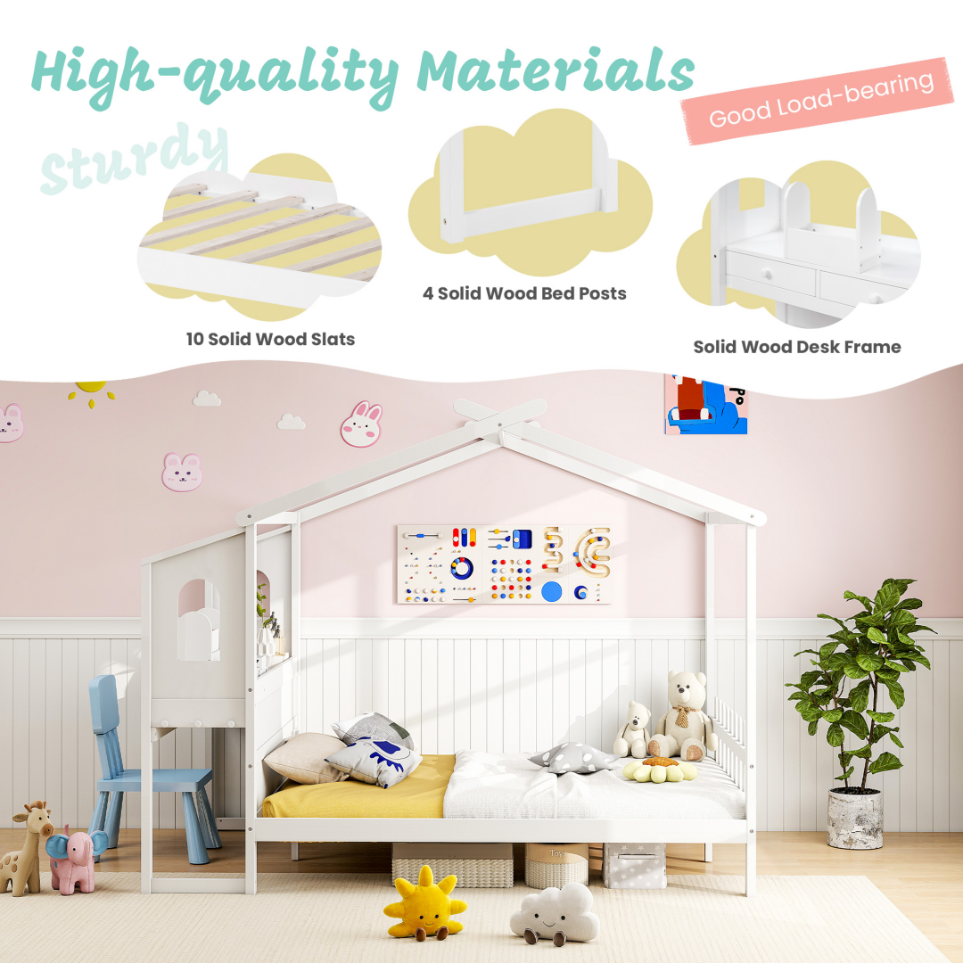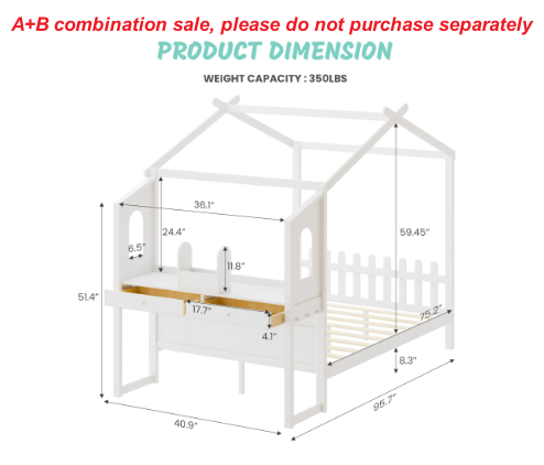 House Bed With Desk, Wooden Montessori Bed Frame For Kids With House Roof, 2 Drawers, Loft Bed With Fence-A-B Combo Sale, Please Do Not Purchase Individually
