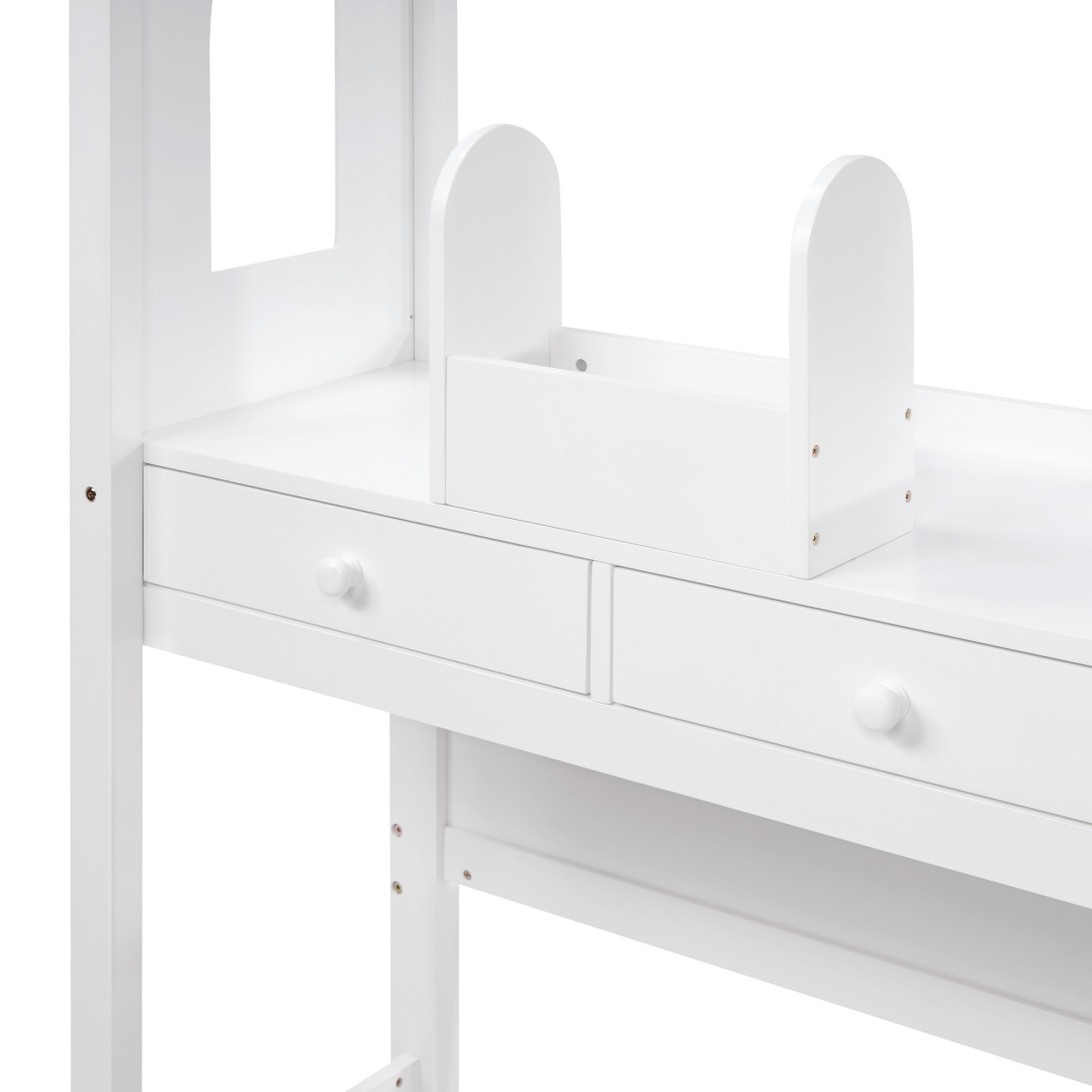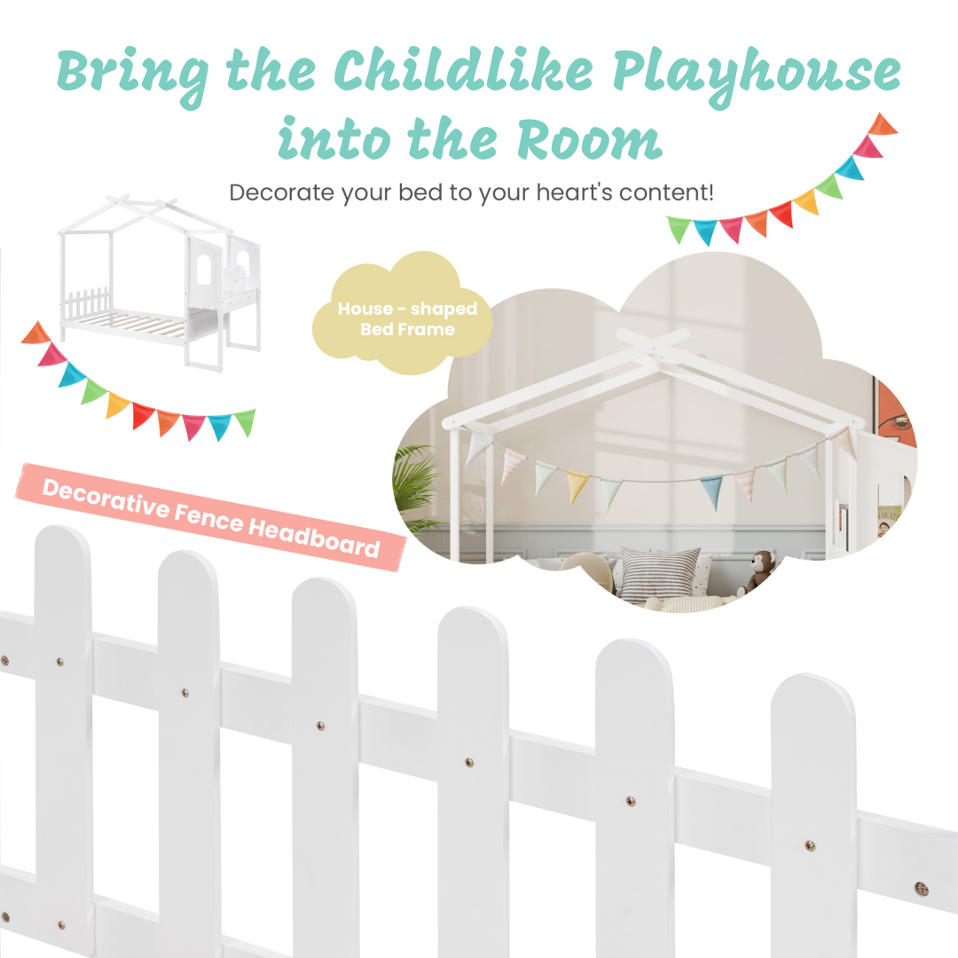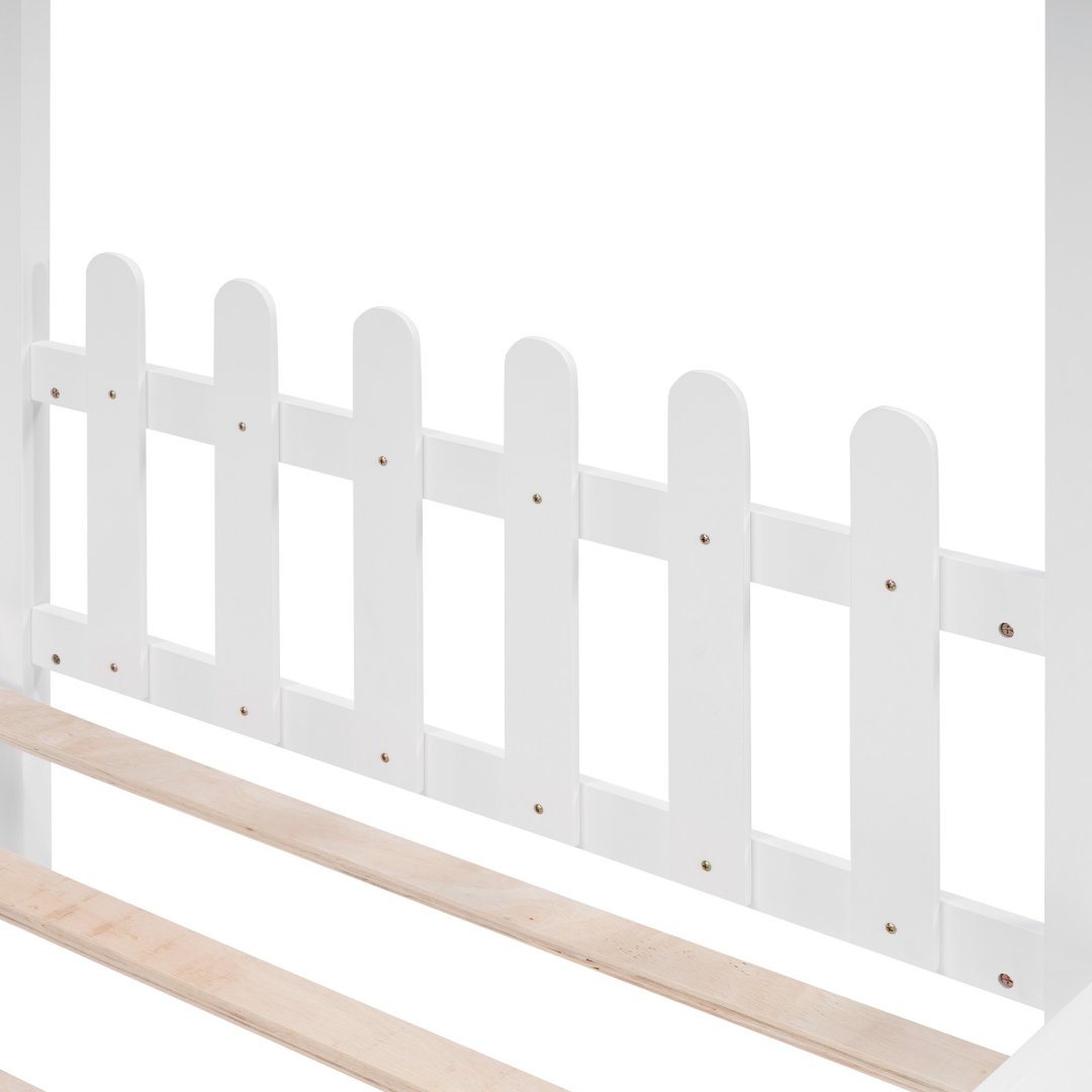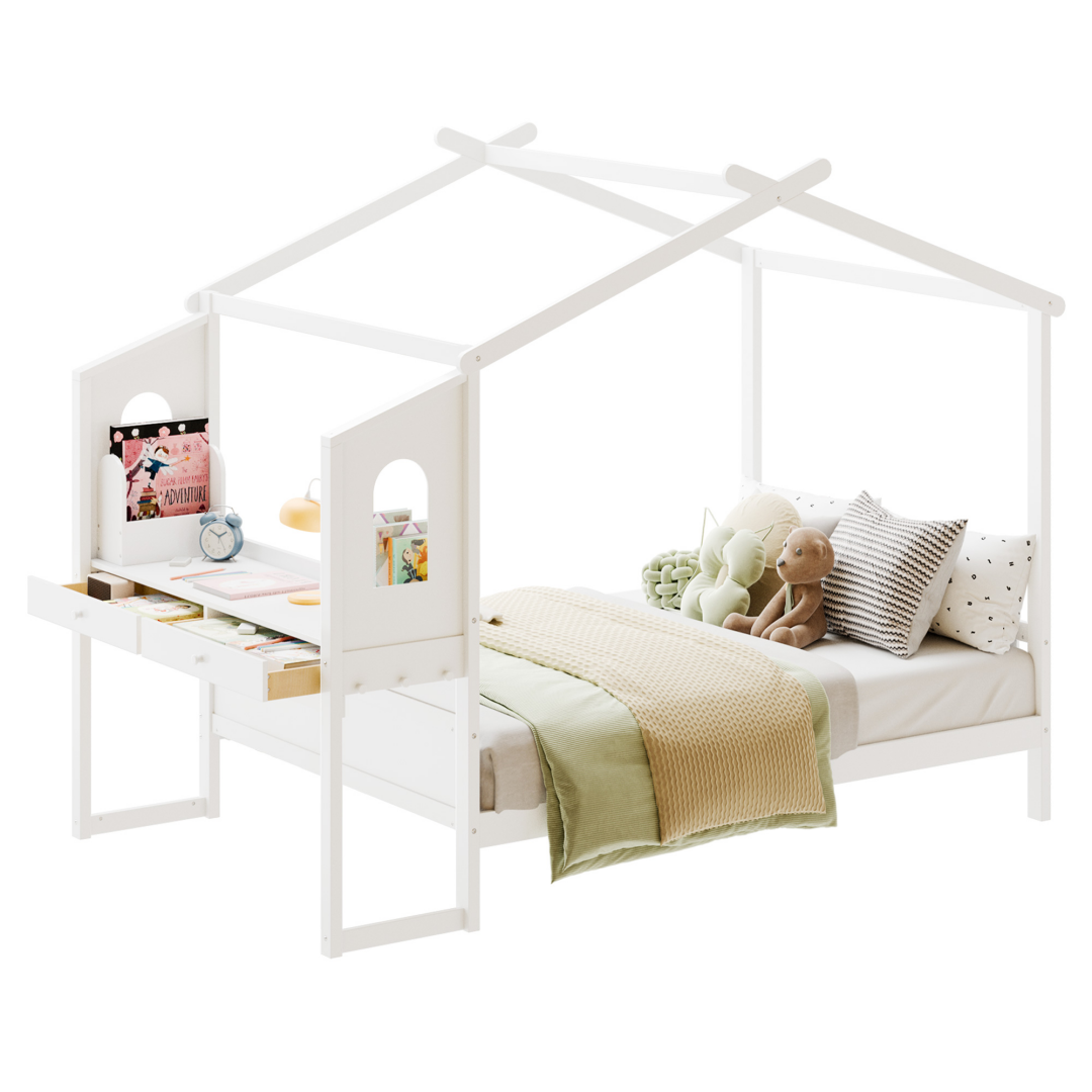 House Bed With Desk, Wooden Montessori Bed Frame For Kids With House Roof, 2 Drawers, Loft Bed With Fence-A-B Combo Sale, Please Do Not Purchase Individually