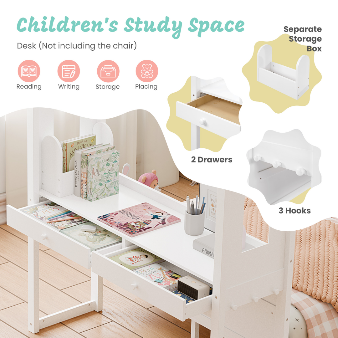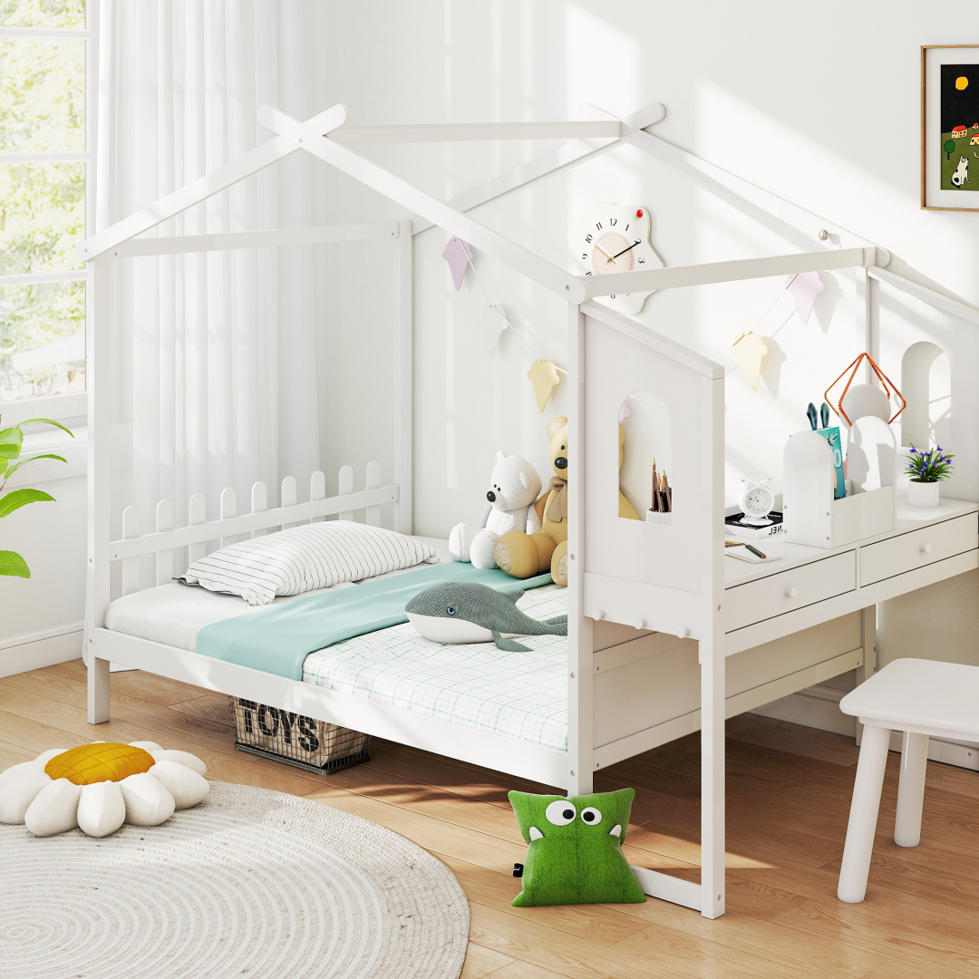 • [Space-Saving All-in-One Design] This innovative loft bed and house bed combines a sleeping area, study desk, and storage in one compact unit. It solves layout challenges in small rooms, freeing up valuable floor space for play. Unlike a basic toddler floor bed, this kids bed is a complete functional zone for sleep, study, and fun.