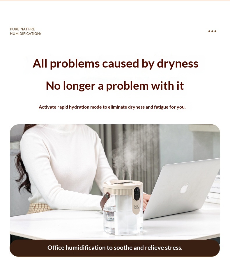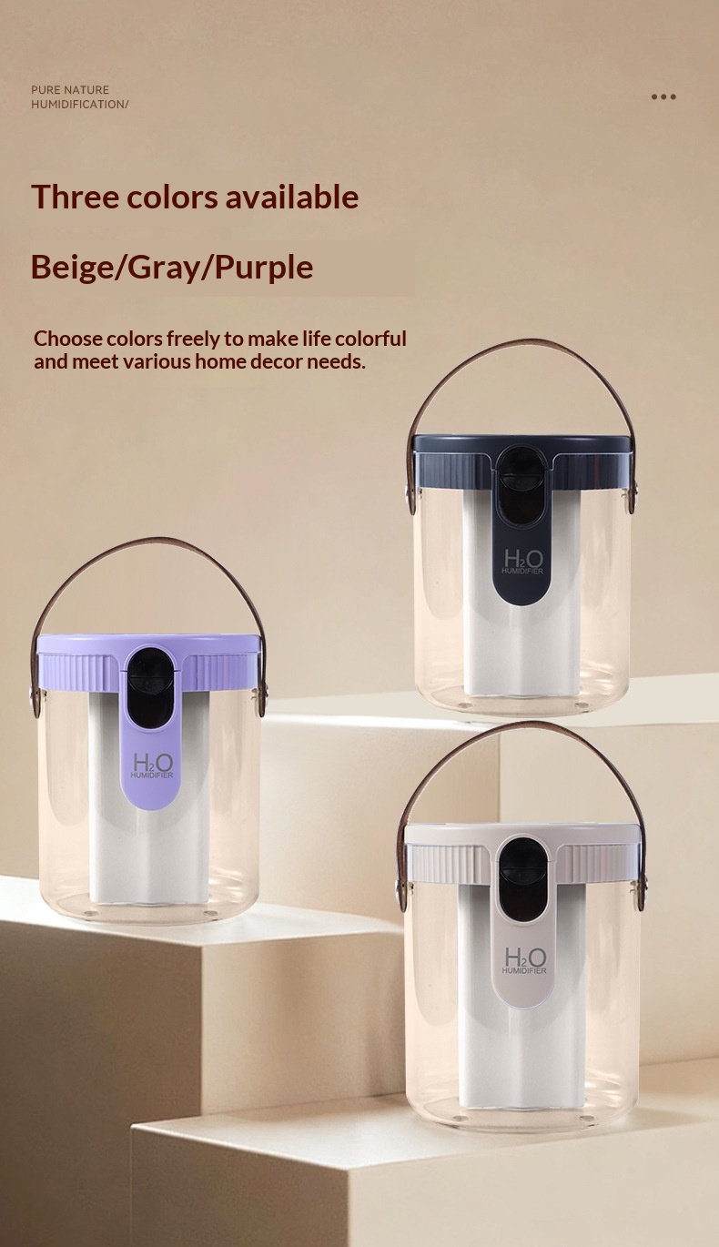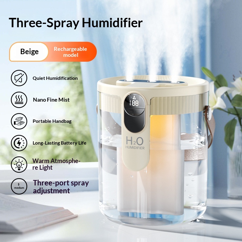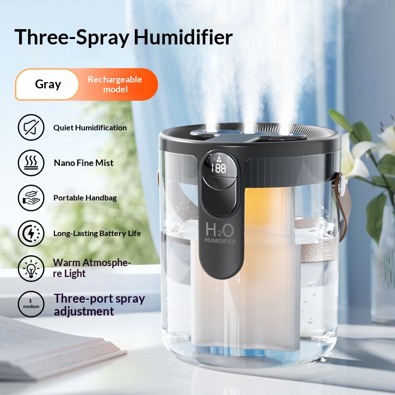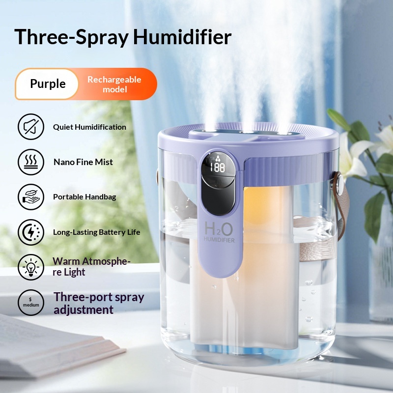 Colors: [Triple-Spray Humidifier, Purple, Rechargeable] — Quiet humidification, nano-level fine mist, portable design, ultra-long battery life, HO technology, warm ambient lighting, three-speed adjustable mist outlet; [Triple-Spray Humidifier, Gray, Rechargeable] — Quiet humidification, nano-level fine mist, portable design, ultra-long battery life, HO technology, warm ambient lighting, three-speed adjustable mist outlet; [Triple-Spray Humidifier, Beige, Rechargeable] — Quiet humidification, nano-level fine mist, portable design, ultra-long battery life, HO technology, warm ambient lighting, three-speed adjustable mist outlet.