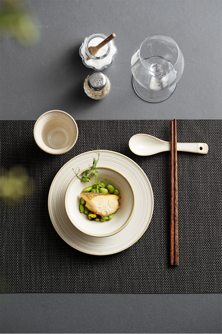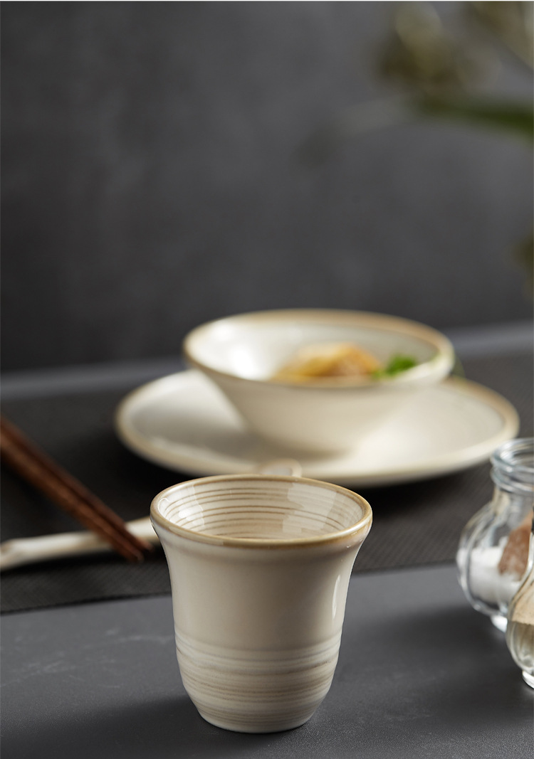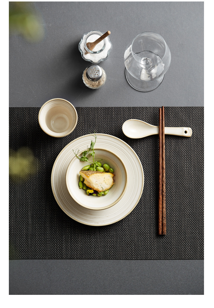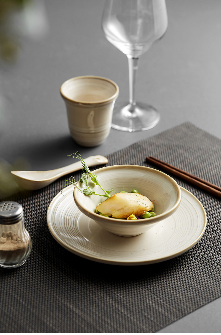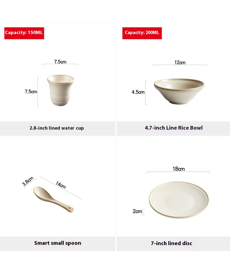 Color: line pattern Cup (White average glaze),4.75-inch line pattern Bowl (White average glaze),5.7-inch line pattern Bowl (White average glaze),7-inch thread pattern disc (White average glaze), flexible spoon (White average glaze)