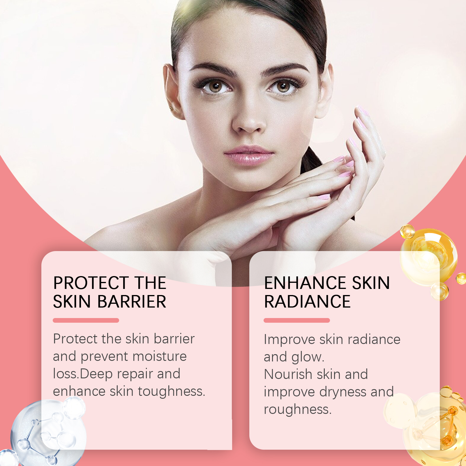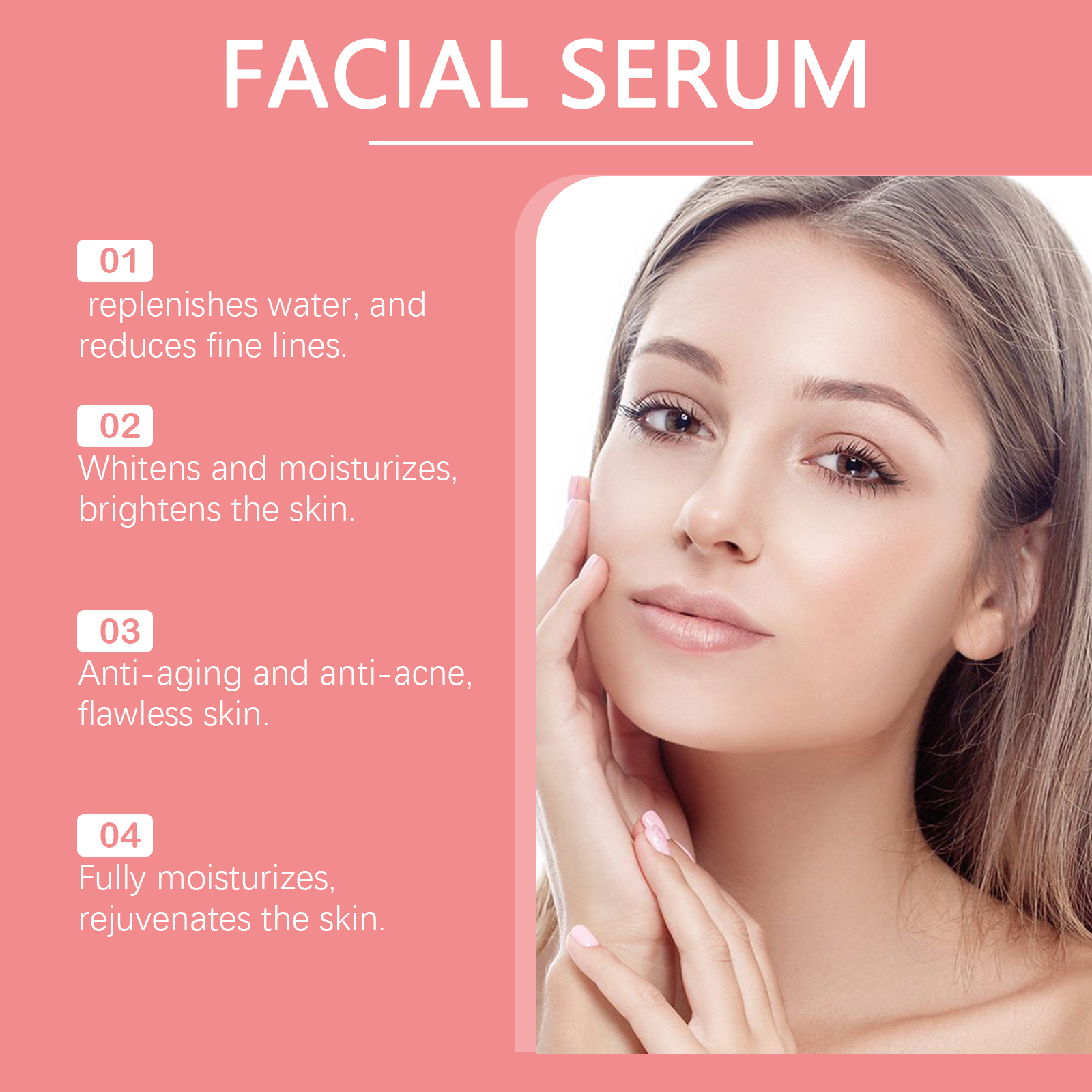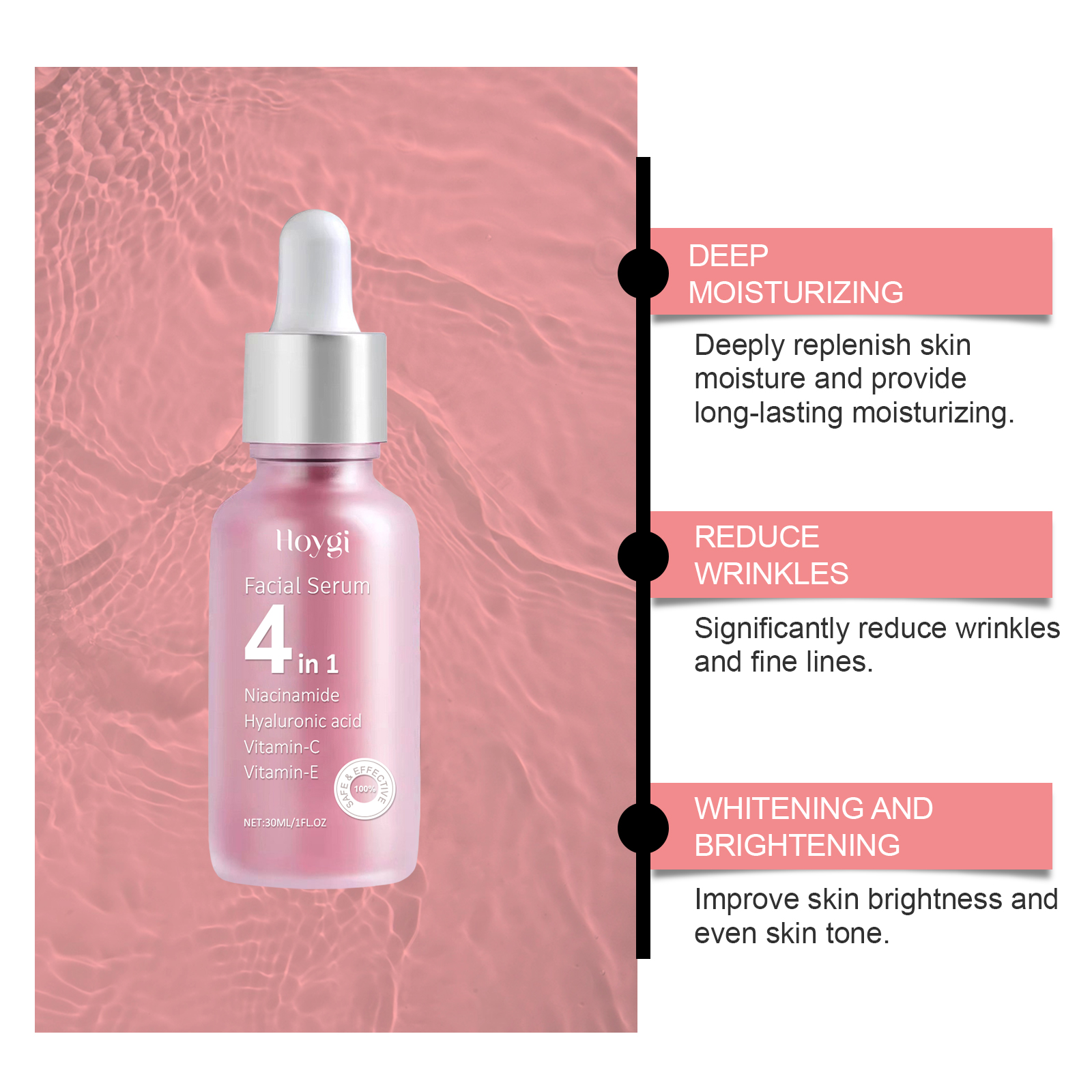 Our 4-in-1 moisturizing essence is carefully formulated with hyaluronic acid and vitamin E. Designed specifically for deep repair and enhancing skin resilience. The usage method is extremely convenient: 1. Wash your face and keep it dry. 2. Apply an appropriate amount of this product evenly to the face. 3. Gently massage the eye sockets to promote absorption. And it can provide comprehensive care, suitable for all skin types. Easy to use and absorbed quickly. The texture is light and not greasy.