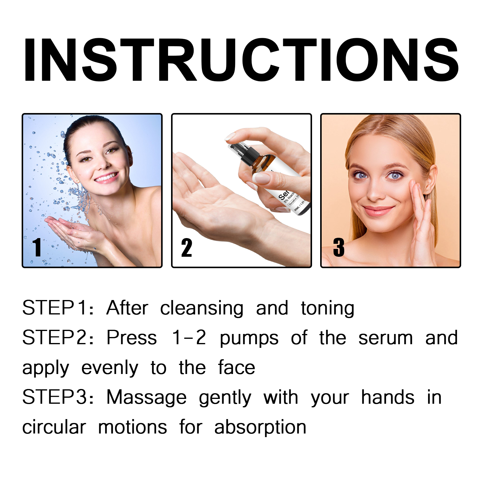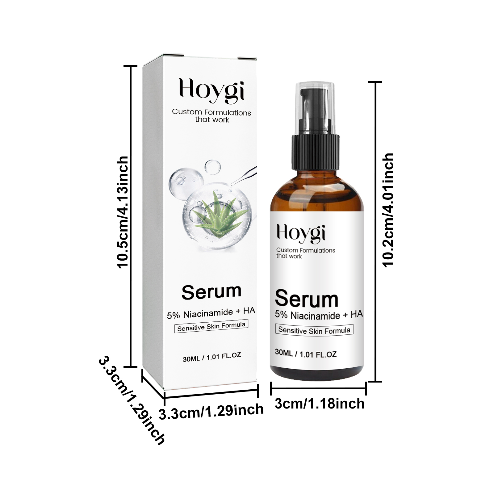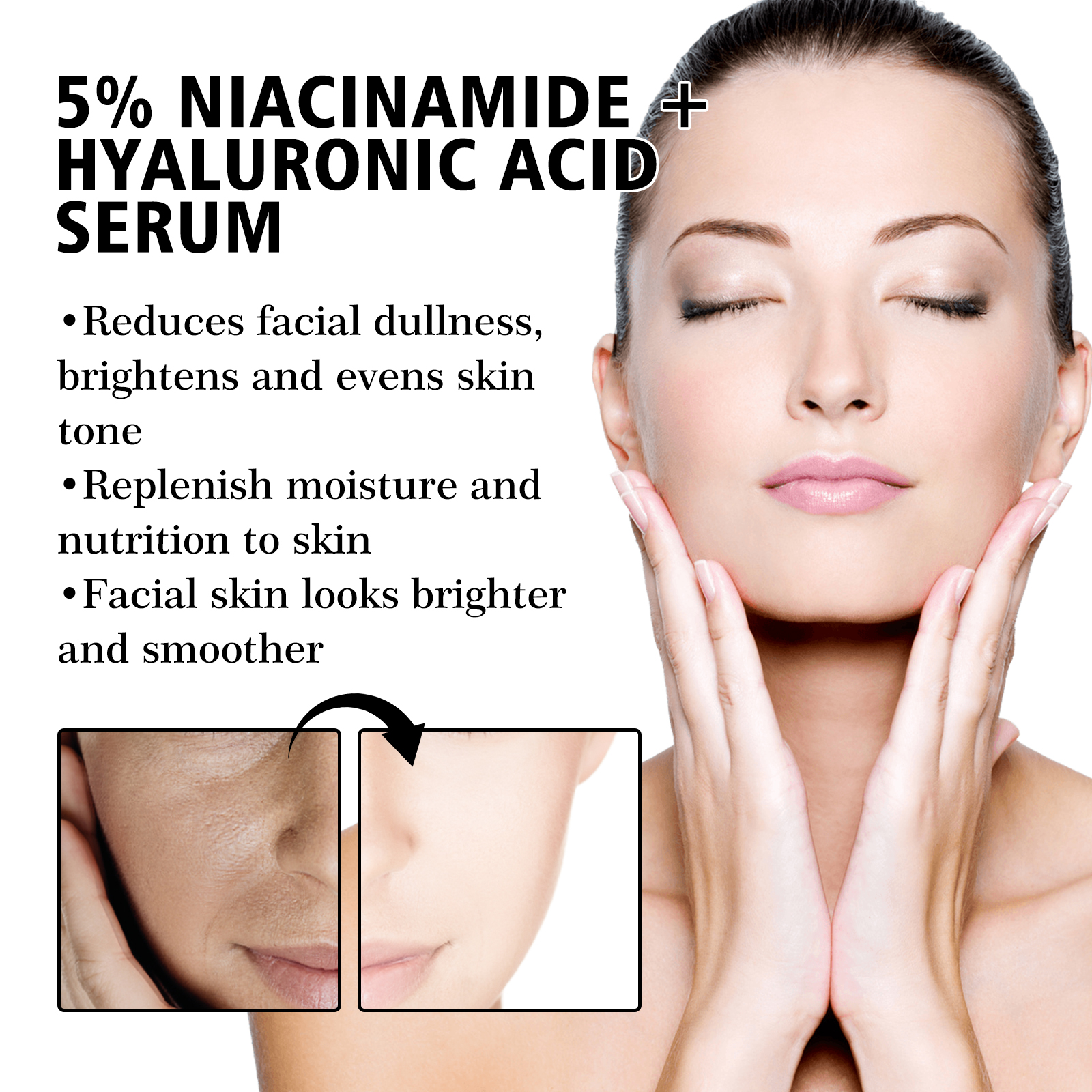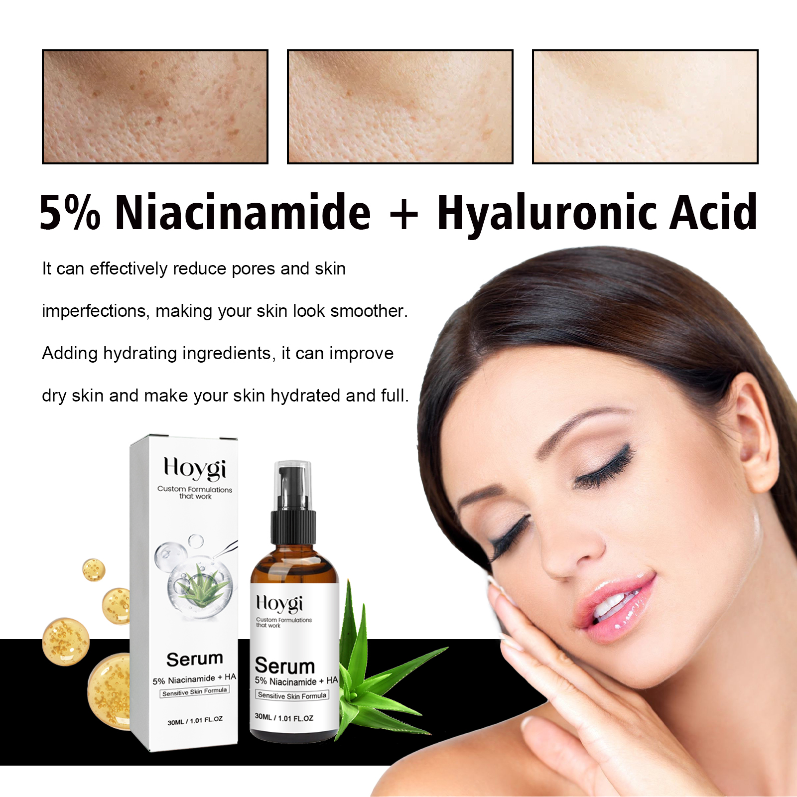 Our 5% Niacinamide HA Serum contains nicotinamide, glycerin, and hyaluronic acid. It can effectively reduce pores and skin imperfections, making your skin look smoother. Add moisturizing ingredients to improve dry skin and leave skin hydrated and plump. Its use method is very simple: after cleansing and toning, press 1-2 pumps of serum, evenly apply on the face, gently massage with your hand until absorbed. It can effectively reduce facial blemishes, refine pores, improve dry skin, and replenish moisture for skin.