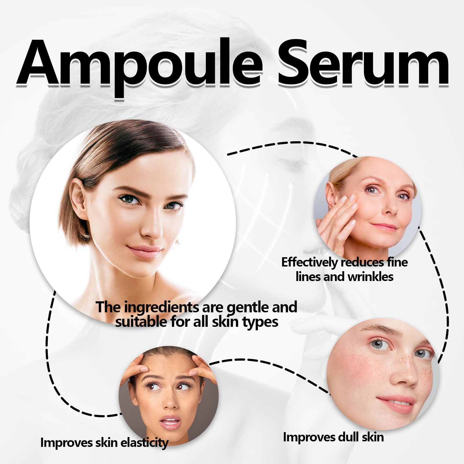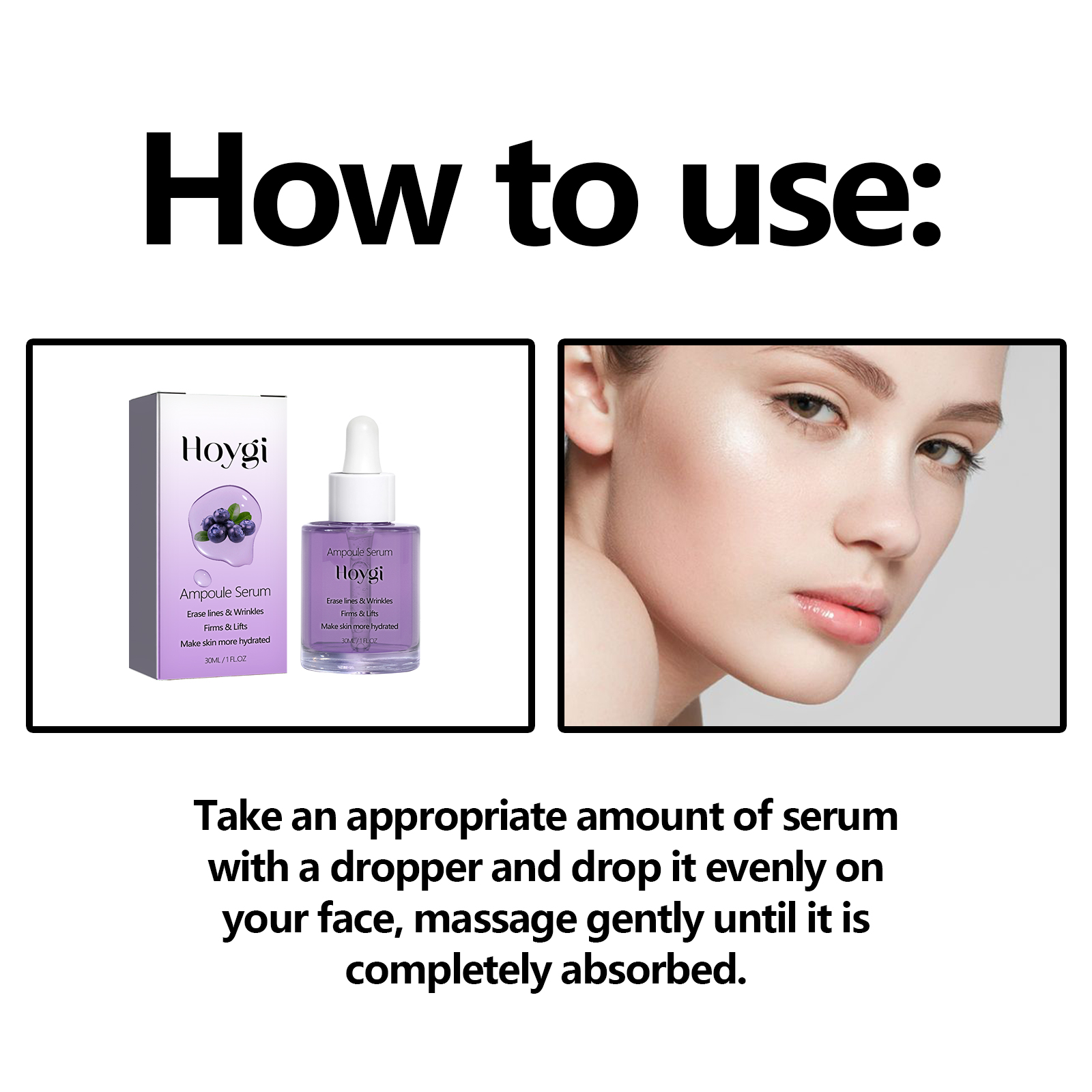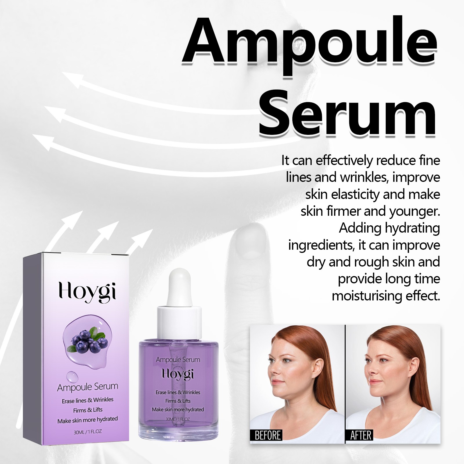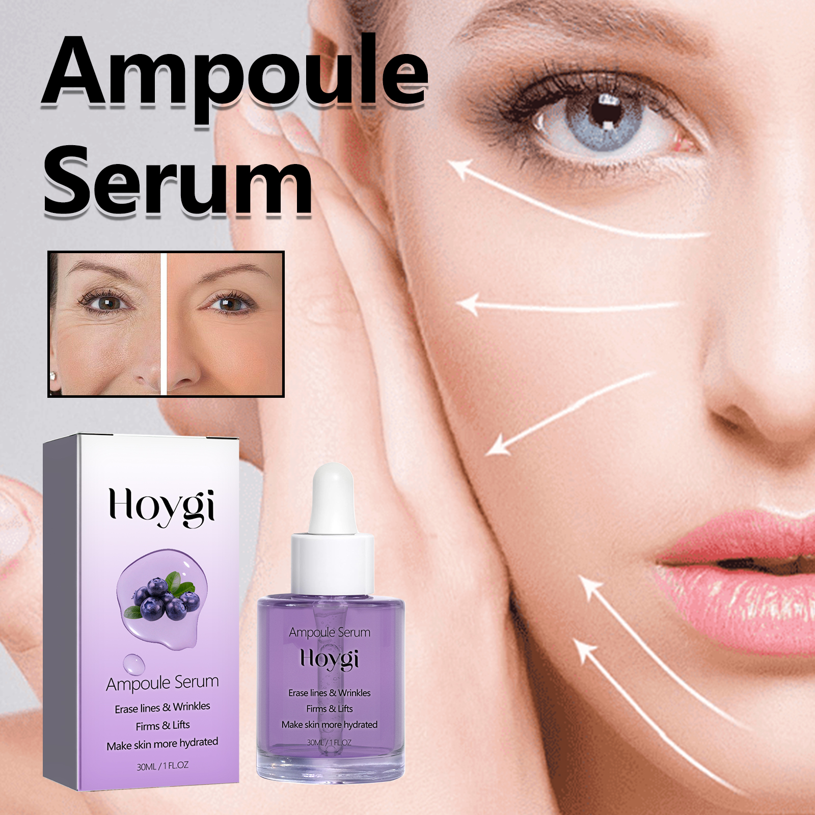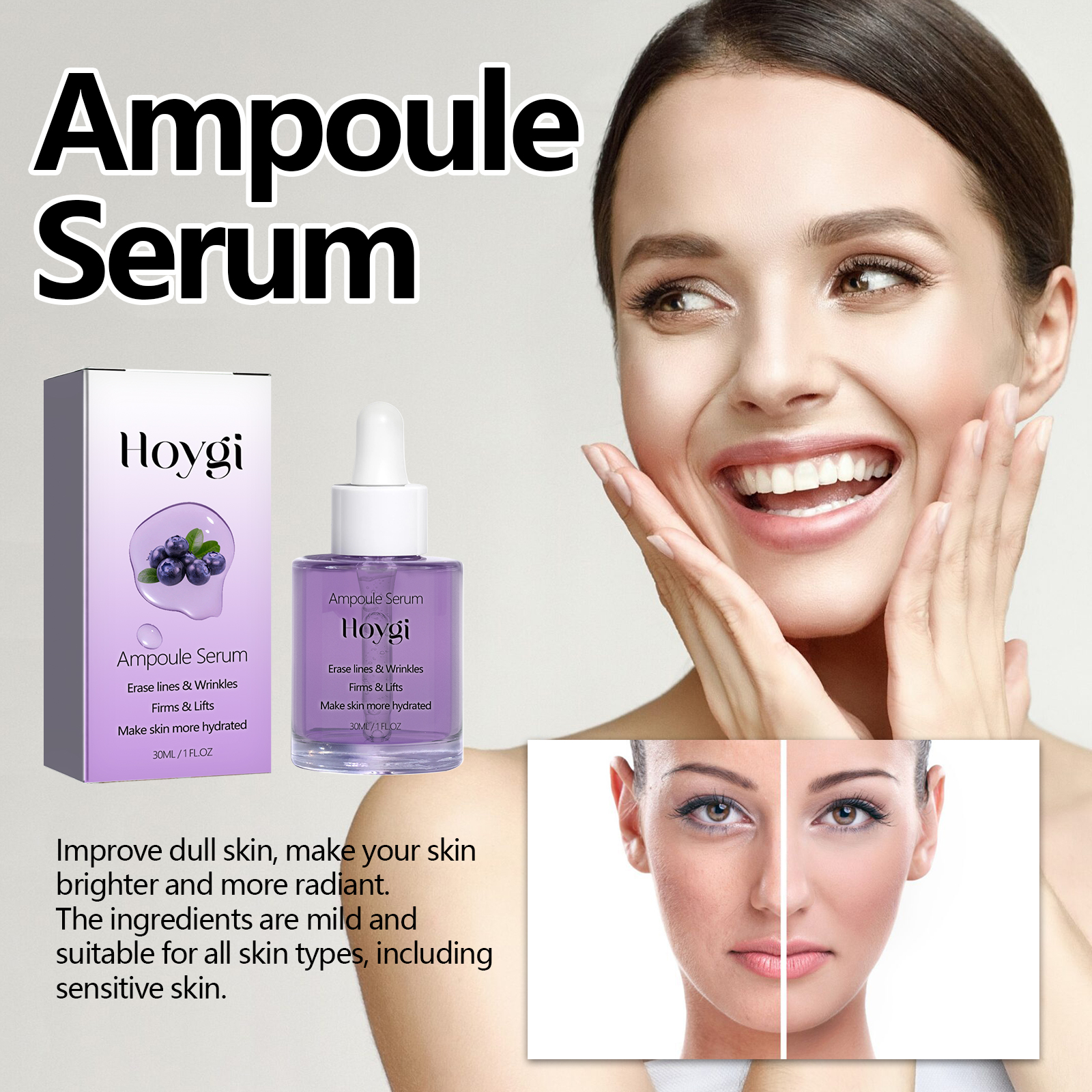 Our Ampoule Serum contains glycerin, vitamin C, and hyaluronic acid. It can effectively reduce fine lines and wrinkles, improve skin elasticity, make skin firmer and more youthful, improve dry and rough skin, and provide long-term moisturizing effect. Its use method is very simple: use a dropper to take an appropriate amount of essence evenly drop on the face, gently massage until completely absorbed. Can improve dull skin, make your skin brighter, more shiny, gentle ingredients, suitable for all skin types, including sensitive skin.
