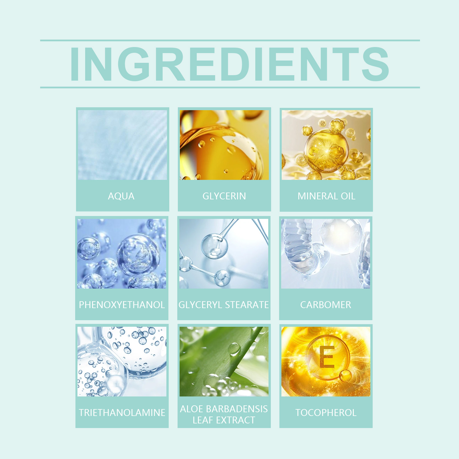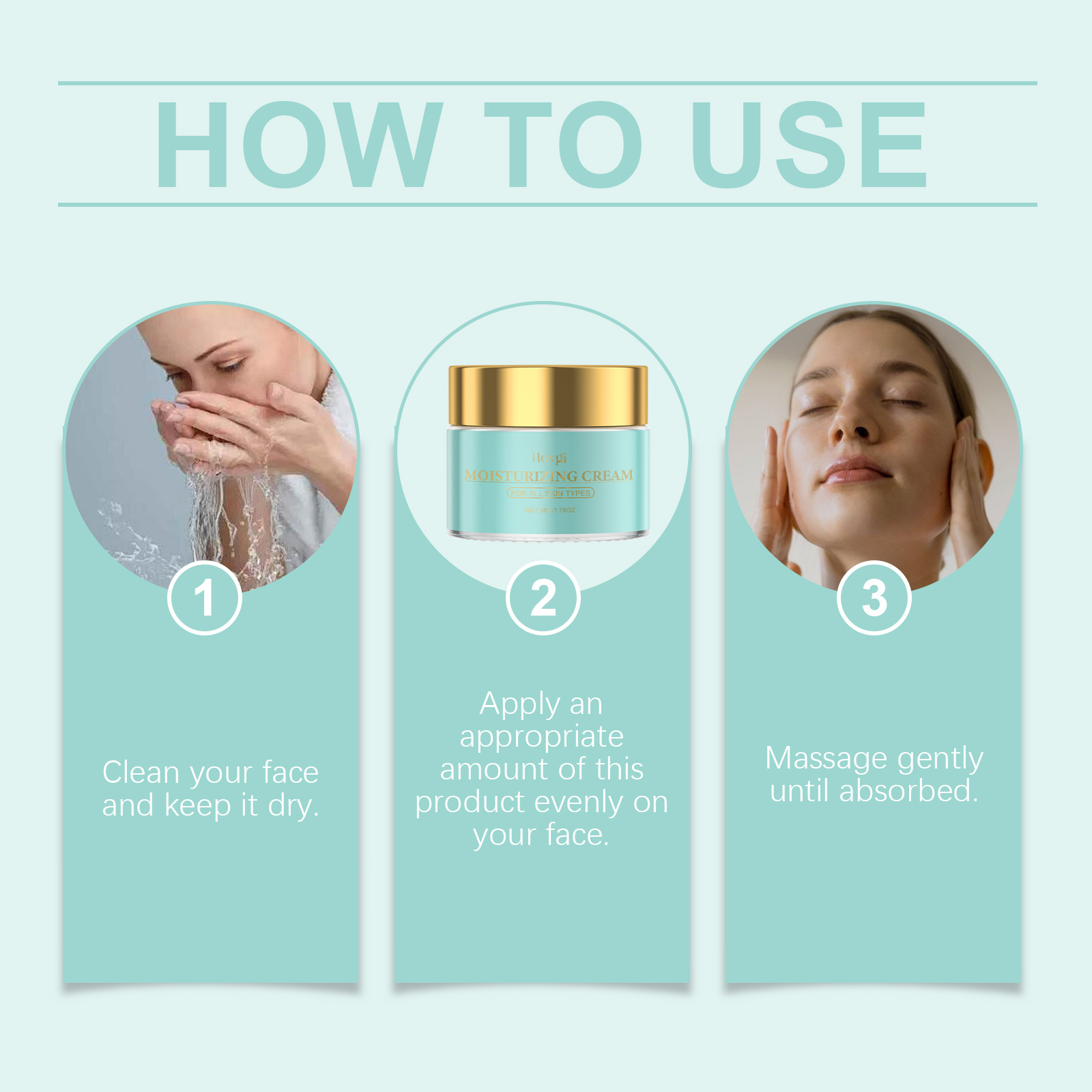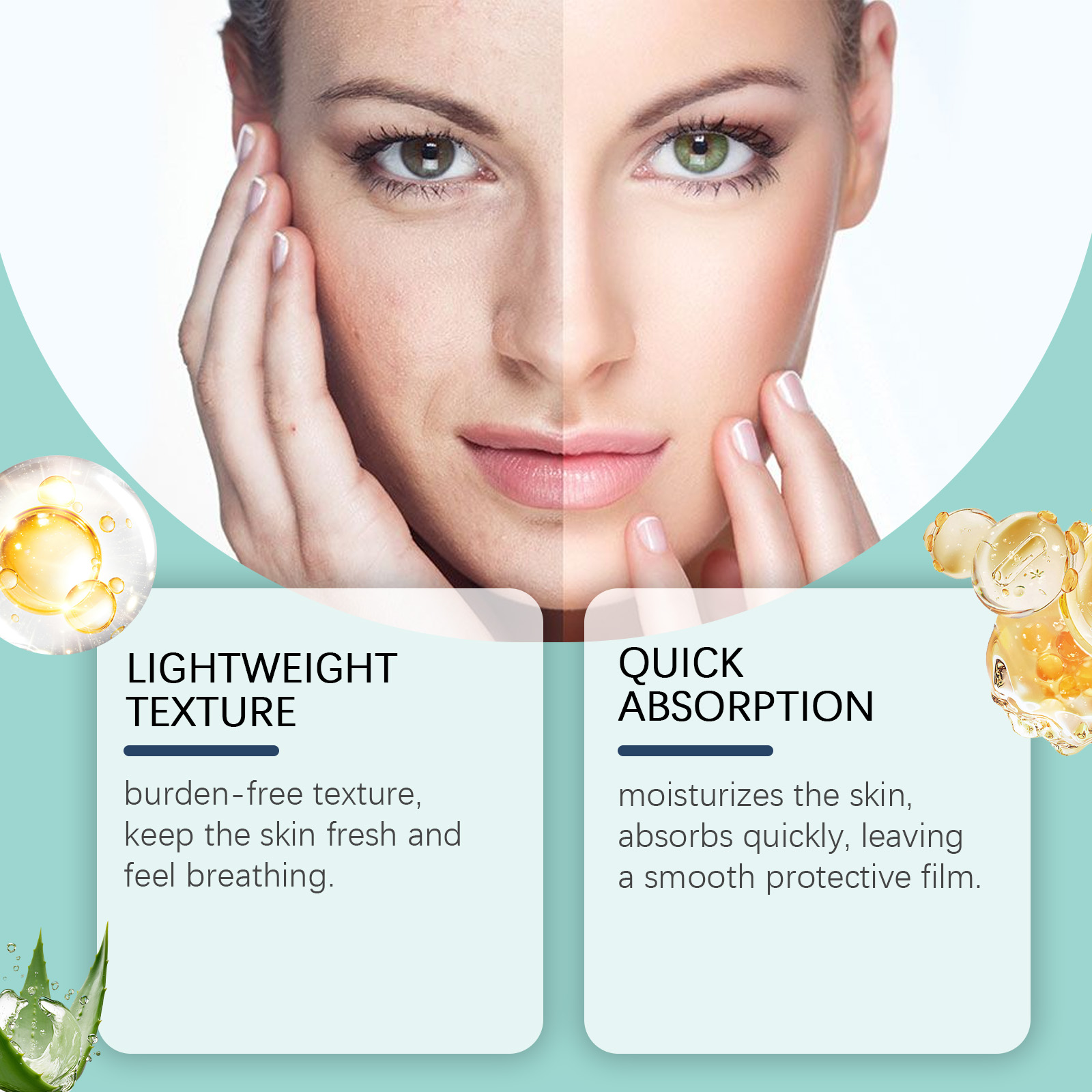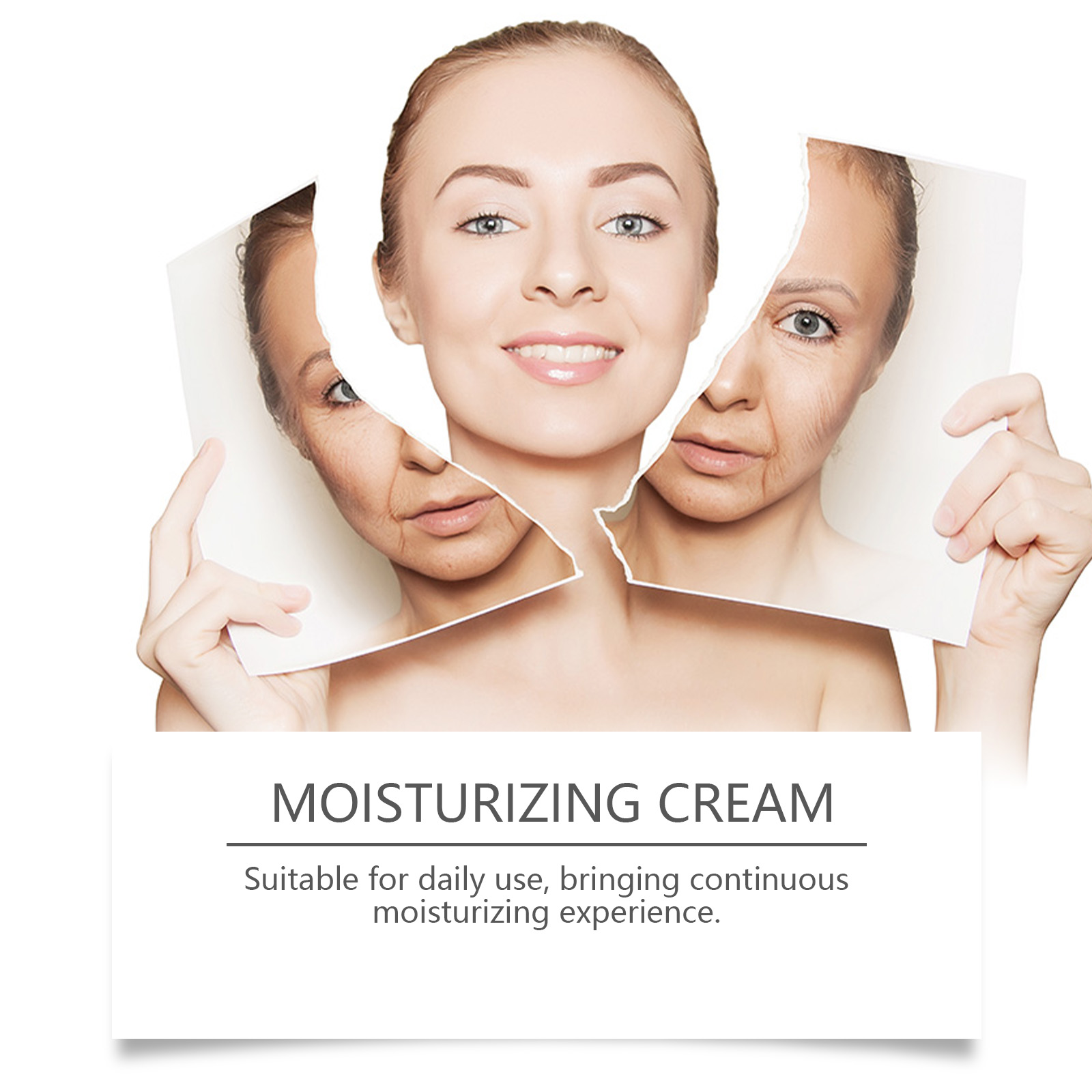 Our anti-aging facial moisturizer contains triethanolamine, aloe vera extract, Vitamin E (tocopherol). It keeps the skin fresh and breathing. The way to use it is simple: clean your face and keep it dry. Apply appropriate amount to face evenly. Massage gently until absorbed. And can moisturize the skin, absorb quickly, leaving a smooth protective film.