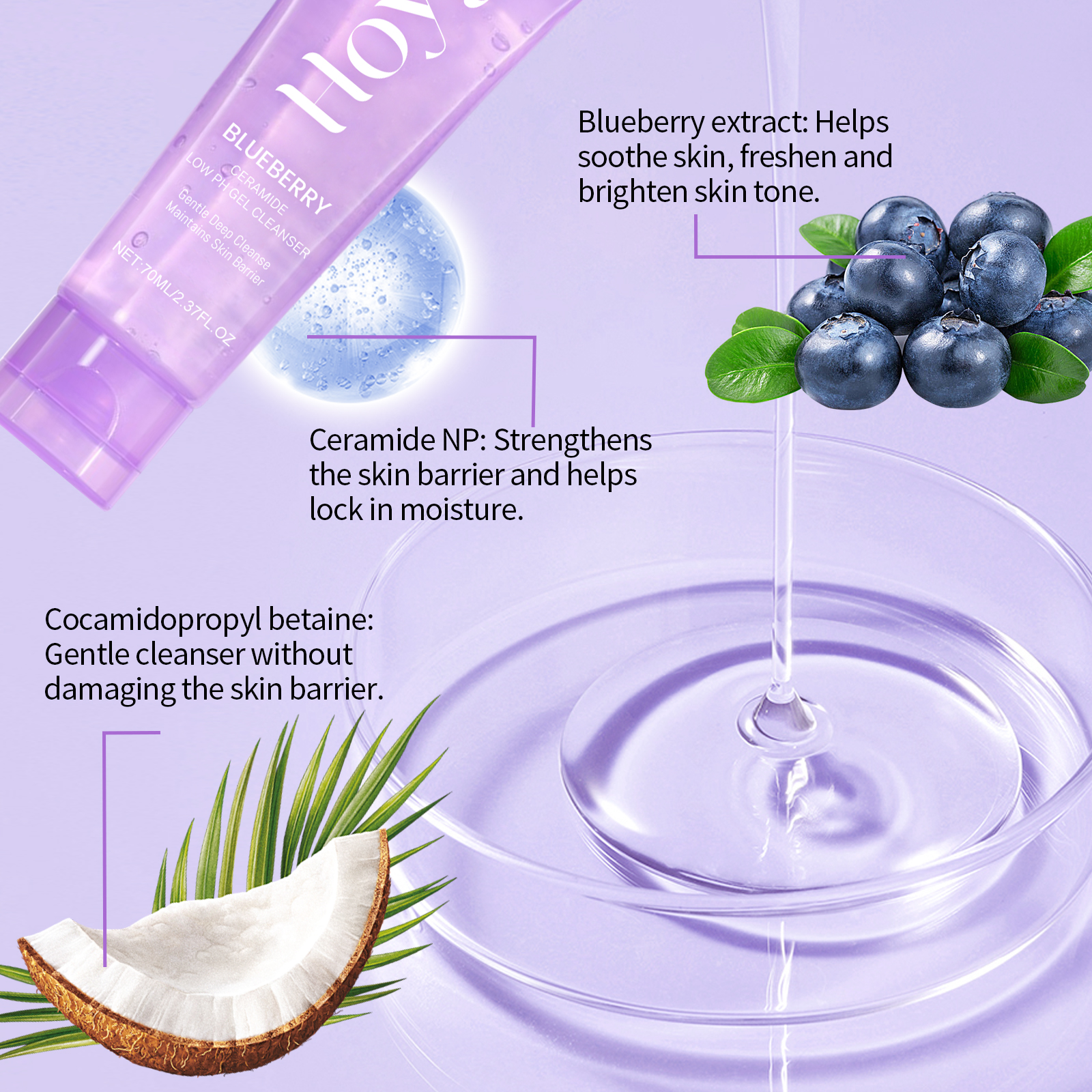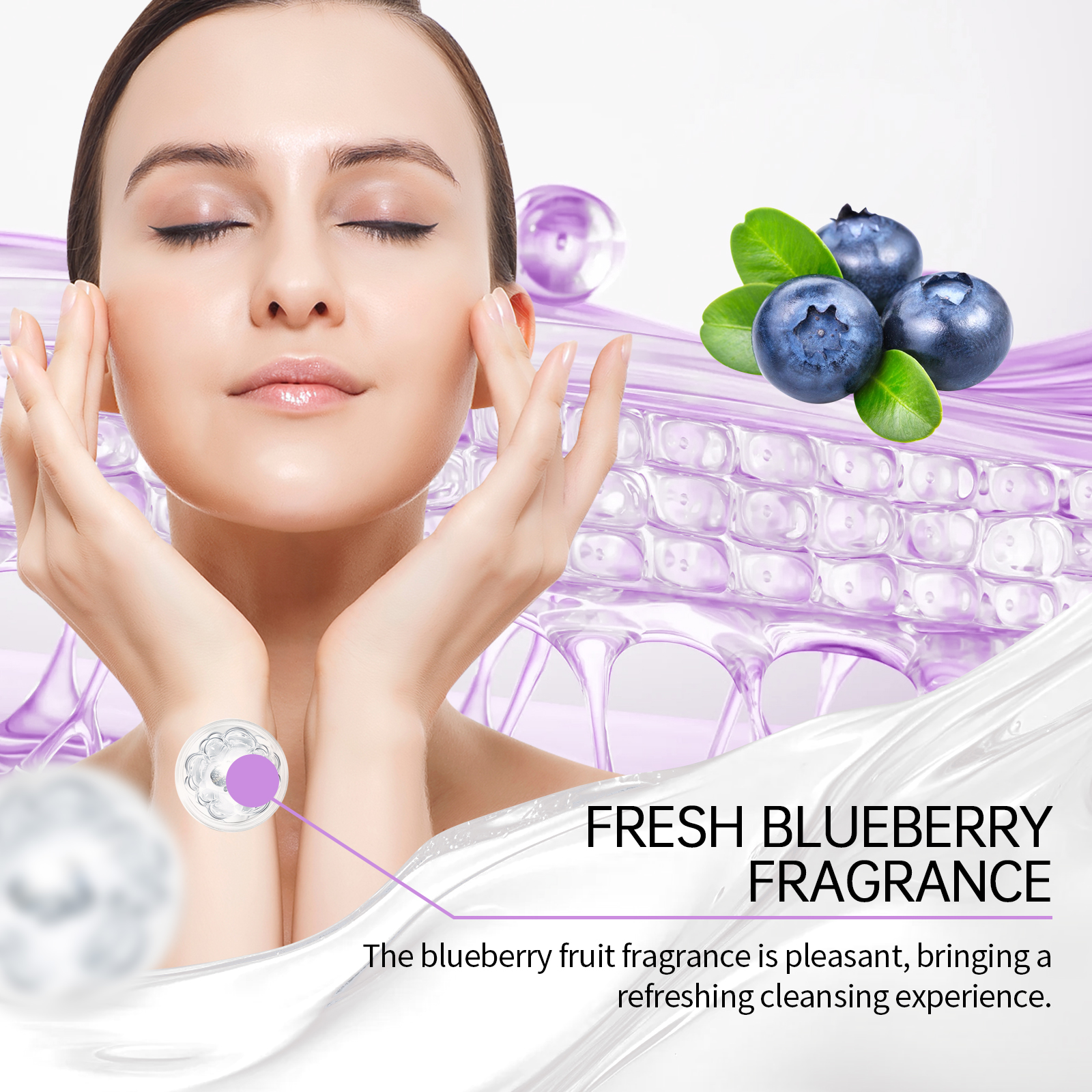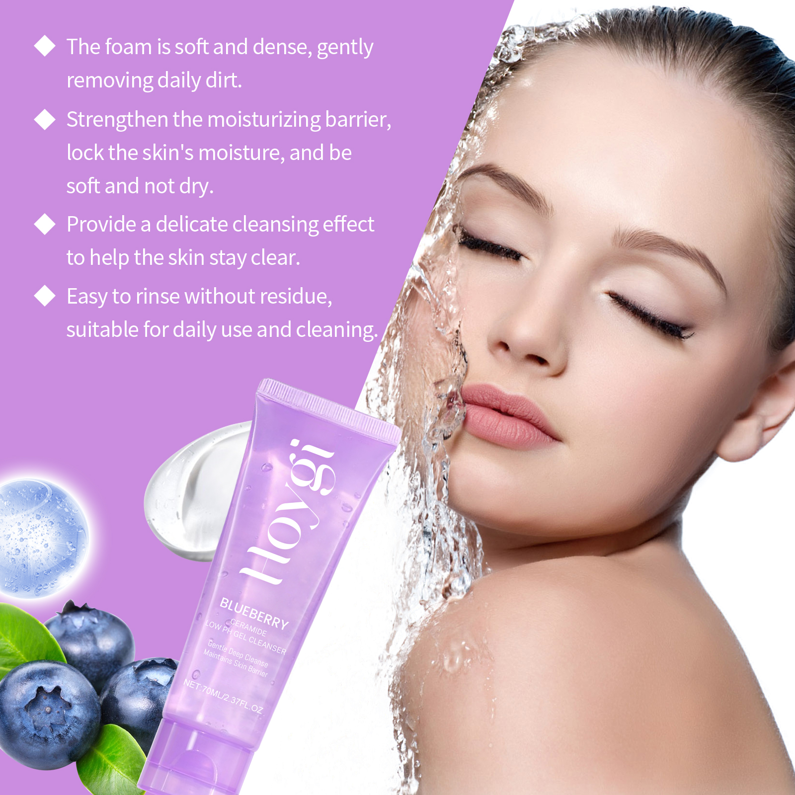 Our blueberry flavored ceramide cleansing gel contains blueberry extract, ceramide NP. It gently removes dirt and keeps skin fresh and smooth. It contains cellulose, which helps the skin retain moisture for a long time. Its use method is very simple: first thoroughly wet the face with warm water, squeeze appropriate amount of this product into the palm evenly spread on the face, gently massage 1-2 minutes. Rinsing the residue with warm water and cleansing gently helps to improve the dullness of the skin and makes it translucent.