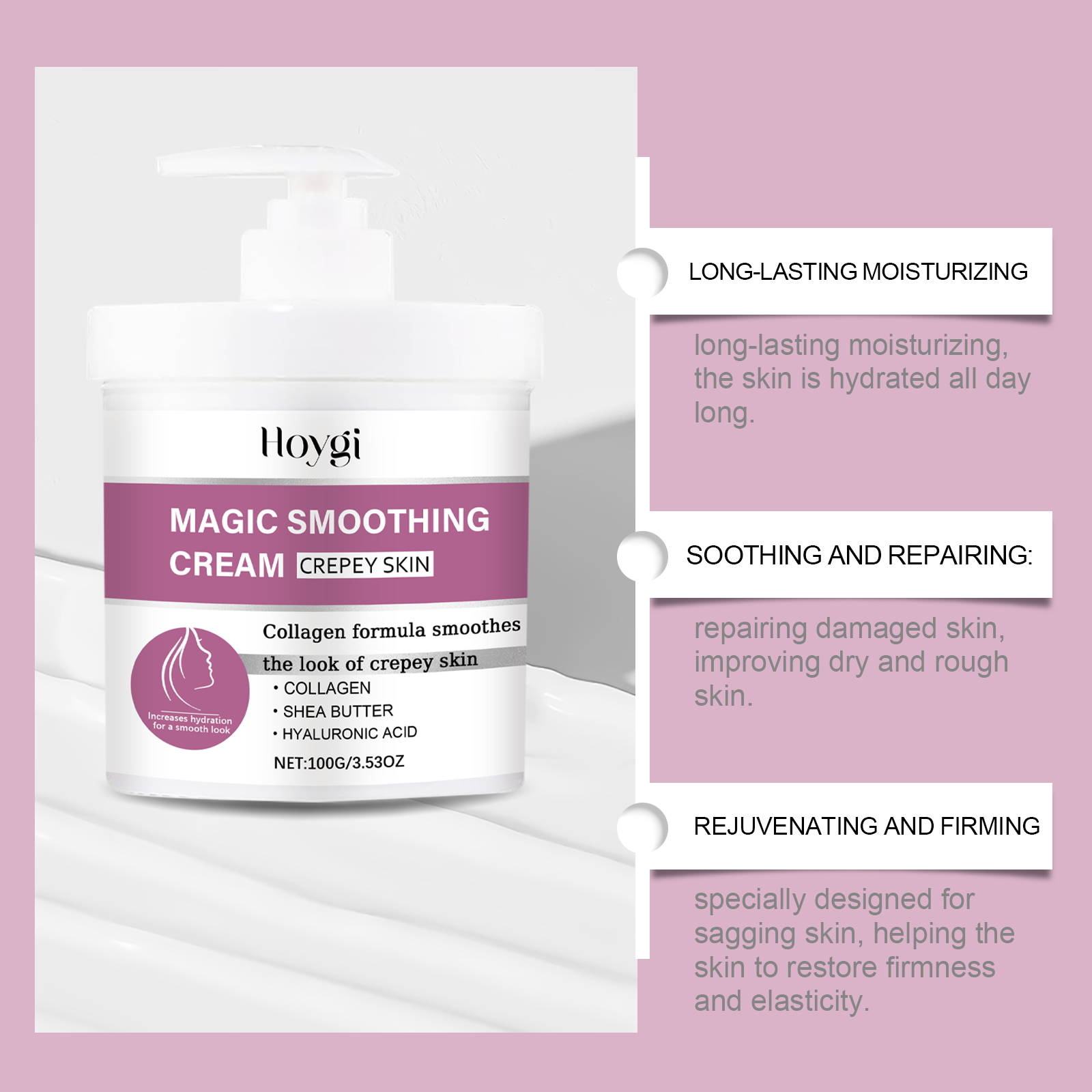 Our body moisturizing cream contains hyaluronic acid, aloe vera leaf extract. It can be specially designed for loose skin to help restore firmness and elasticity. Its application method is very simple: clean the skin, keep the skin dry, apply the appropriate amount of cream evenly on the body skin, gently massage in a circular motion, so that it is completely absorbed. It can also help to lock in moisture for a long time, improve dry and rough problems and keep skin soft, smooth and elastic.