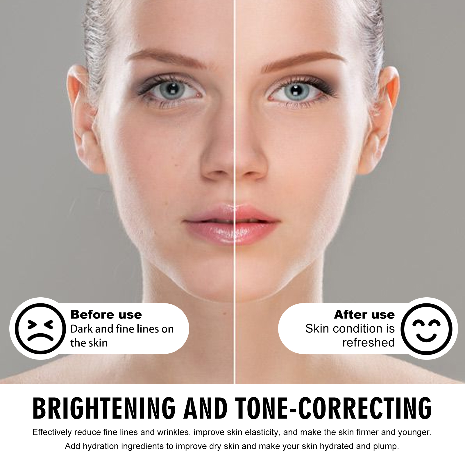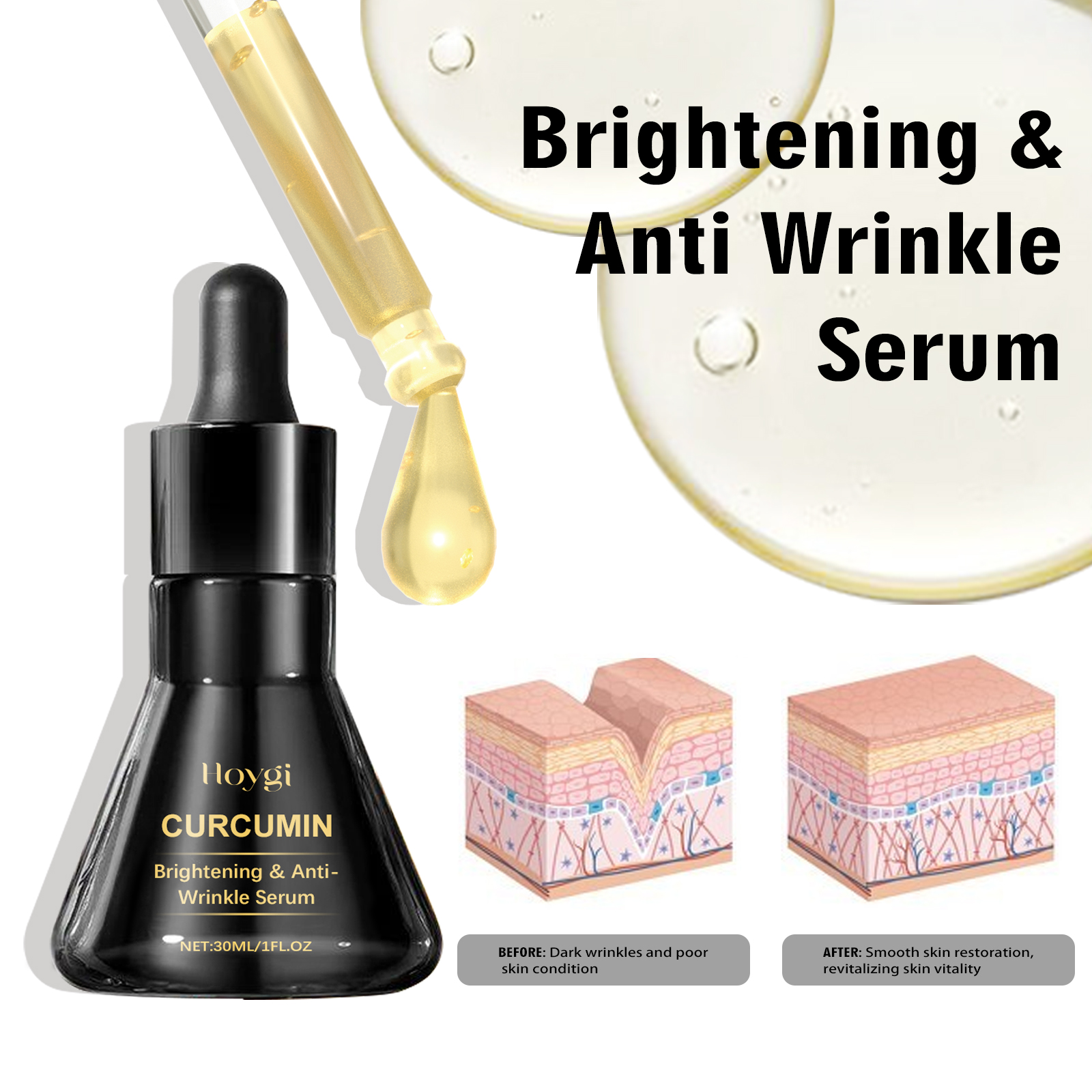 Our Brightening & Anti Wrinkle Serum contains curcumin, hyaluronic acid, and acetyl hexapeptide-8. It can effectively reduce fine lines and wrinkles, improve skin elasticity, and make skin firmer and younger, improve dry skin, and leave skin hydrated and plump. Its application method is very simple: use a dropper to take an appropriate amount of essence evenly drop on the face skin, gently massage until completely absorbed. It can effectively improve uneven skin tone, reduce dark spots, and create a glowing appearance.