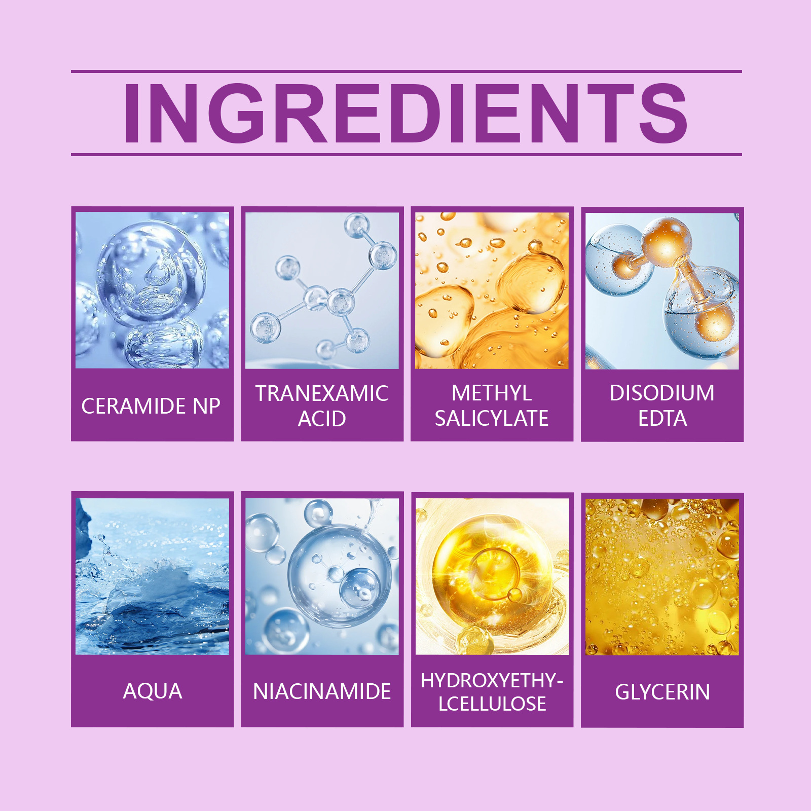 Product ingredients: Water, Glycerin, hydroxyethyl cellulose, Nicotinamide, Ceramide NP, Coagulation Acid, methyl salicylate