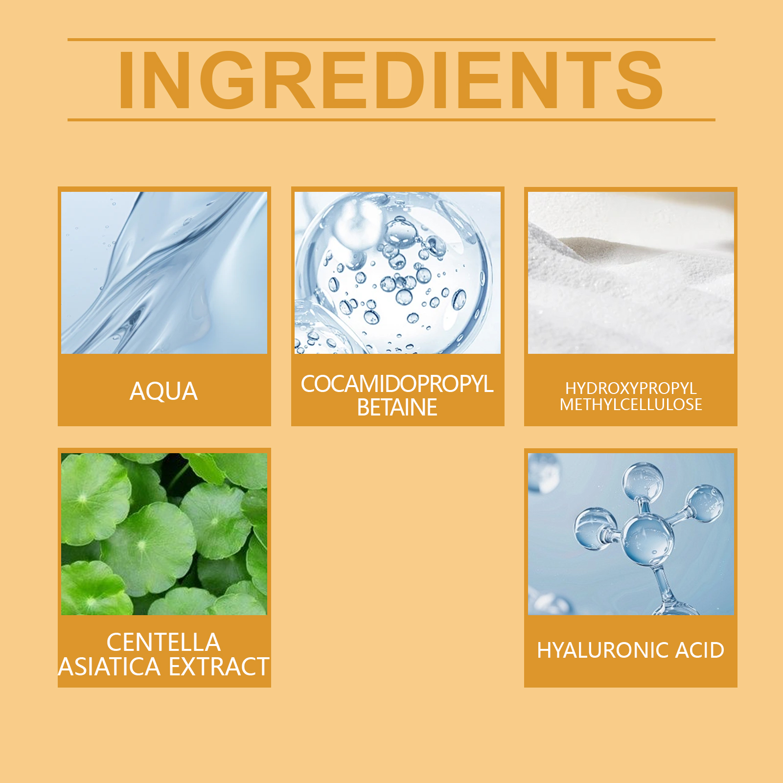 Our Centella asiatica Moisturizing Facial Cleanser is carefully formulated with Centella asiatica extract and hyaluronic acid. Designed specifically for deep penetration to remove excess dirt. The usage method is extremely convenient: Take an appropriate amount of this product in the palm of your hand and rub it to create foam. Massage and clean your face for 1 to 2 minutes. Wash it and keep it dry. And it can reduce tension and discomfort, and make cleaning easier.