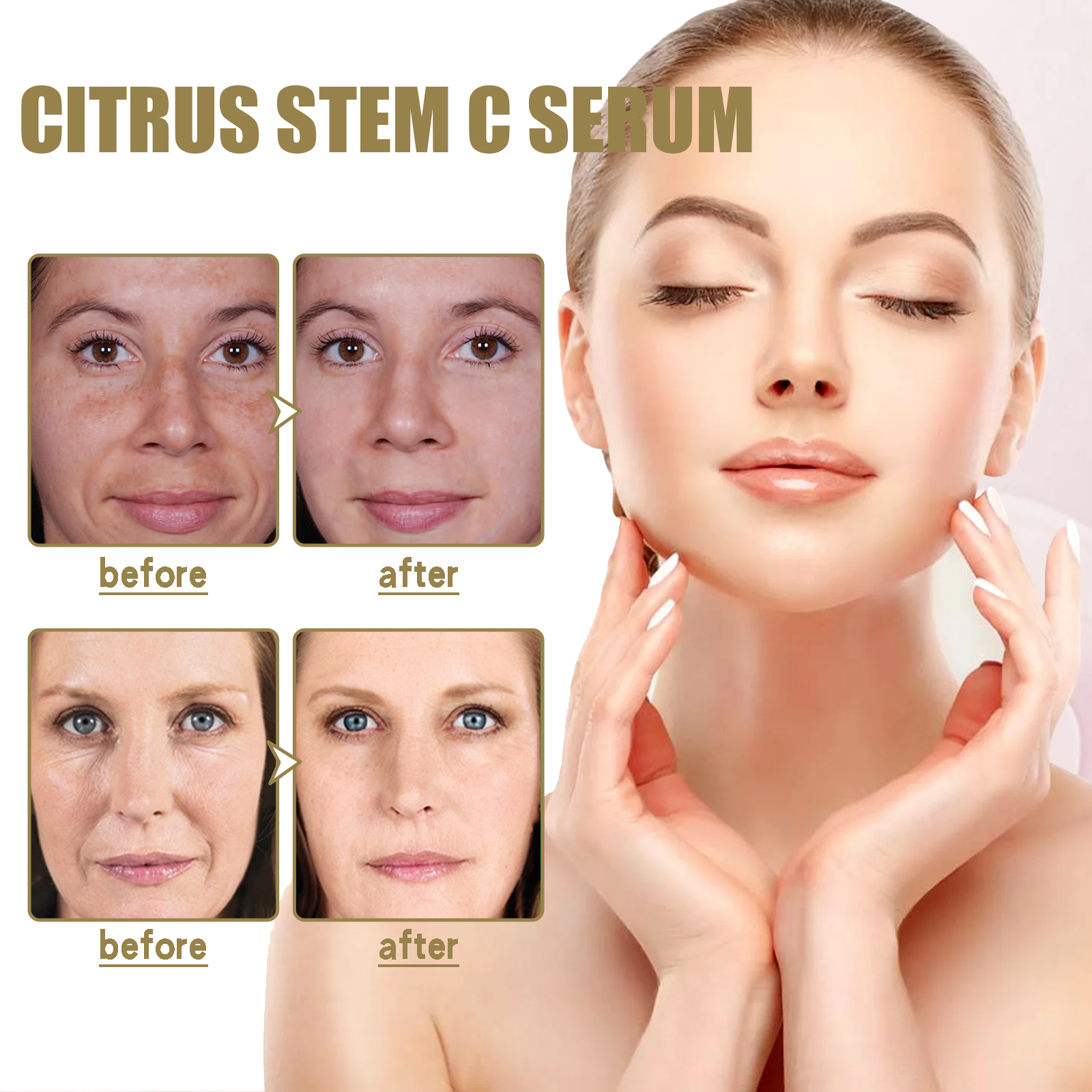 Our Citrus Stem C Serum contains Sodium Hyaluronate, Citrus Reticulata (Tangerine) Extract, Chrysanthellum Indicum Extract . It reduces wrinkles and fine lines and keeps skin firm and youthful; Make the skin more tight, even skin tone, light texture is not greasy. Its use method is very simple: press the appropriate amount of essence evenly applied to the face, gently massage until completely absorbed. It can lighten fine lines, hydrate and moisturize the skin, and make the skin fairer and firmer.