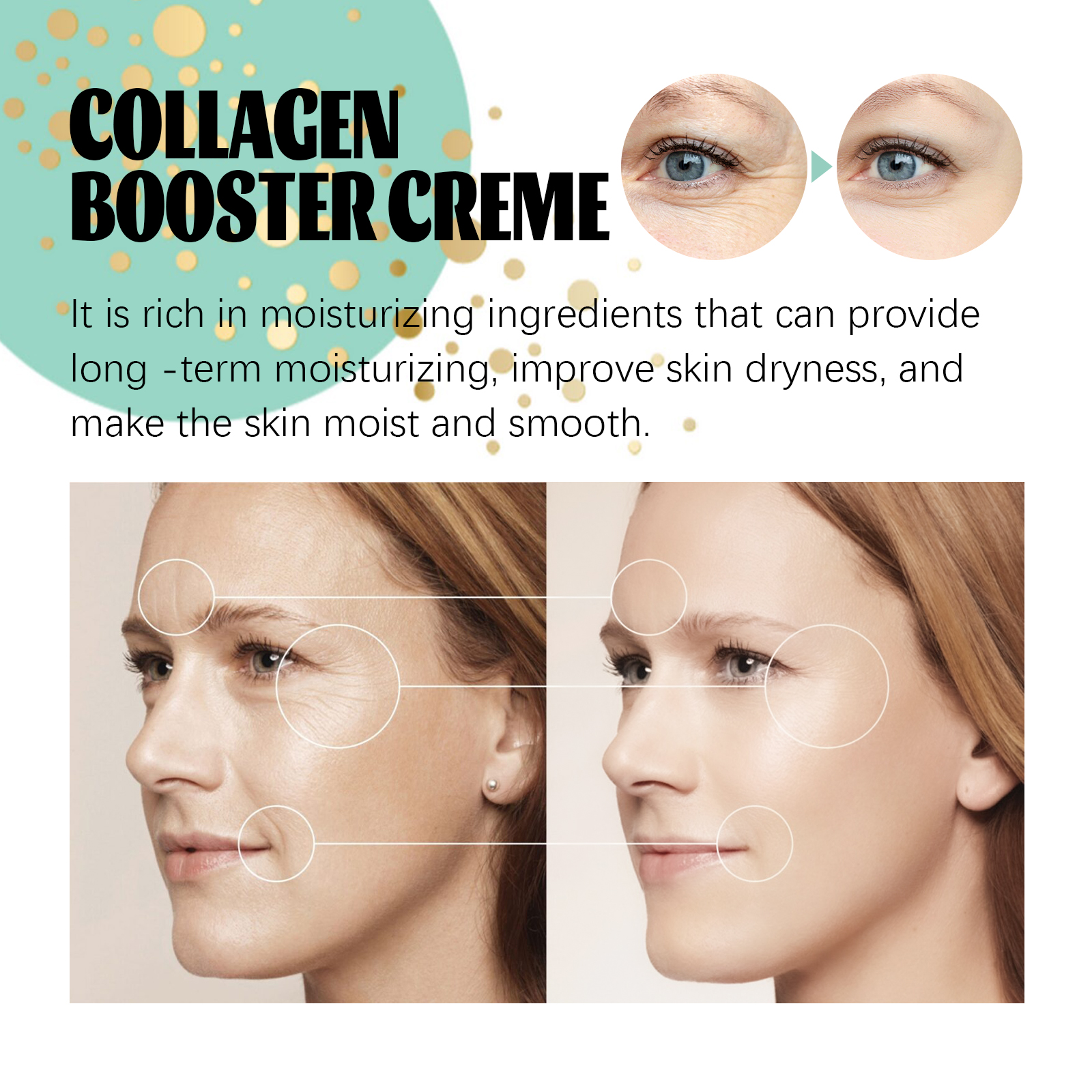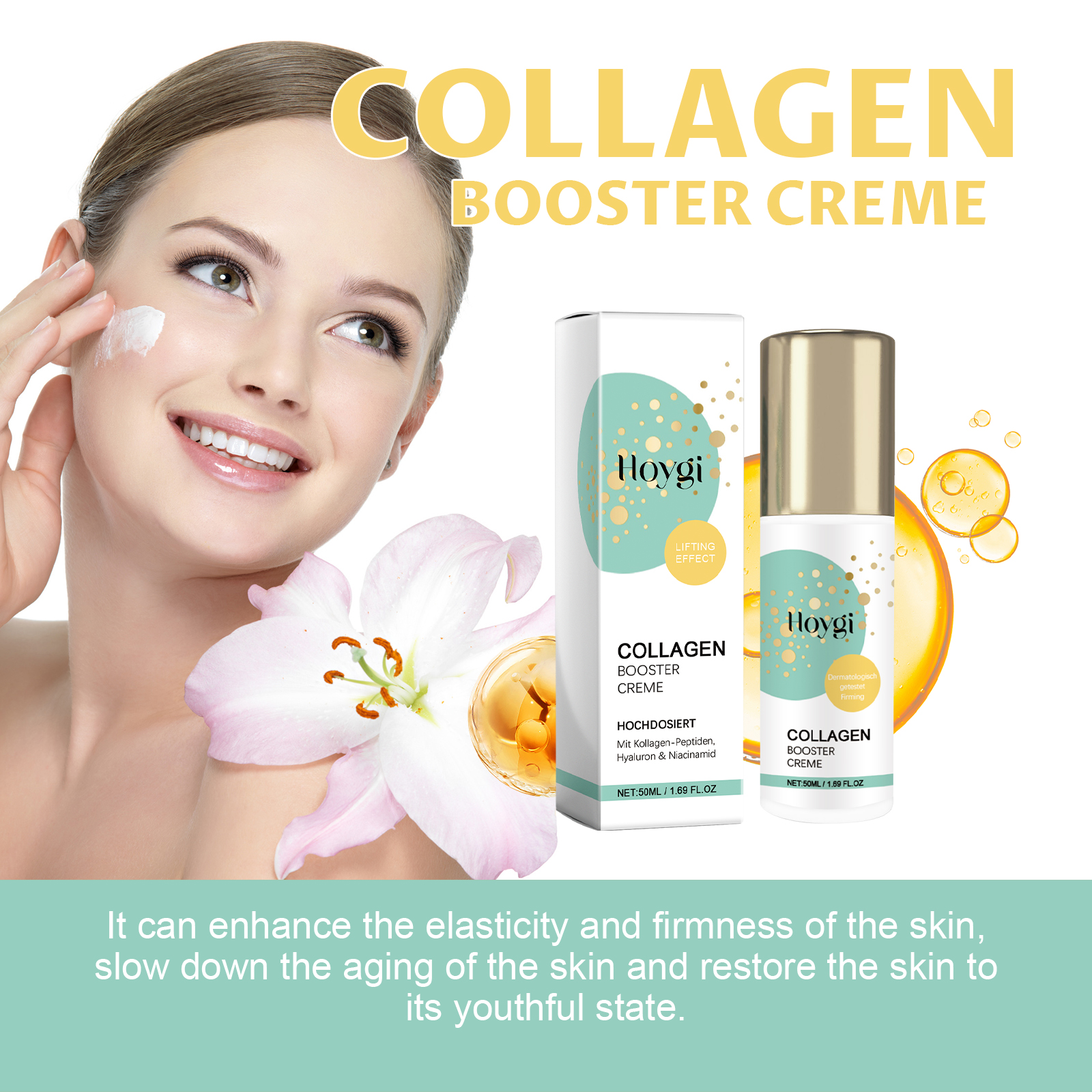 Our Collagen Booster Creme contains Hydrolyzed Collagen, Hyaluronic Acid, Niacinamide. It can moisturize for a long time, improve dry skin, and leave skin hydrated and smooth. Increase skin elasticity and reduce facial wrinkles. Its use method is very simple: wash and dry the face, squeeze out appropriate amount of this product evenly on the face skin, gently massage with your hands until completely absorbed. It can enhance the elasticity and firmness of the skin, slow down skin aging, restore the skin to a young state, reduce fine lines and wrinkles, and make the skin surface more smooth and delicate.