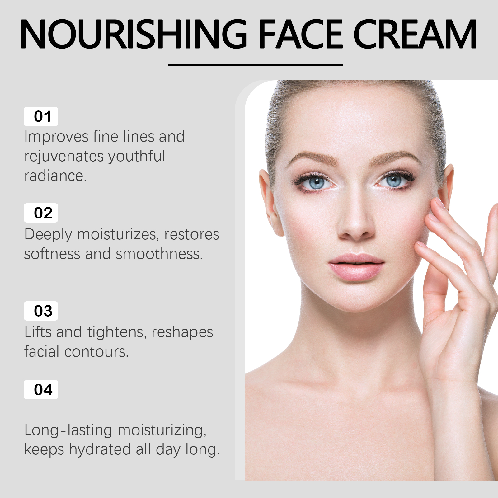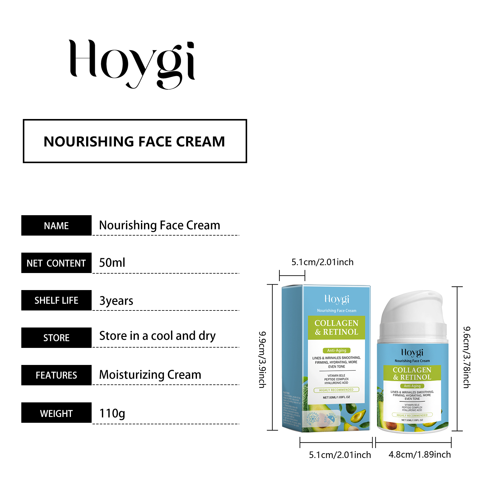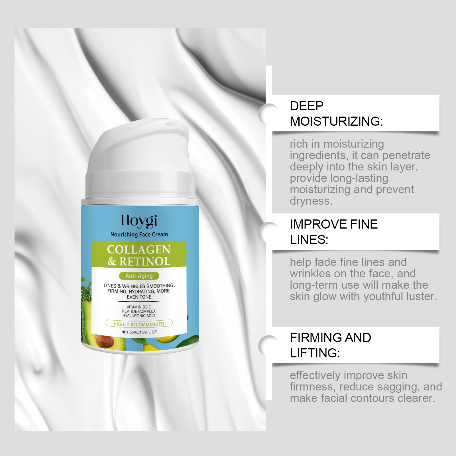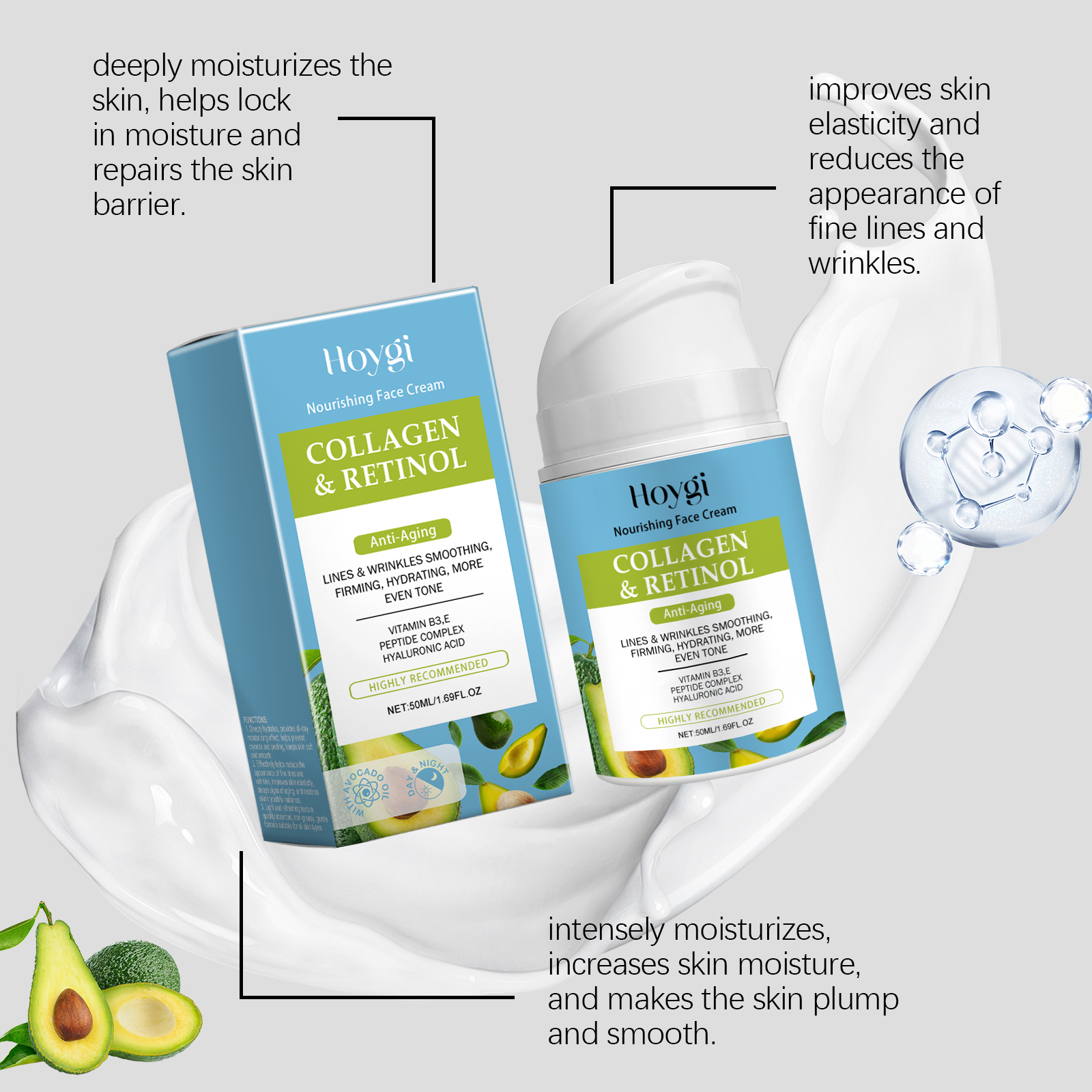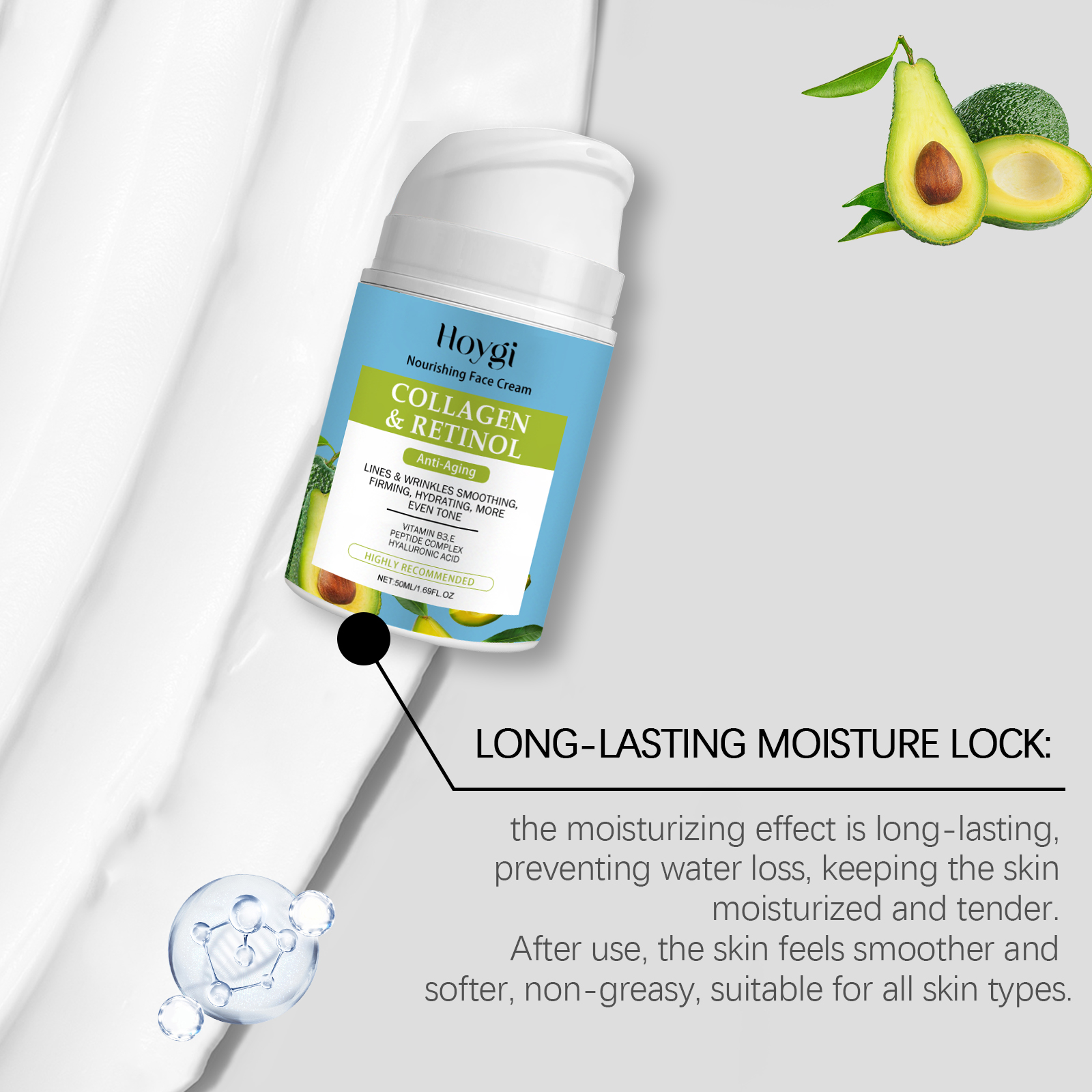 Our Collagen facial moisturizer contains avocado oil, collagen, and hyaluronic acid. It can help increase skin elasticity and improve skin texture. Helps increase skin elasticity and reduce the formation of wrinkles. Its application method is simple: 1. Clean facial skin and keep it dry. 2. Apply appropriate amount of the product evenly on the face. 3. Massage gently in circular motions to promote absorption. Provides additional antioxidant protection to help fight harmful substances in the environment.