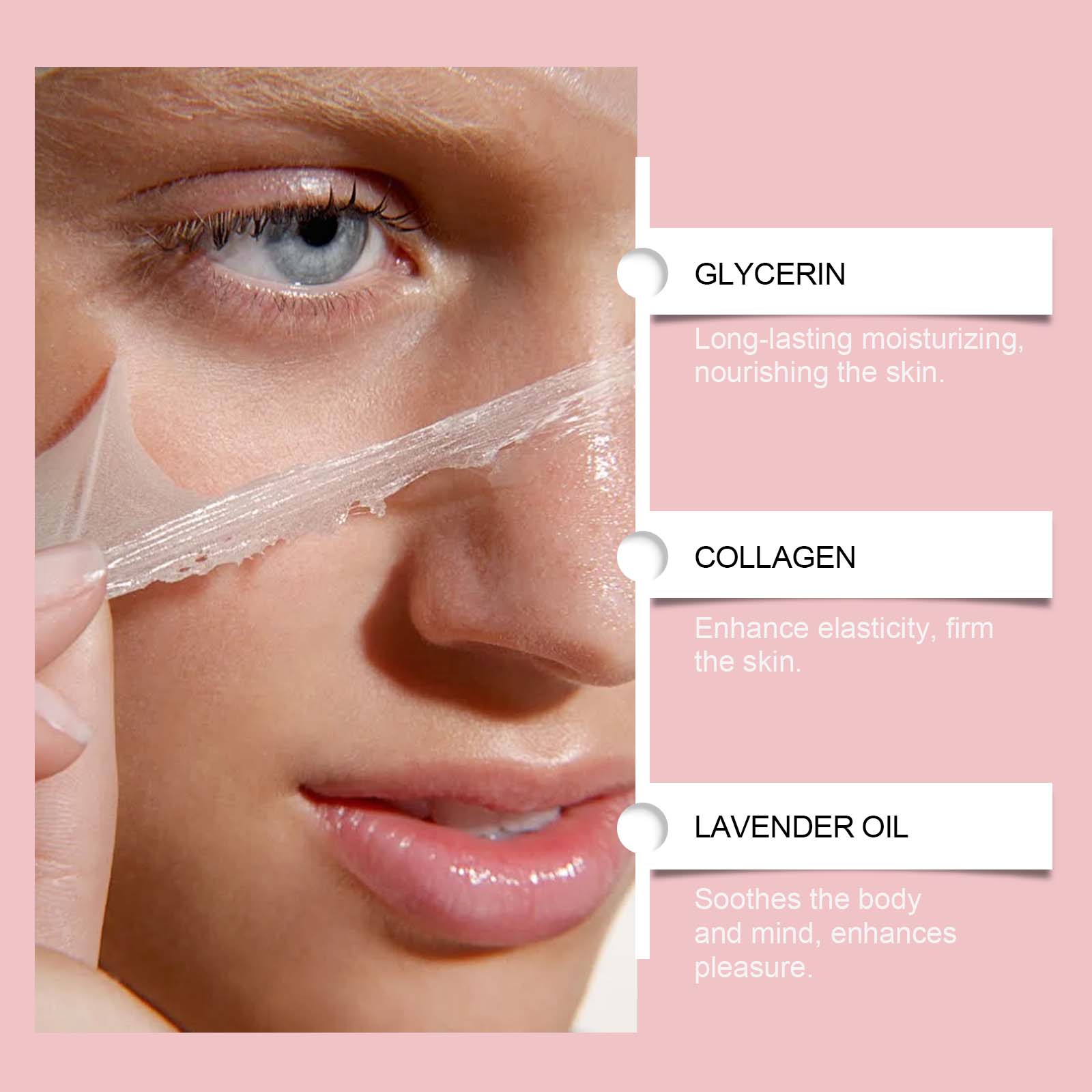 Our Collagen tearing mask contains lavender oil, hyaluronic acid, vitamin E (tocopherol). It can improve the texture of the skin and show a firm and smooth skin texture. Its use method is very simple: after cleansing, take appropriate amount of this product evenly applied to the face, avoiding the eyes and lips. Wait 20 minutes, gently peel from bottom to top and wash off with water. It also has a dense moisturizing effect, helping the skin retain moisture.