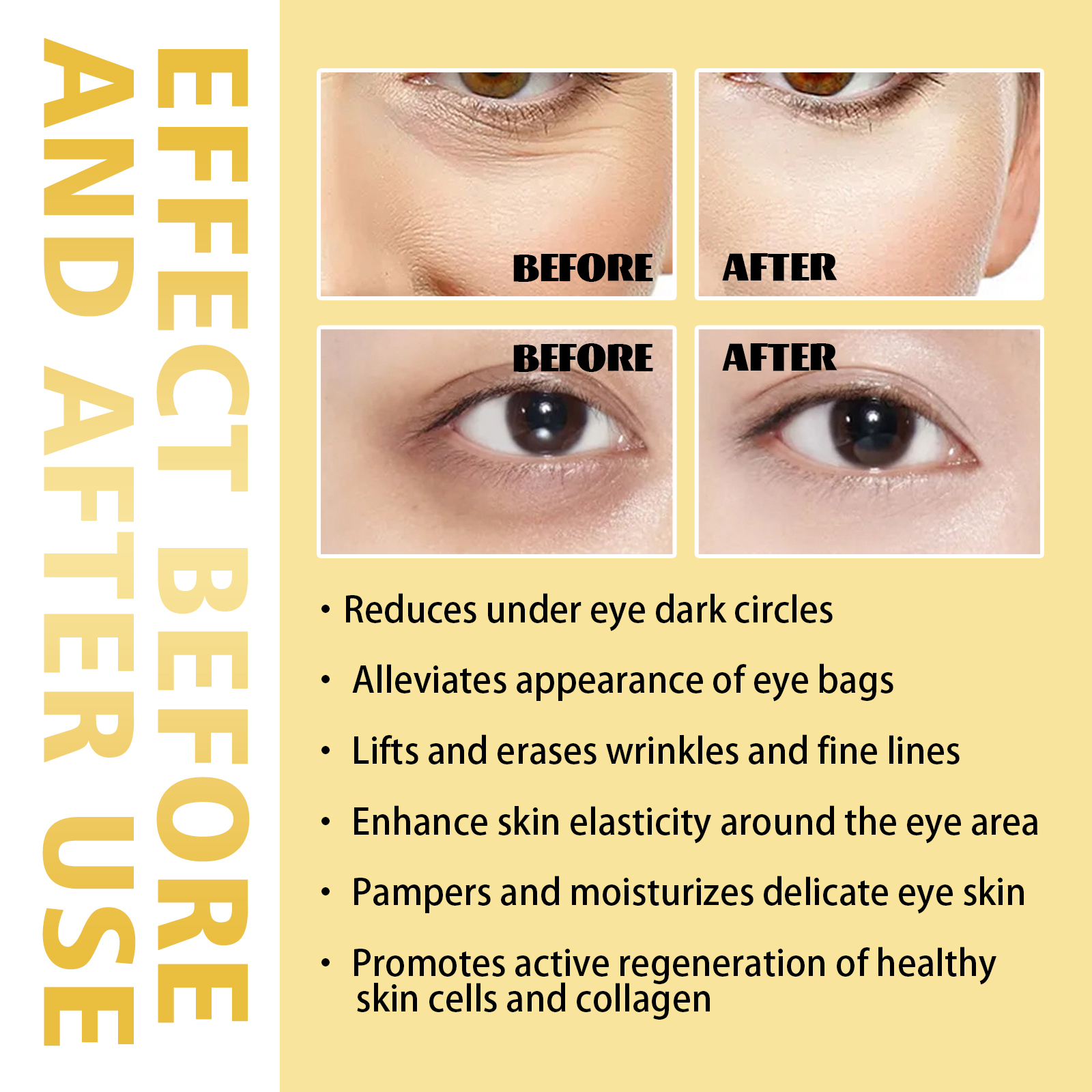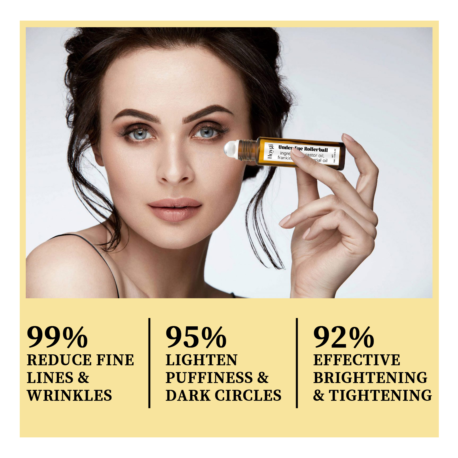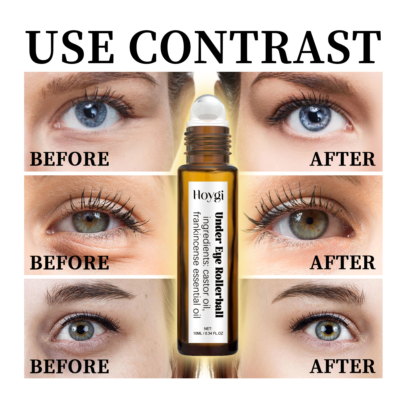 Our Eye ball oil contains hydrogenated castor oil, frankincense oil, and tocopherol (vitamin E). It can lighten dark circles, make the eye skin look brighter, reduce eye puffiness and eye bags, enhance the elasticity of the skin around the eyes, care and moisturize the delicate eye skin, promote the active regeneration of healthy skin cells and collagen, and make the skin firmer. Its application is simple: gently roll the product along the contour of the eye and gently massage until it is completely absorbed. It can effectively reduce eye fine lines and wrinkles, improve skin elasticity, and make skin more tender and younger.
