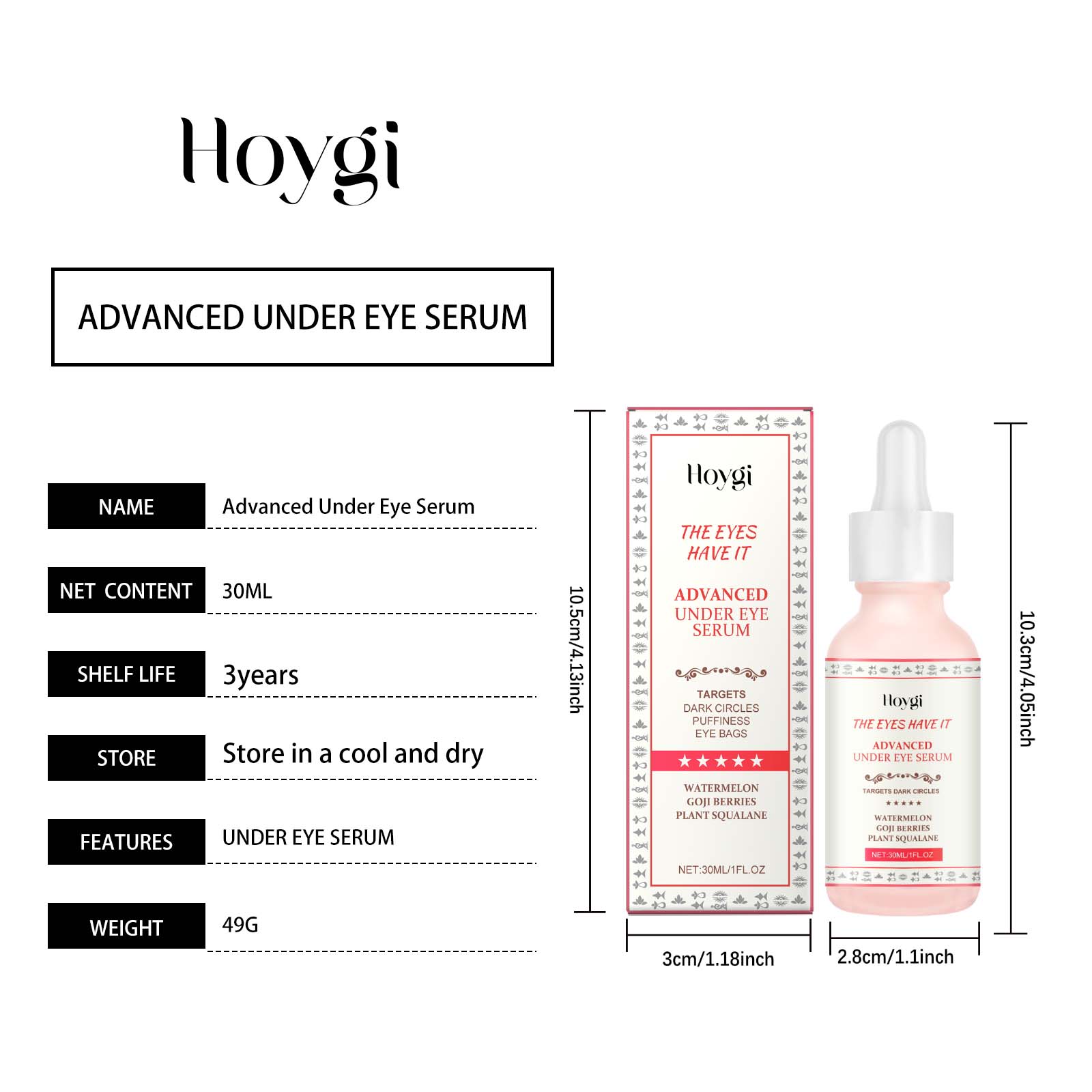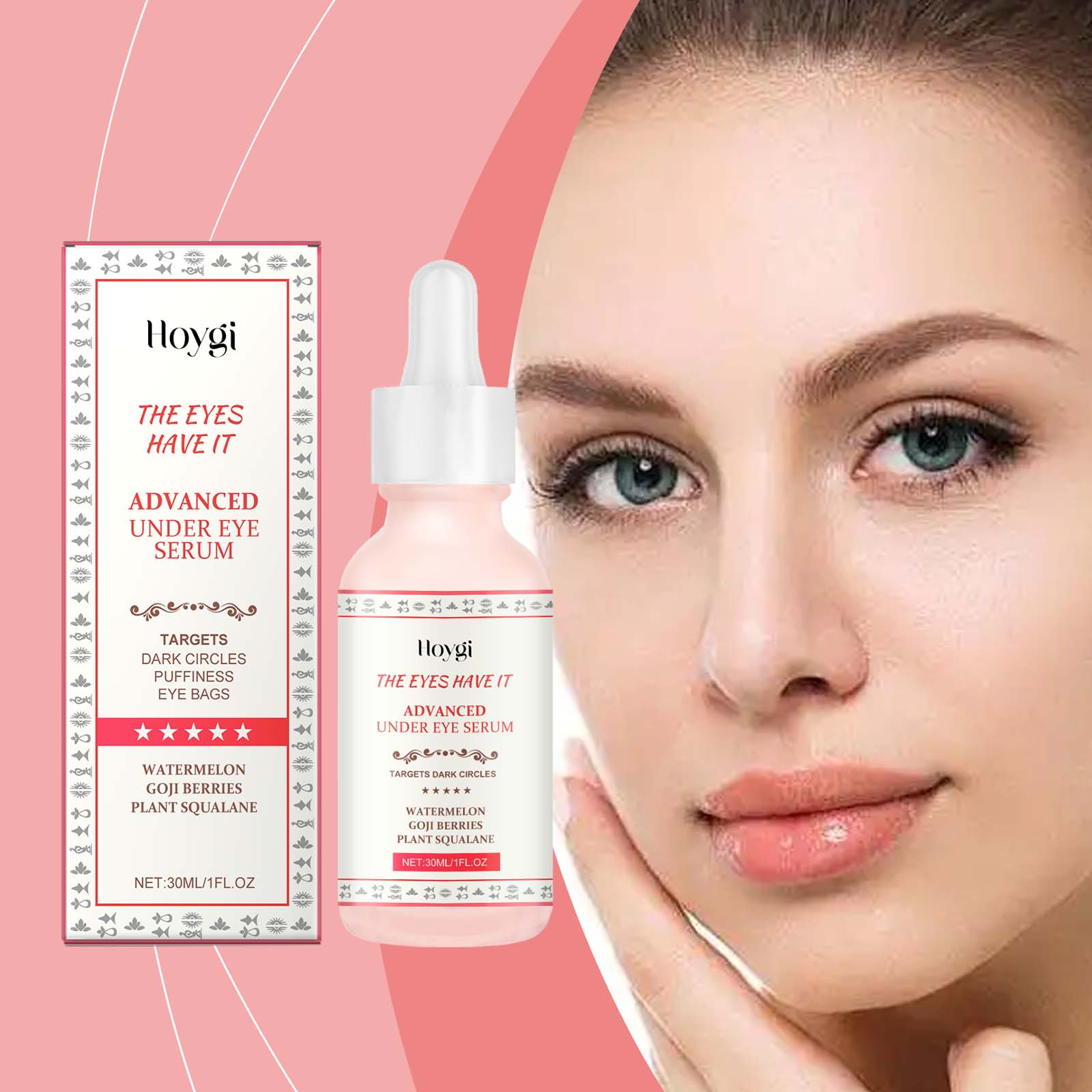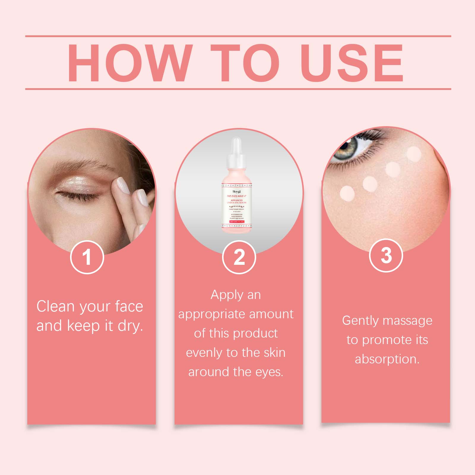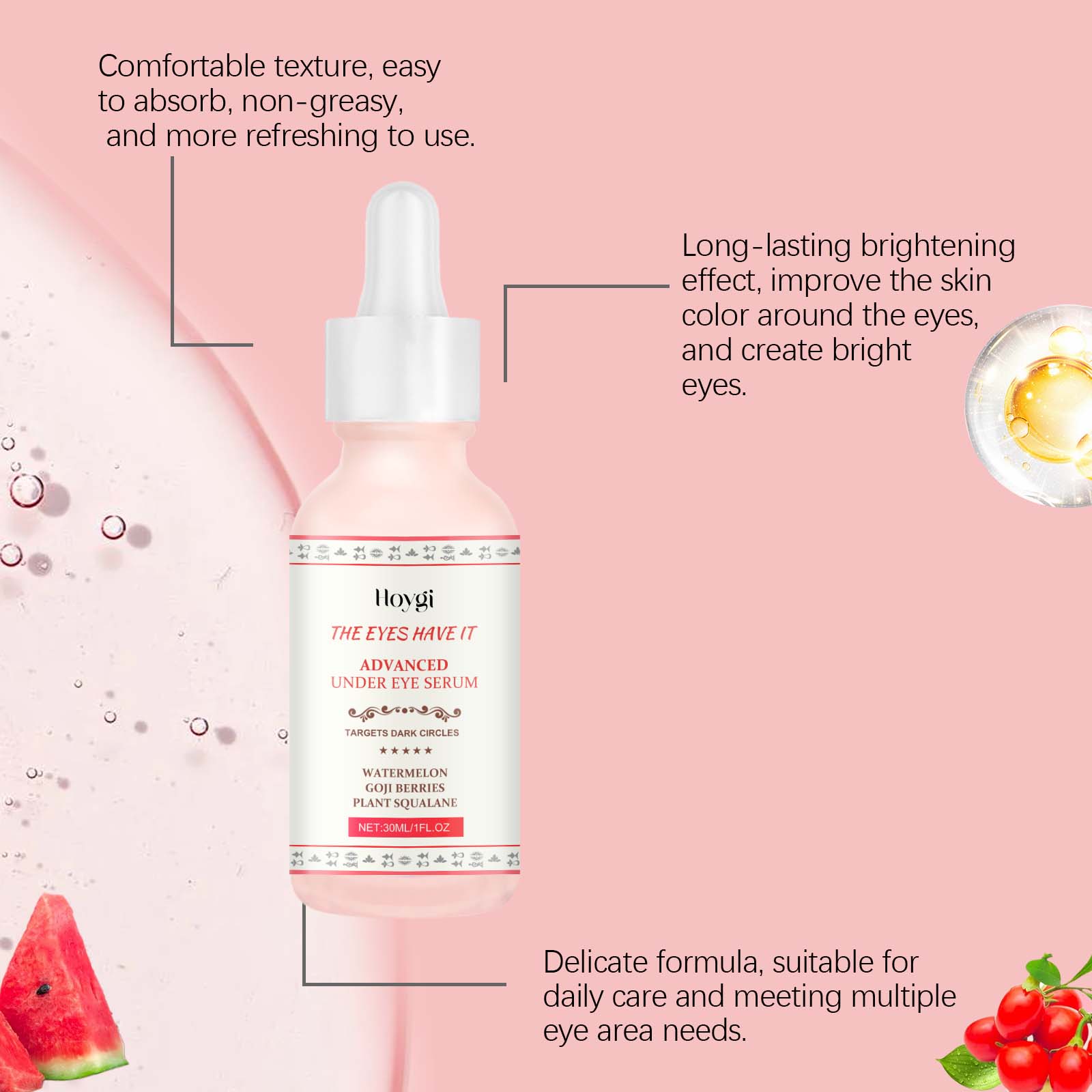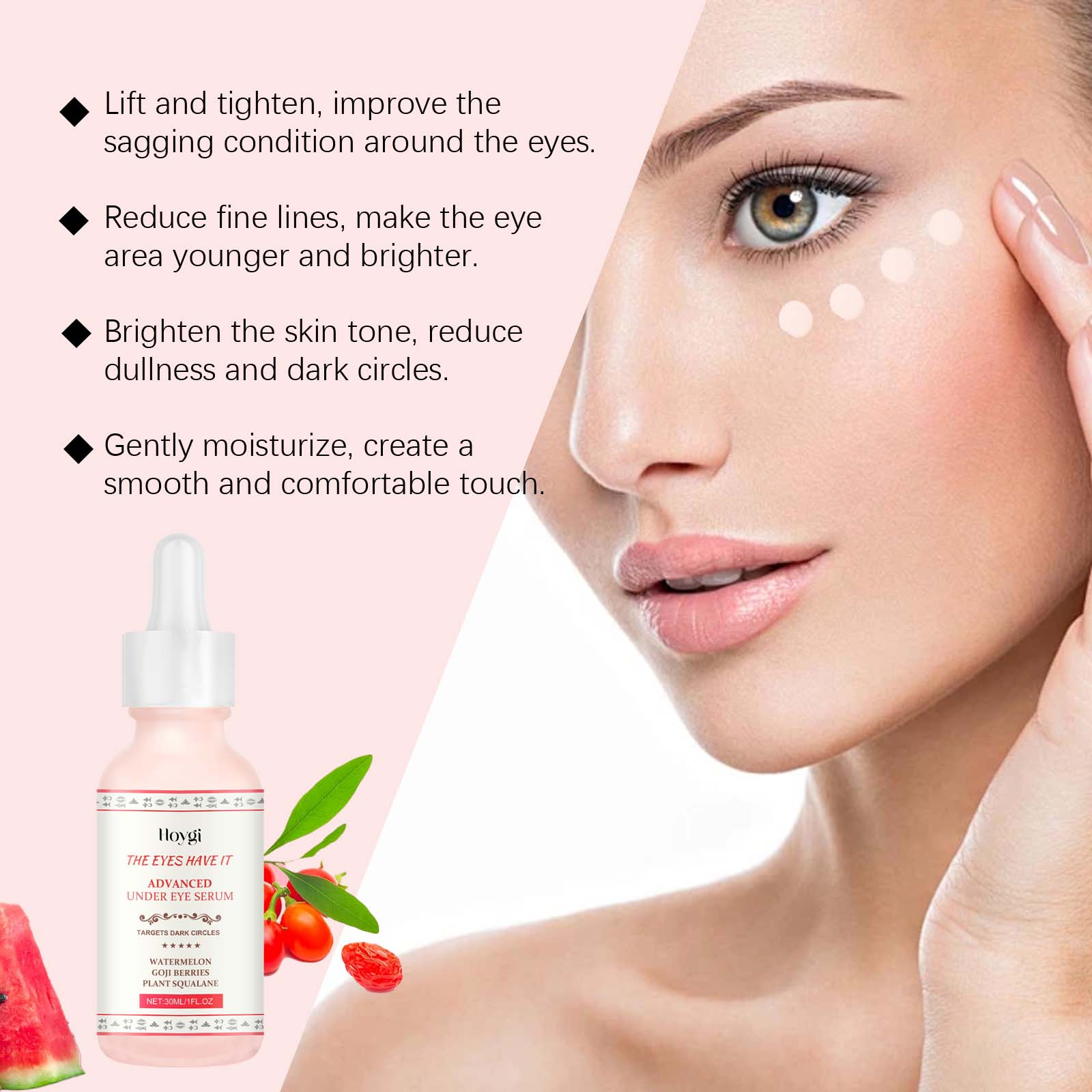 Our anti-wrinkle eye serum contains watermelon extract, goji berry extract, vegetable squalane. It can improve eye dullness and restore a healthy glow. Its application is simple: clean your face and keep it dry. Apply appropriate amount of this product evenly to the skin around eyes. Massage gently to promote absorption. And can significantly reduce the sagging feeling around the eyes, showing firm skin.