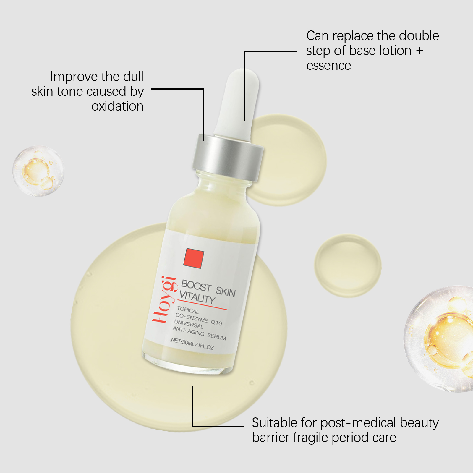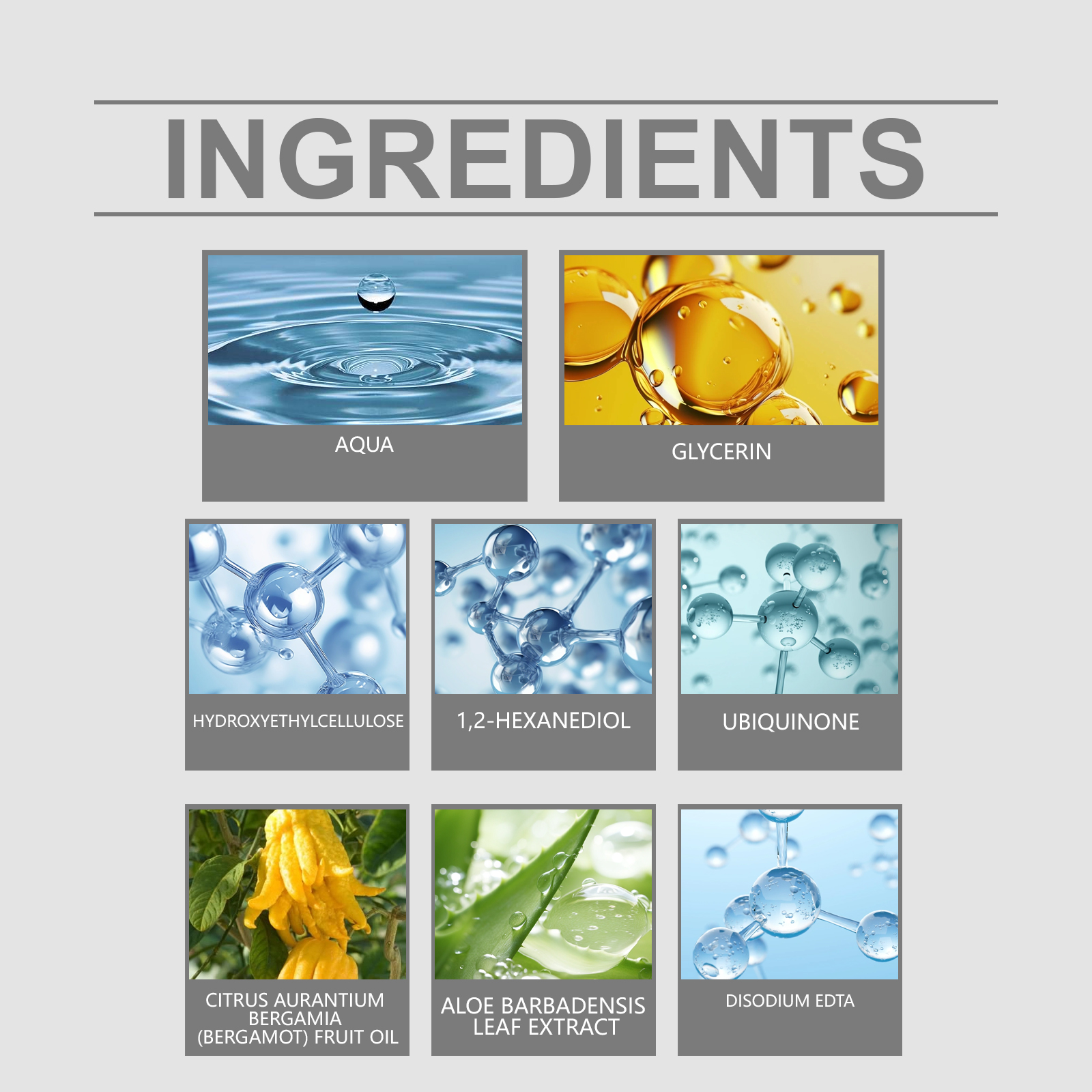 Our facial and neck moisturizing essence is carefully formulated with glycerin, hydroxyethyl cellulose and 1, 2-hexanediol. Designed specifically for both morning protection and night restoration scenarios. The usage method is extremely convenient: After cleaning, take 3 drops and warm them in the palm of your hand. Gently press along the skin texture until absorbed as the first step in your skincare routine, and then add subsequent products. At the same time, care for the neck to prevent horizontal wrinkles. And it contains coenzyme Q10, which can activate the mitochondrial activities of cells, and bergamot fruit oil and aloe vera establish a defense network.