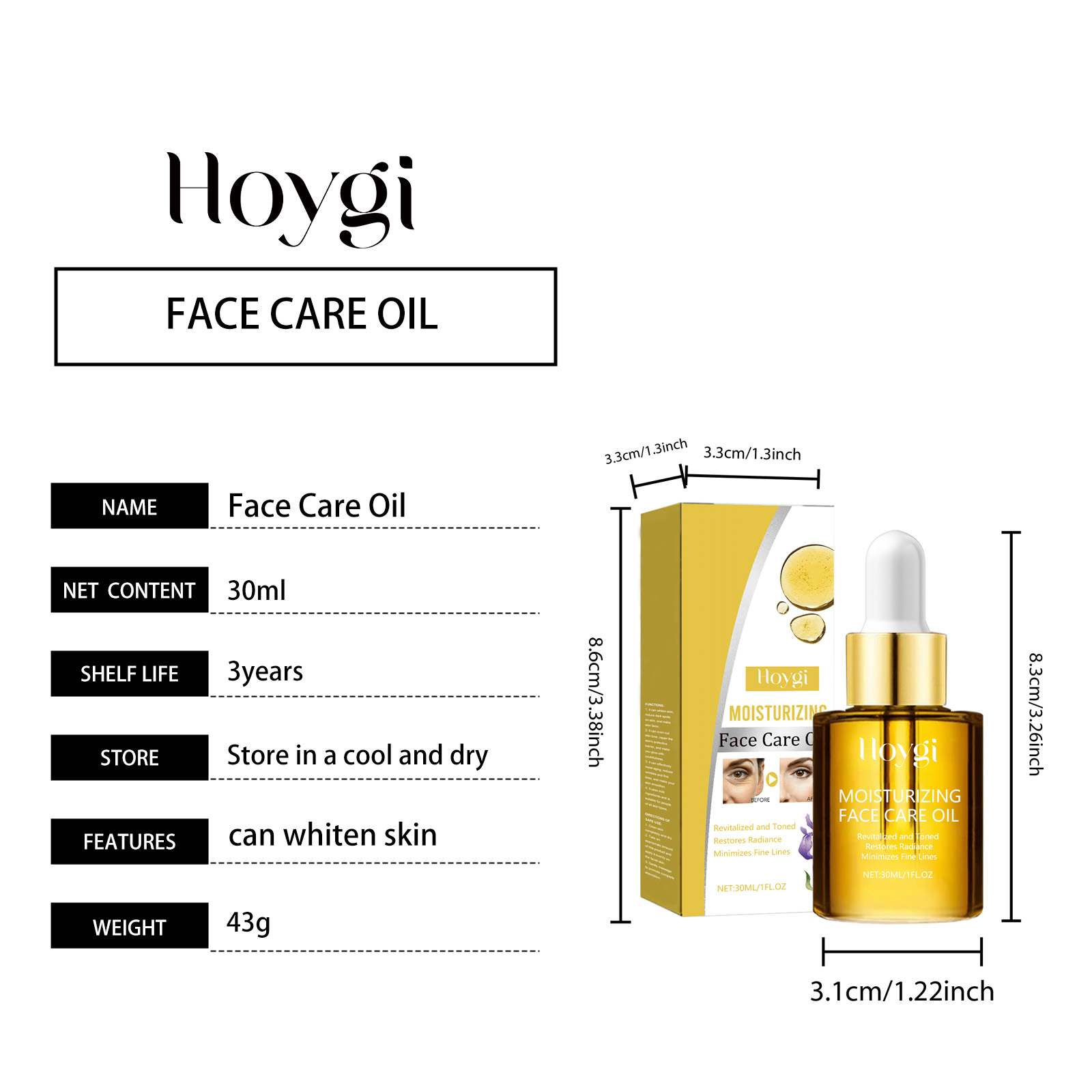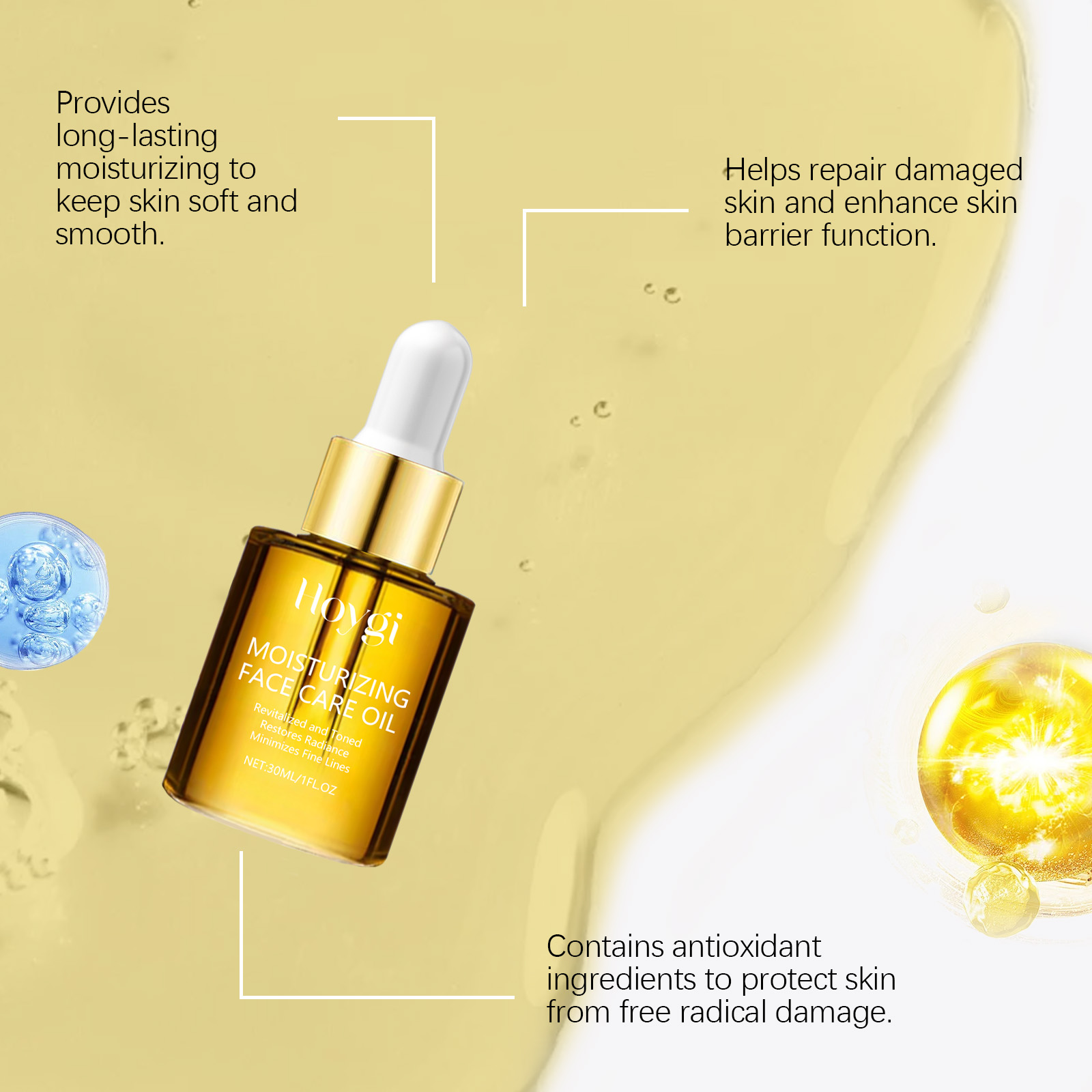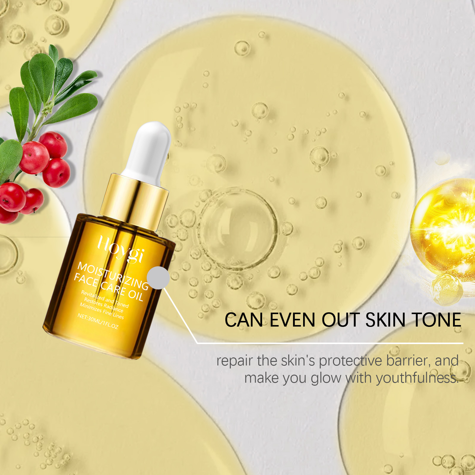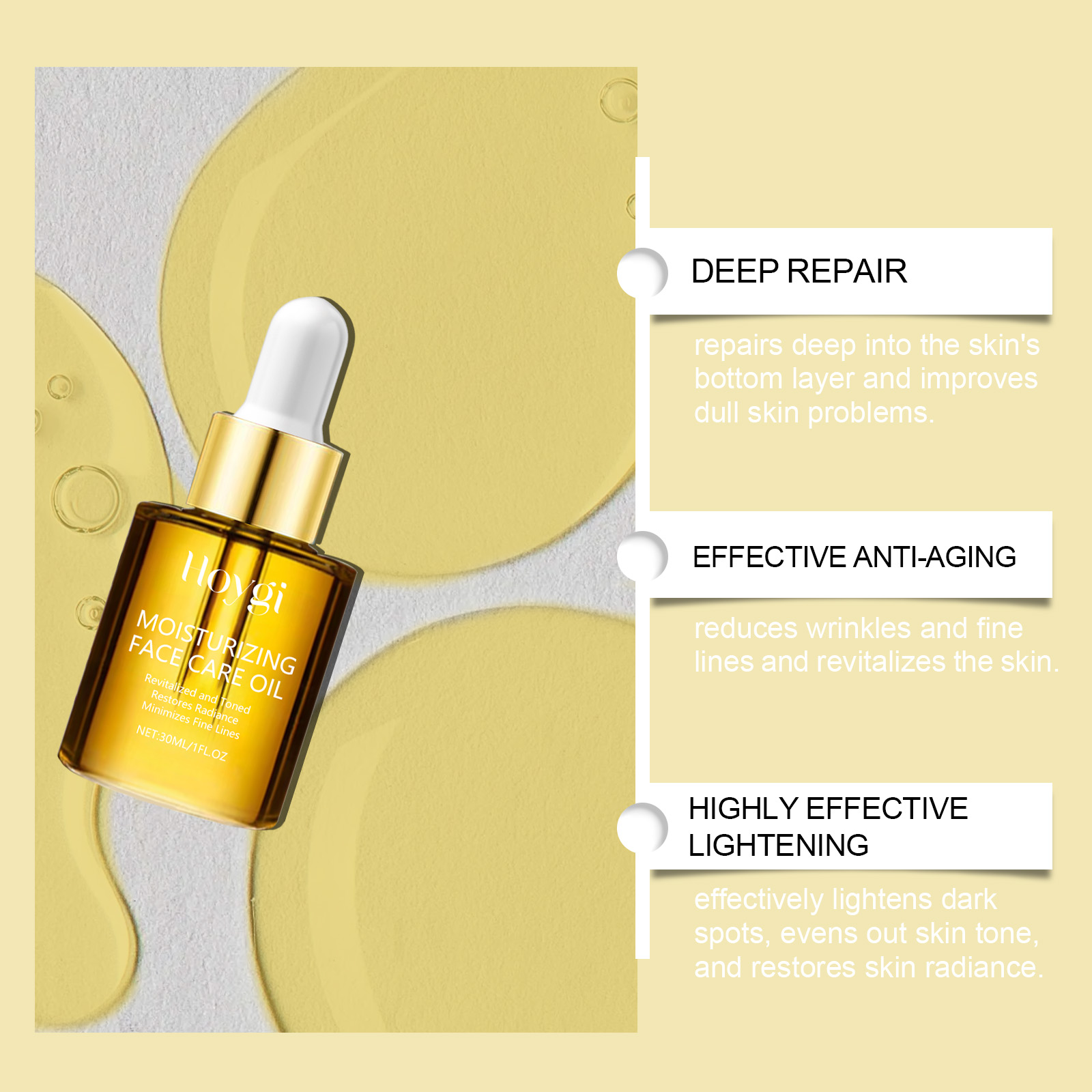 Our facial essential oil contains hyaluronic acid and collagen. It can effectively lighten dark spots, even skin tone, restore skin luster without irritation, suitable for sensitive skin, safe and reliable. Its application method is very simple: thoroughly clean dry skin, take appropriate amount of this product, evenly apply to the face skin. Massage gently to promote complete absorption. And it can reduce dark spots on the skin and make the skin fairer.