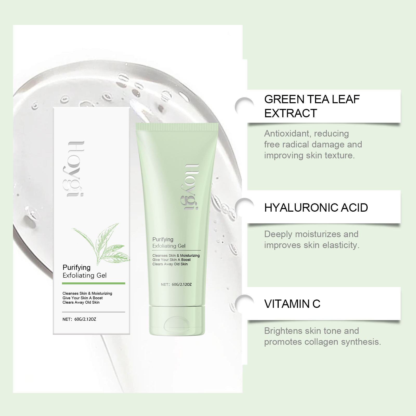 Our facial keratin gel is carefully formulated with green tea leaf extract, hyaluronic acid and ascorbic acid (vitamin C). Specifically designed to gently remove old and dead skin cells, allowing the skin to naturally glow. Designed to effectively shrink pores and improve the problem of enlarged pores. The usage method is extremely convenient: 1. Apply a layer of this product to a damp face and scrub in circular motions. Just rinse it off with clean water and dry the skin. It can deeply moisturize the skin, lock in moisture and maintain skin elasticity.