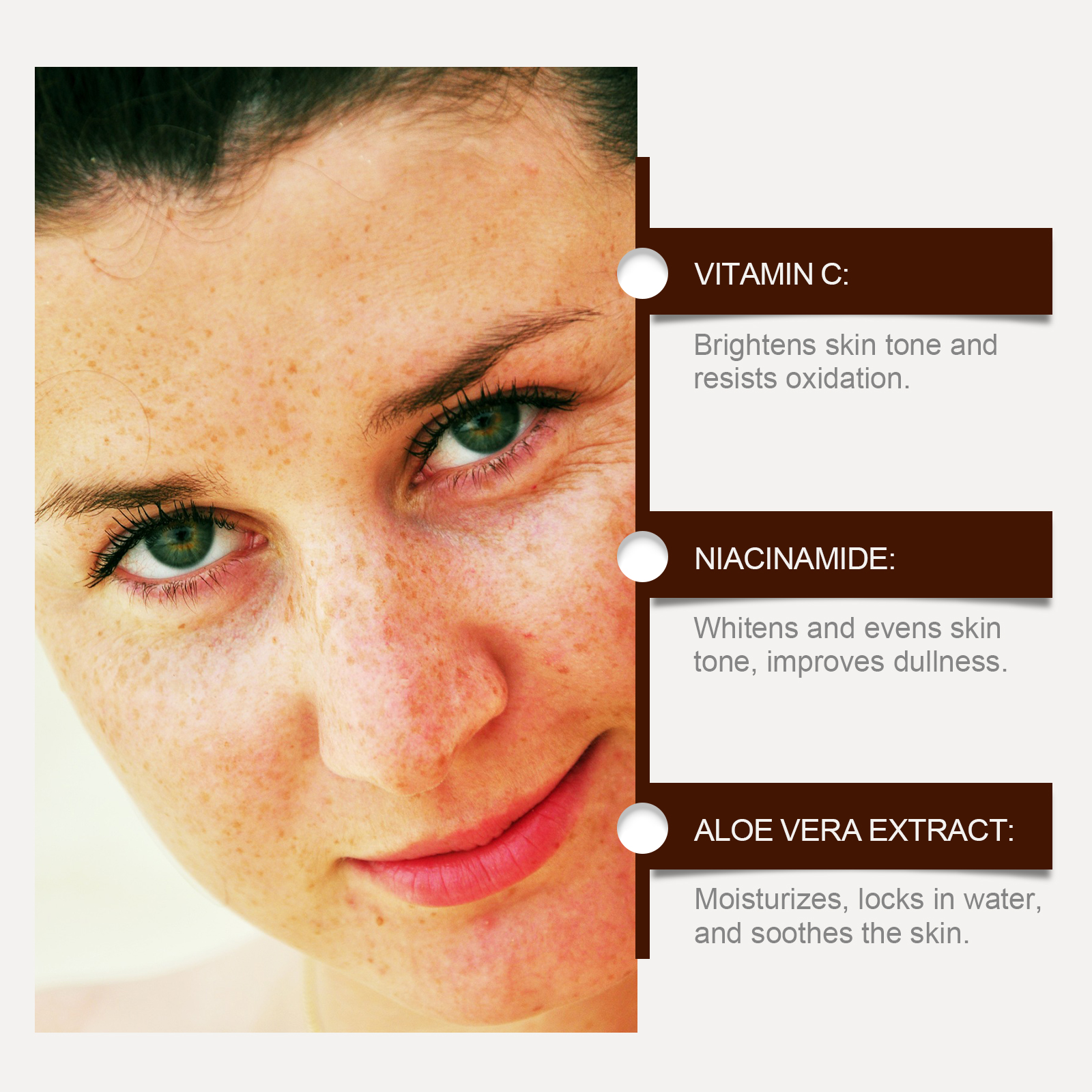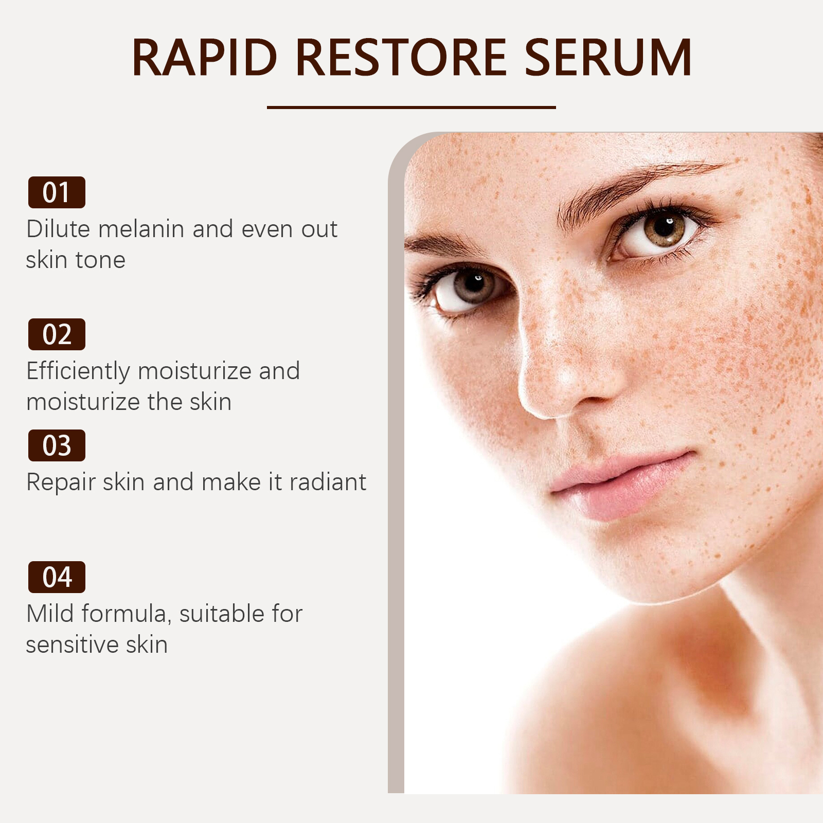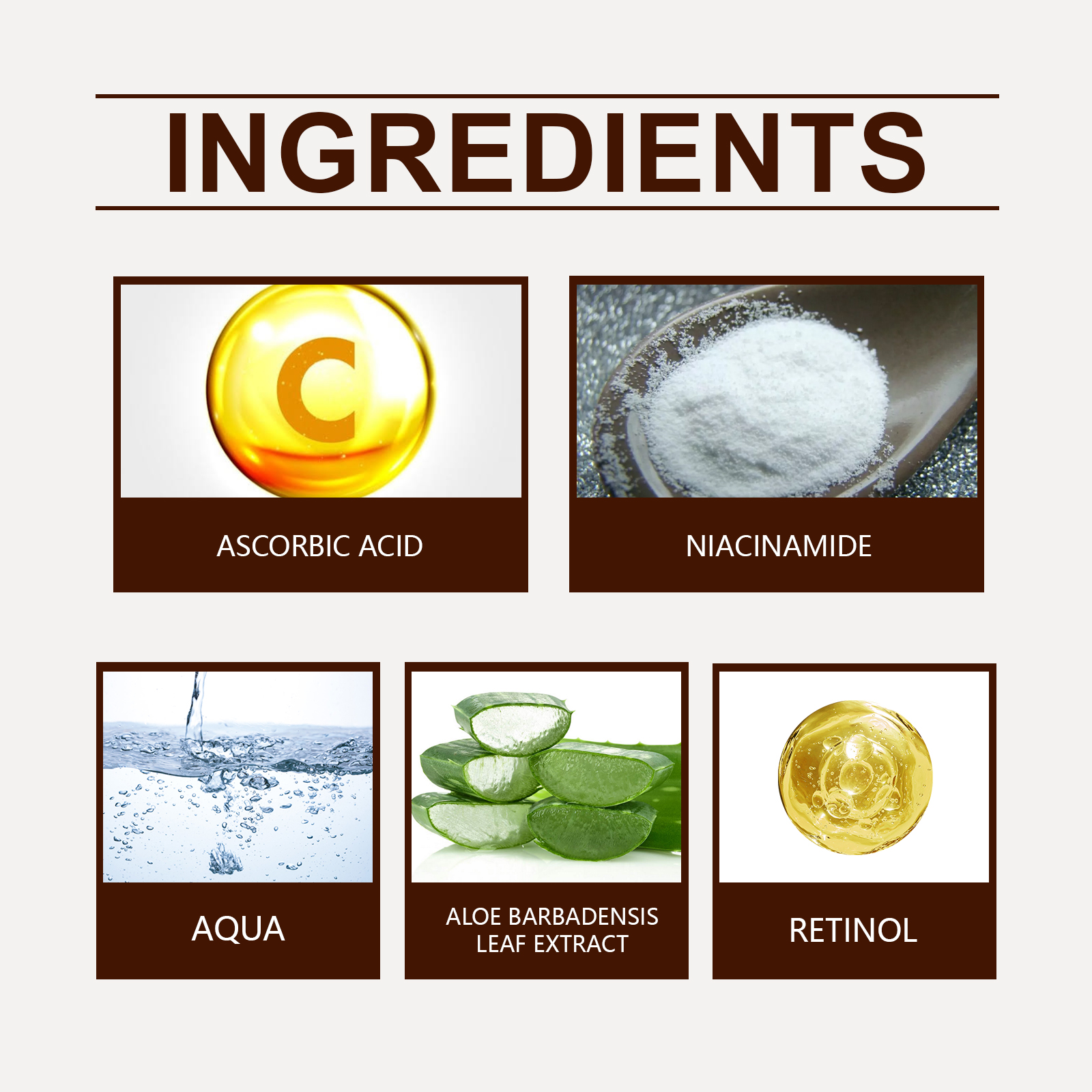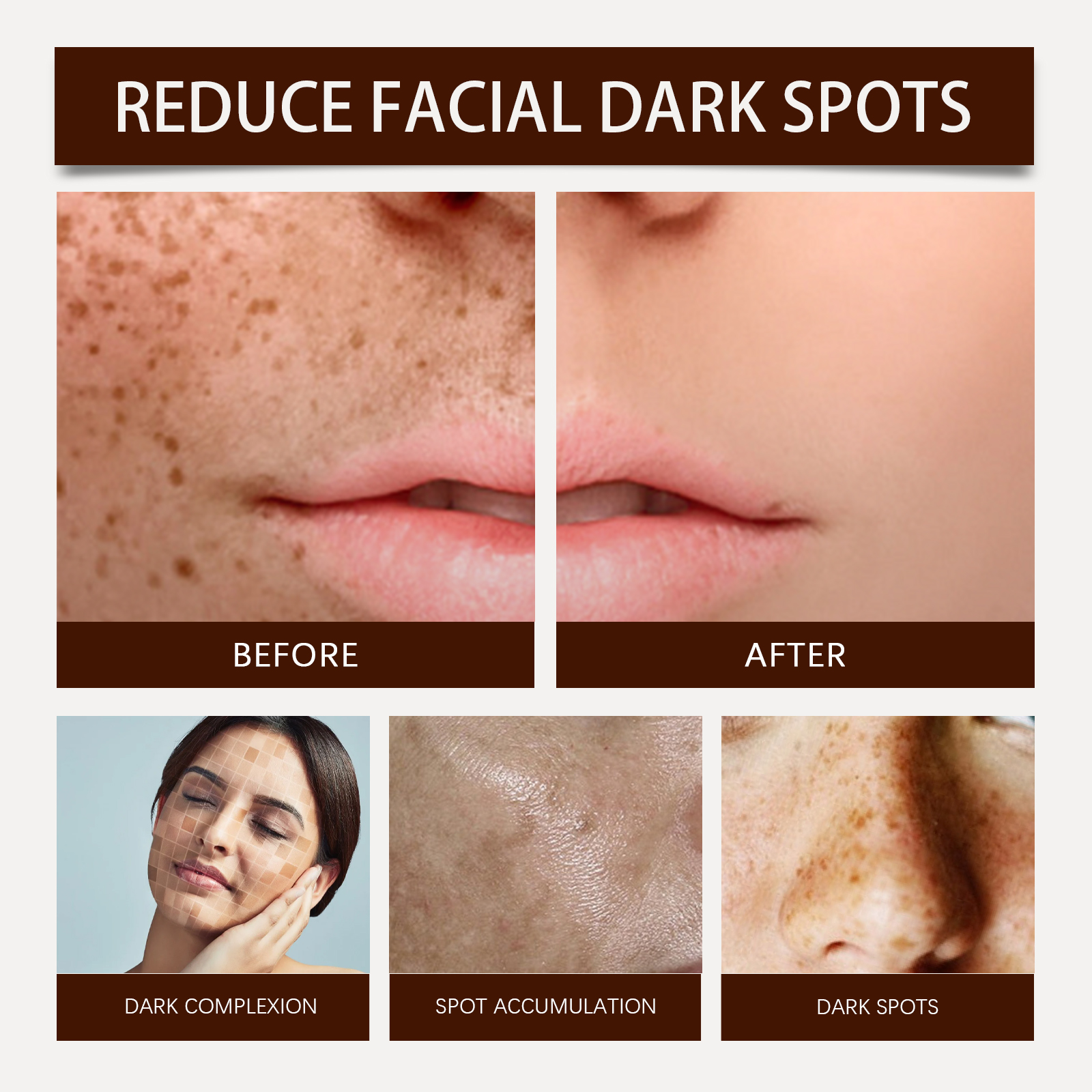 Our facial skin repair essence is carefully formulated with vitamin C, niacinamide and aloe vera extract. Designed specifically to effectively reduce melanin deposition and lighten skin tone. The usage method is extremely convenient: 1. Clean the skin and keep it dry. 2. Take an appropriate amount of the essence and apply it evenly to your face. 3. Massage in circular motions with your fingertips to enhance facial absorption. And it contains retinol, which can promote cell renewal and repair damaged skin.