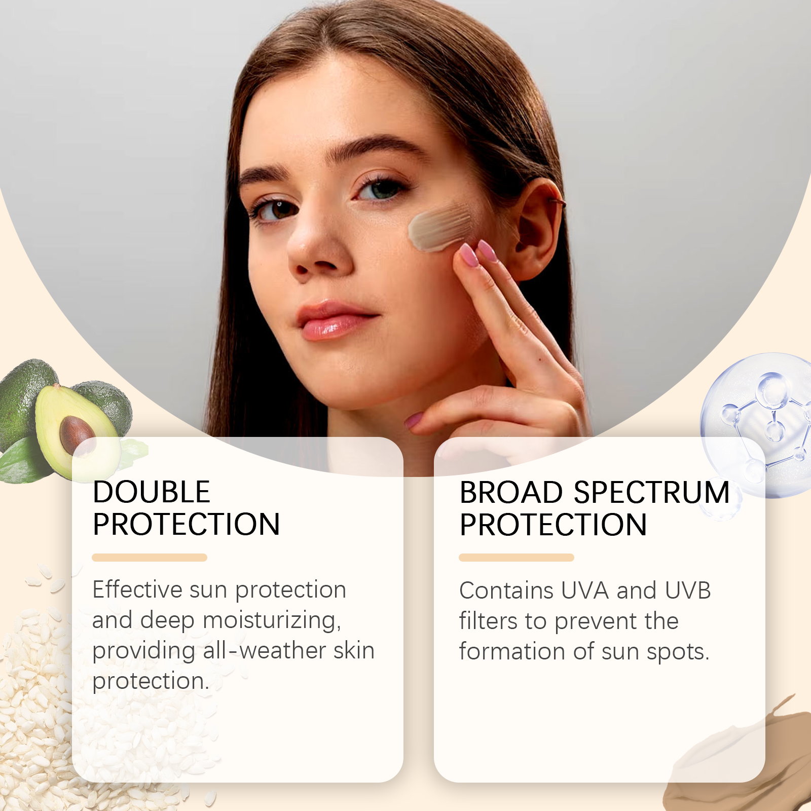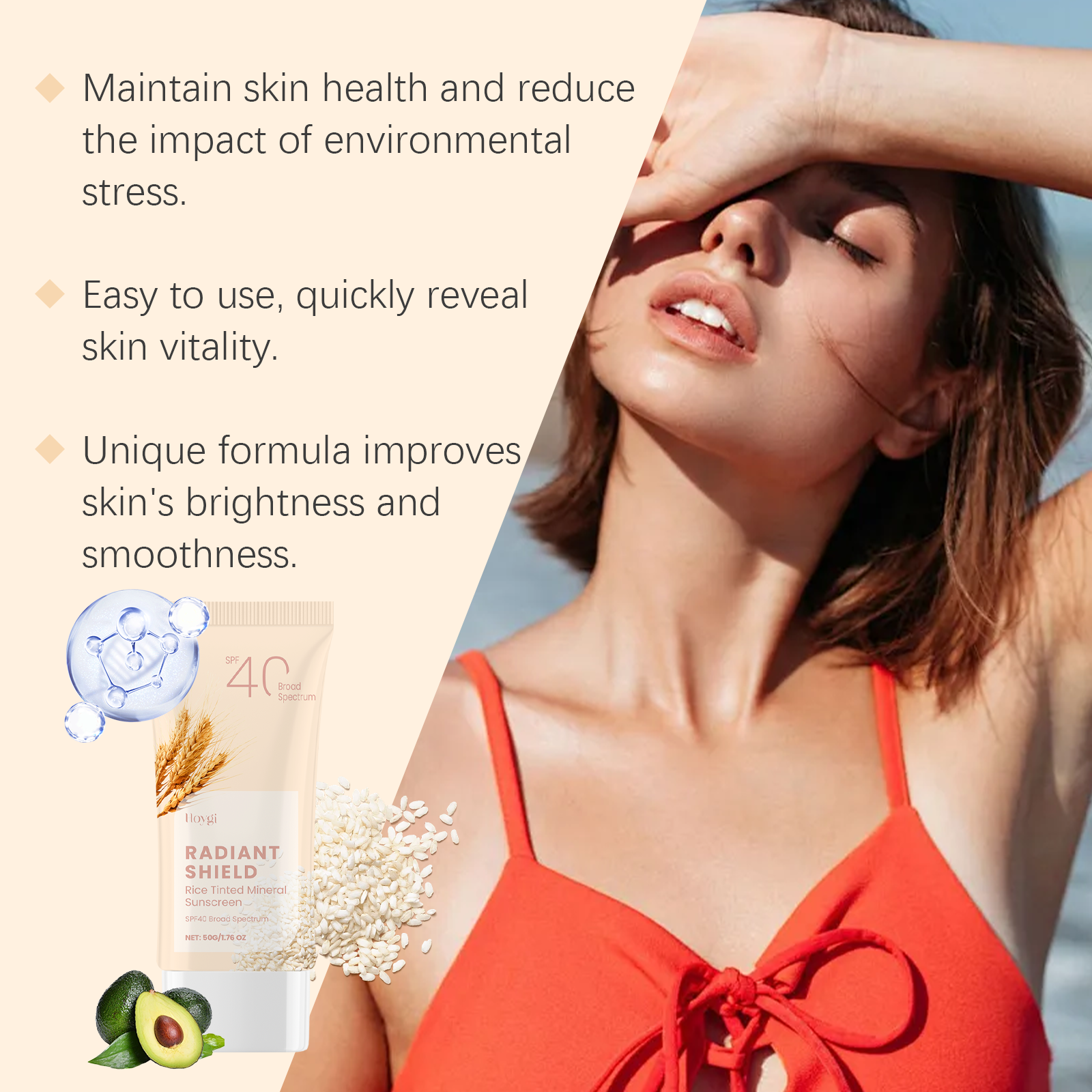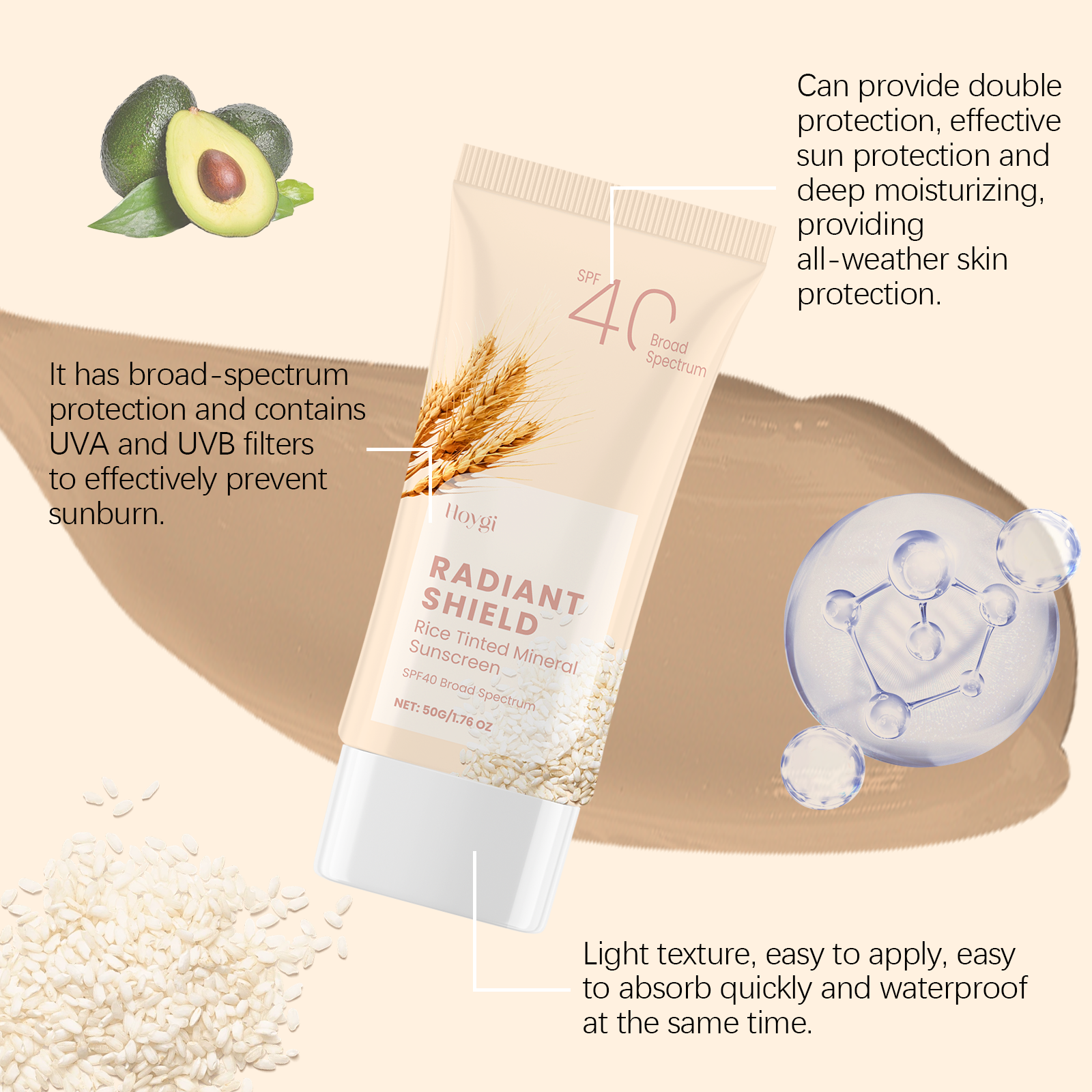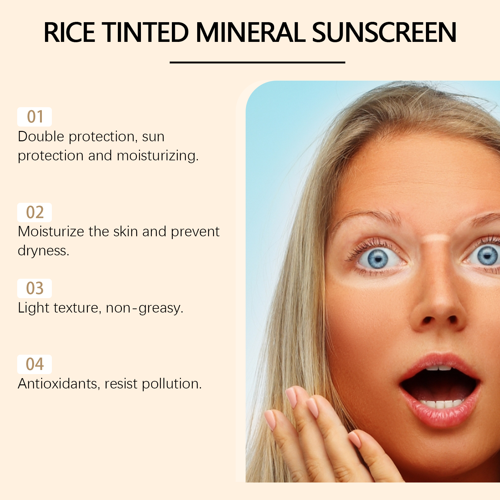 Our mild sunscreen contains rice extract, avocado oil, and titanium dioxide. It is an effective sunscreen and deep moisturizer to protect the skin all day long. Contains UVA and uvb filters to prevent sunspot formation. The way to use it is very simple: 1. 15-20 minutes before going out, evenly apply sunscreen to the face or body in need of sun protection, massage until fully absorbed, and then naturally form a layer of sunscreen. 2. If you are exposed to the sun for a long time, you need to reapply every 2-3 hours. Rich in gentle ingredients that nourish and repair skin. Light texture, not greasy, suitable for daily use. Lock in moisture and keep skin moisturized and smooth throughout the day.