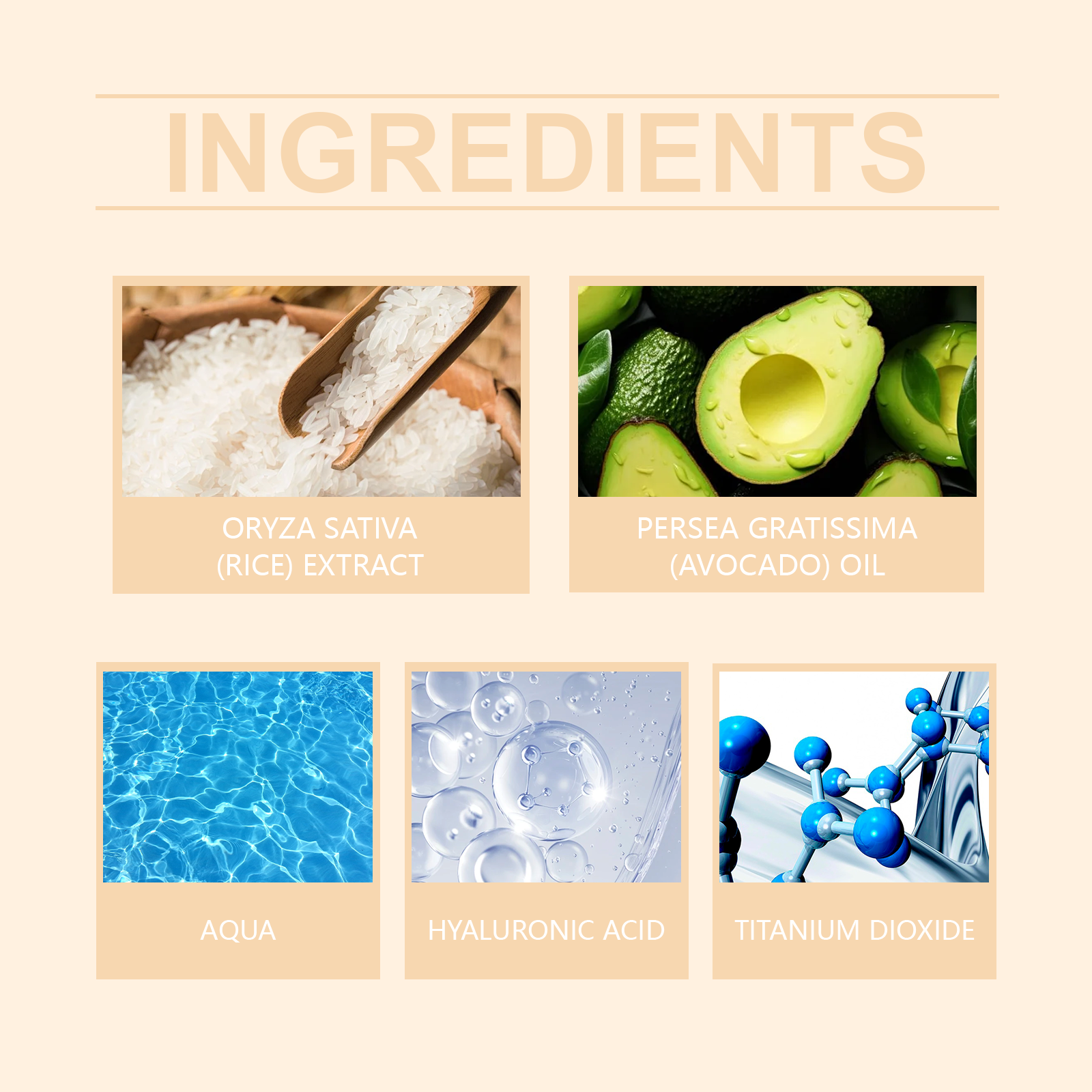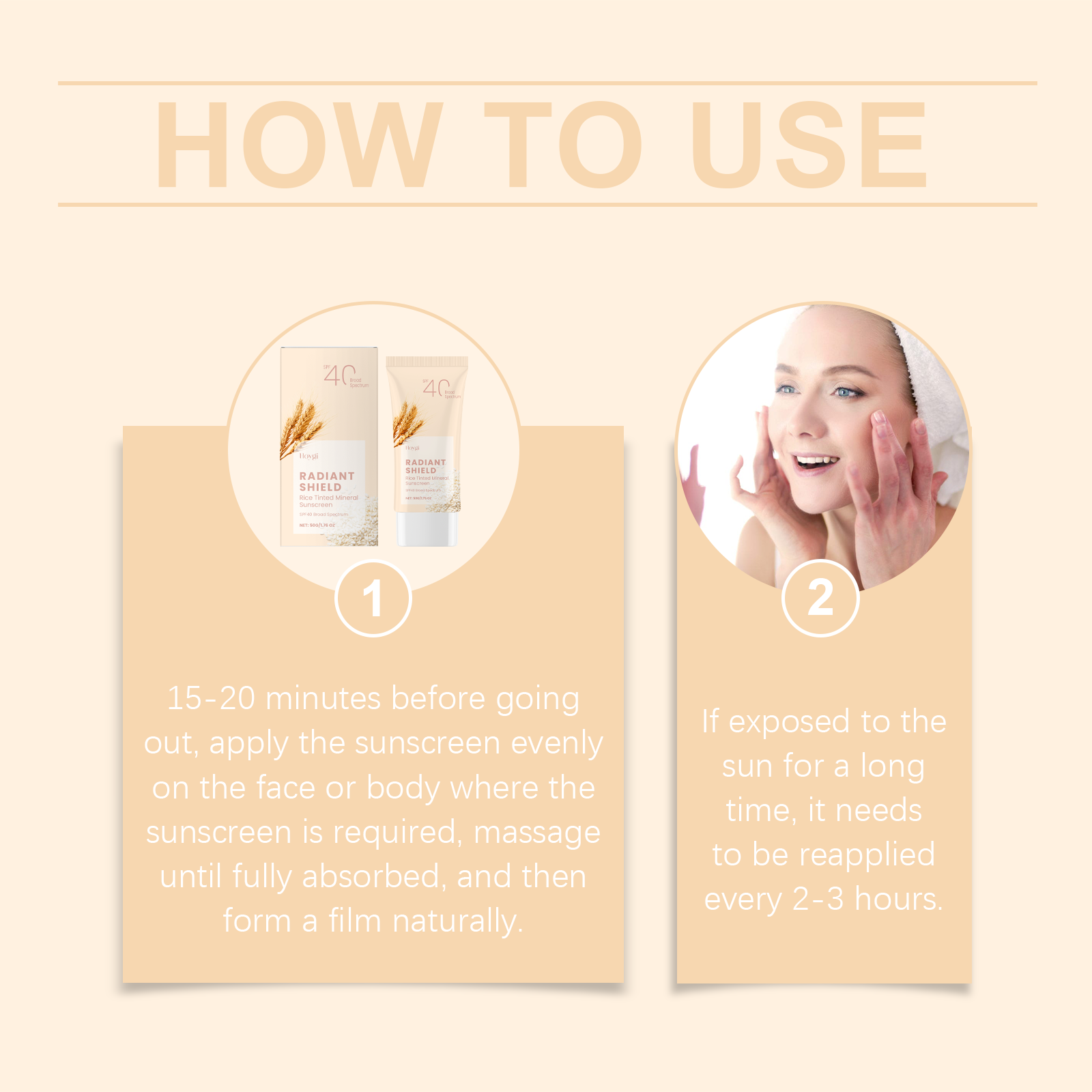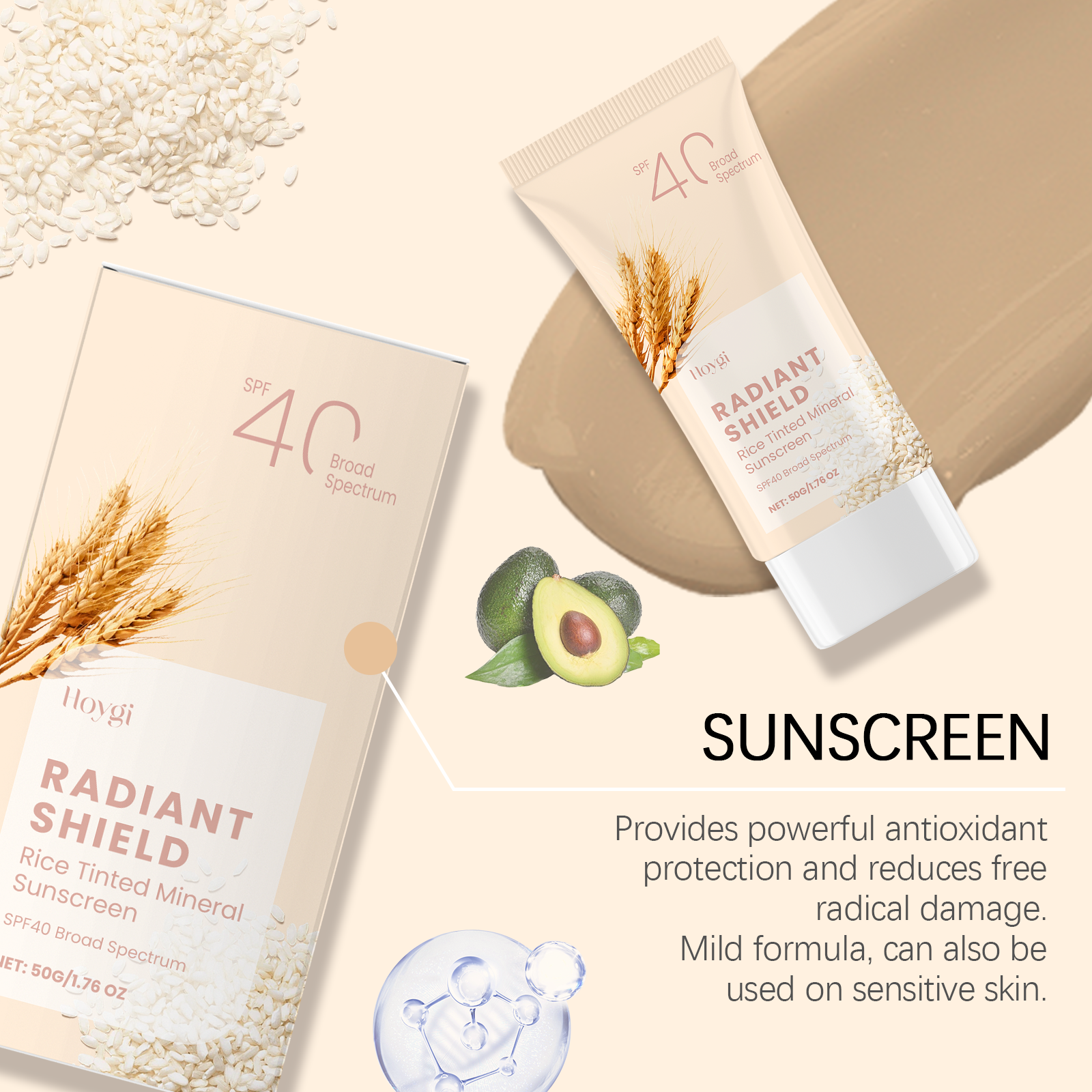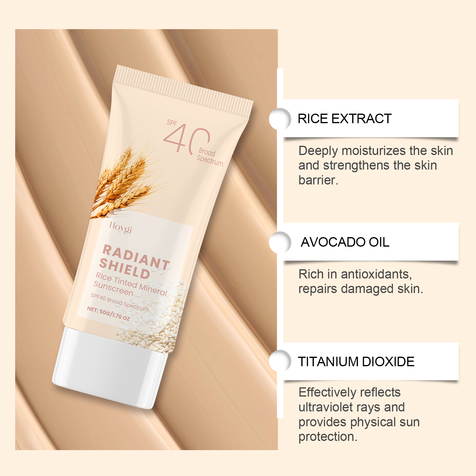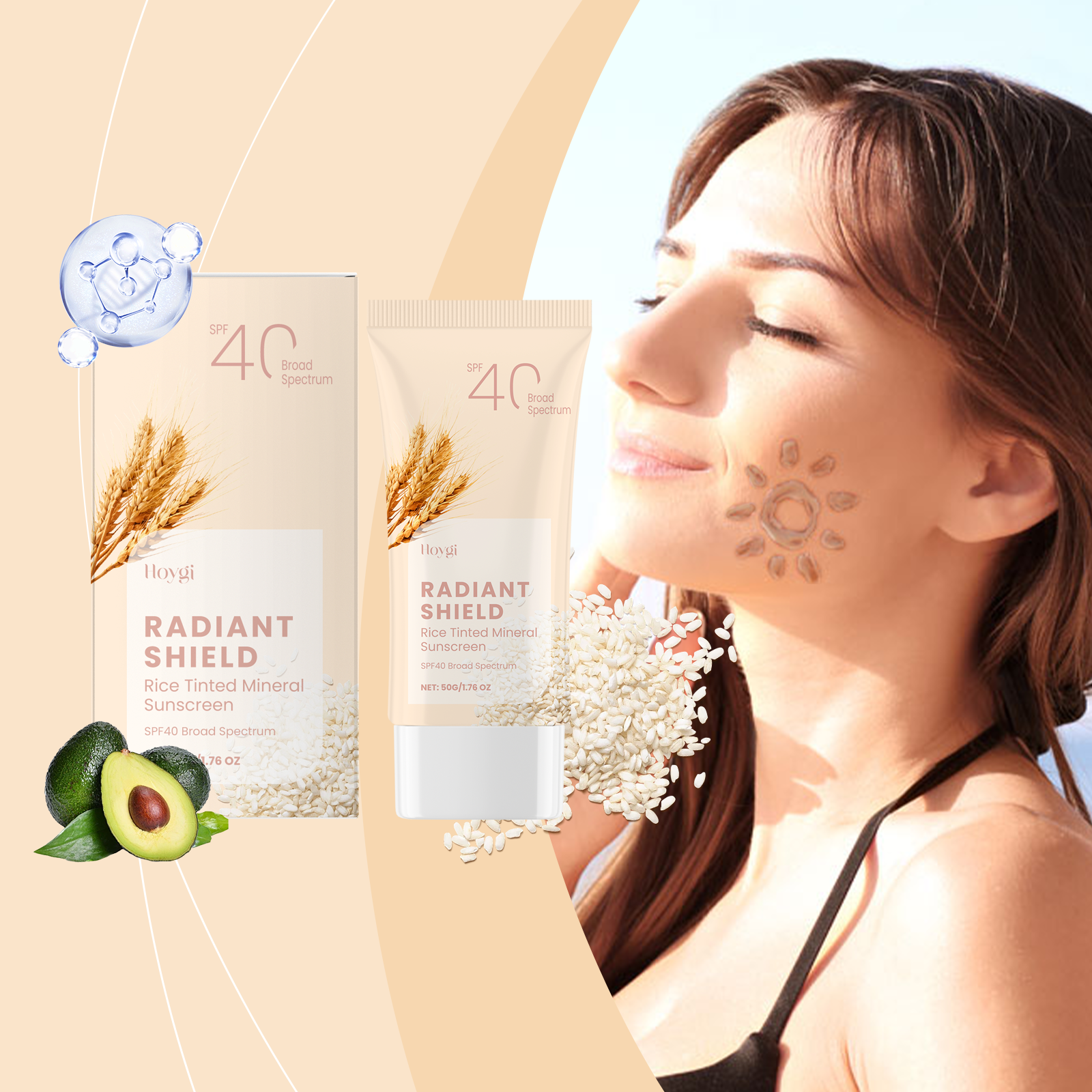 Our mild sunscreen contains rice extract, avocado oil, and titanium dioxide. It is an effective sunscreen and deep moisturizer to protect the skin all day long. Contains UVA and uvb filters to prevent sunspot formation. The way to use it is very simple: 1. 15-20 minutes before going out, evenly apply sunscreen to the face or body in need of sun protection, massage until fully absorbed, and then naturally form a layer of sunscreen. 2. If you are exposed to the sun for a long time, you need to reapply every 2-3 hours. Rich in gentle ingredients that nourish and repair skin. Light texture, not greasy, suitable for daily use. Lock in moisture and keep skin moisturized and smooth throughout the day.