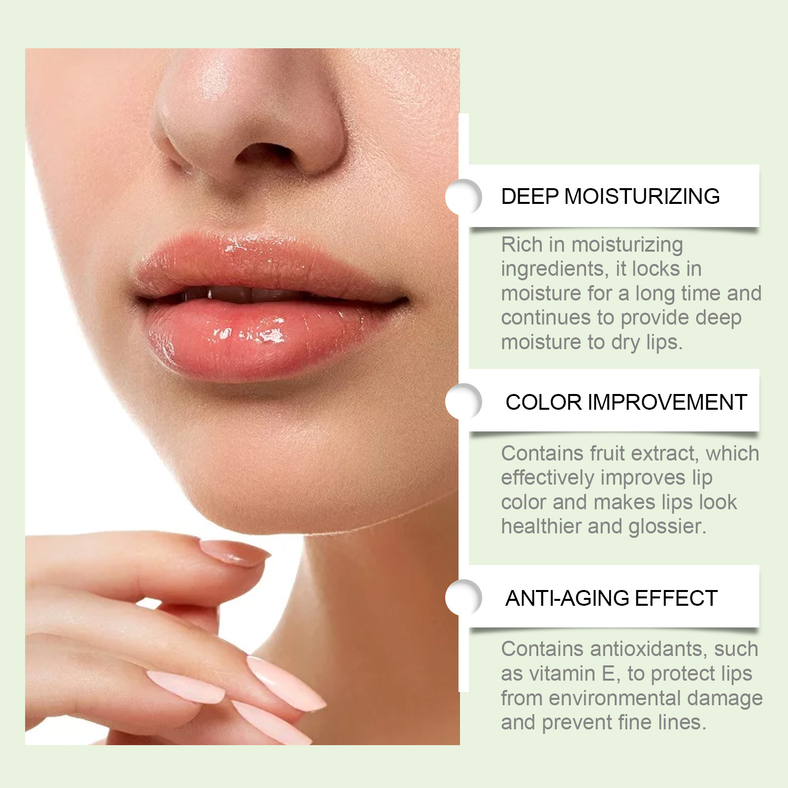 Our green apple lip mask contains beeswax and apple fruit extract. It protects your lips from environmental damage and prevents fine lines. Its use method is very simple: thoroughly clean the lip skin, dry it first, take an appropriate amount of lip mask, and evenly apply it to the lip skin. It can also be rich in moisturizing ingredients, lasting to lock in moisture, and continue to provide deep moisture for dry lips.
