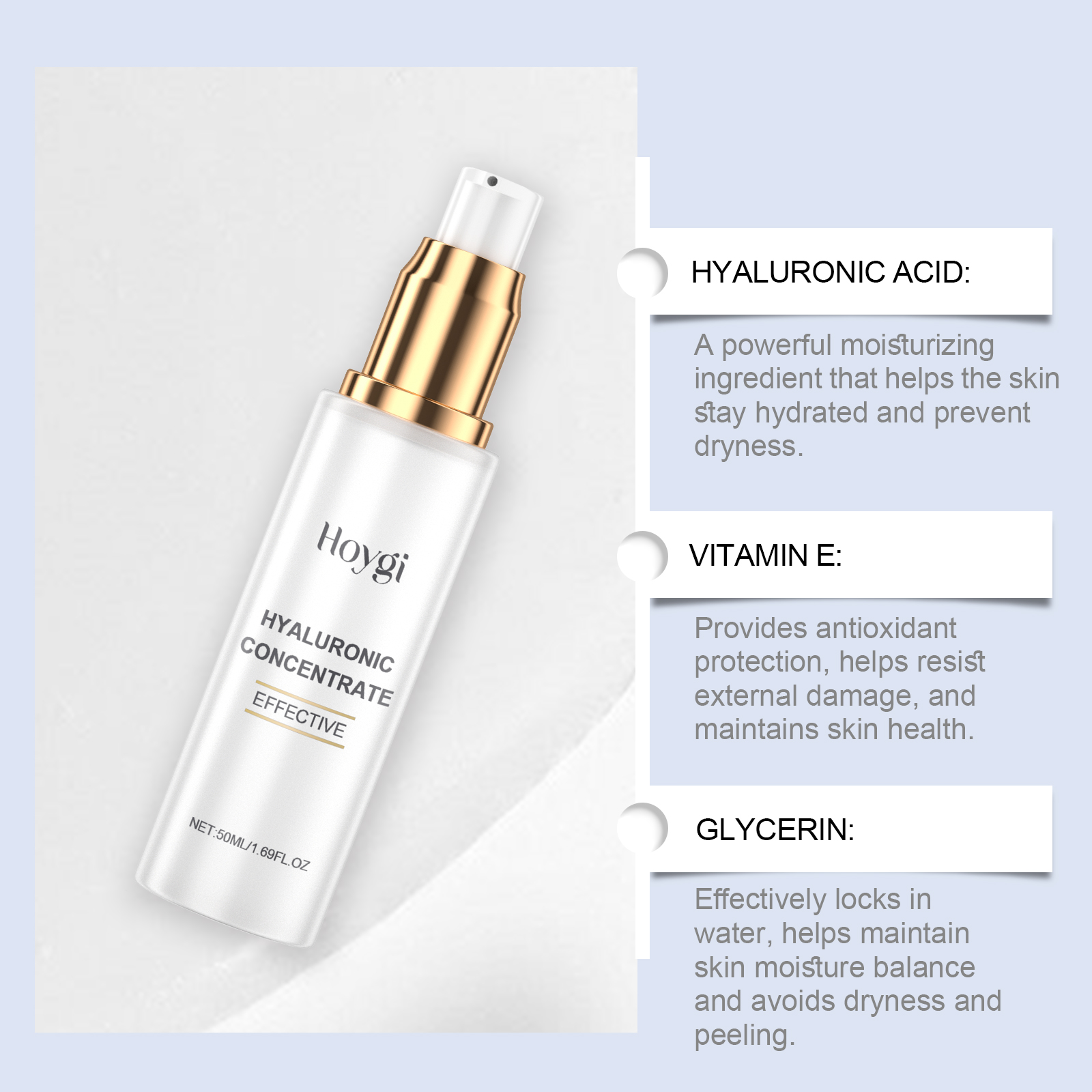 Our hyaluronic acid hydrating serum contains hyaluronic acid, glycerin, and Vitamin E (tocopherol). It can help strengthen skin elasticity and keep it smooth. Its application method is simple: 1. Clean facial skin and keep it dry. 2. Apply appropriate amount of the product evenly on the face; 3. Gently massage until absorbed. Hyaluronic acid helps the skin retain moisture and prevents dryness and roughness. Vitamin E protects the skin from environmental damage and keeps it healthy.