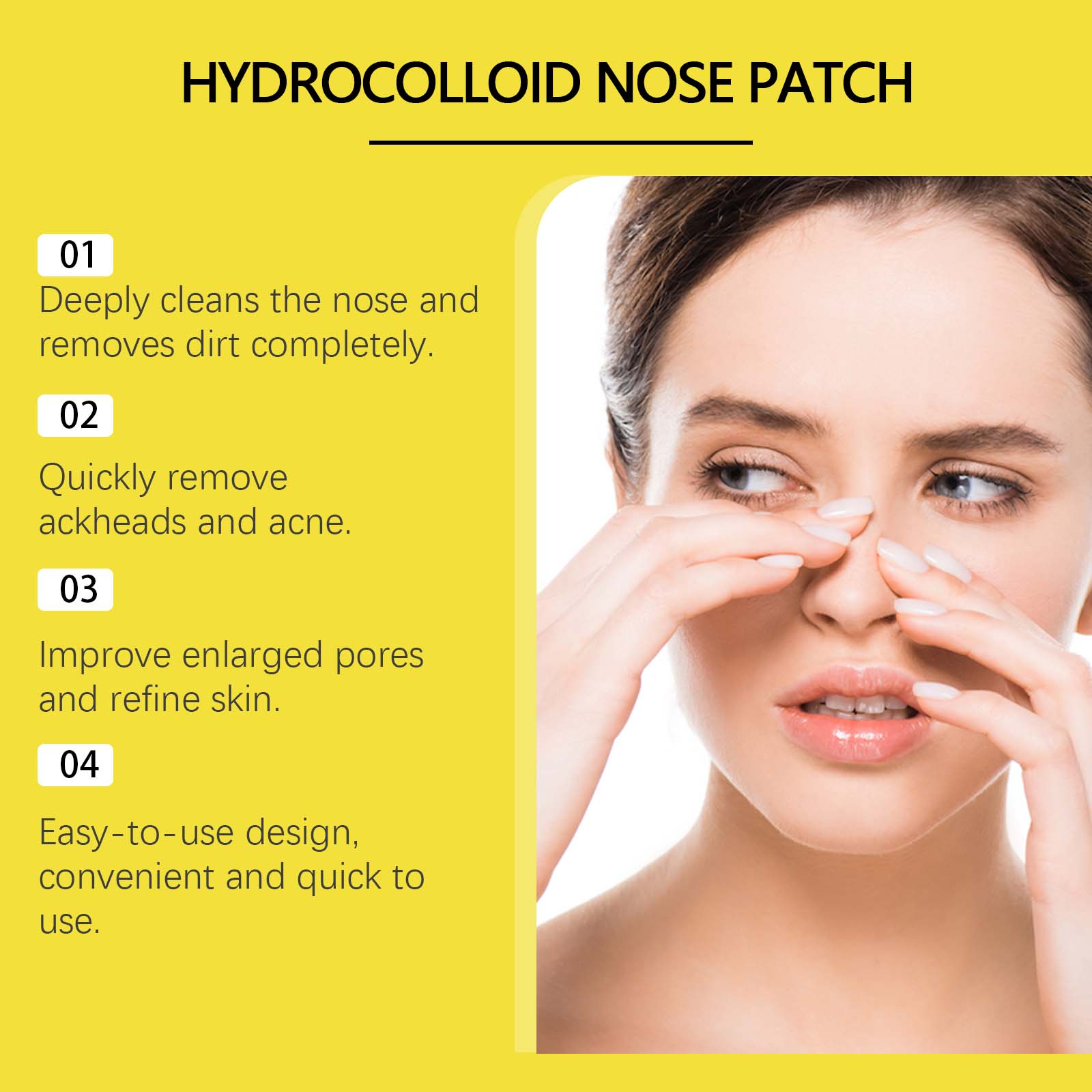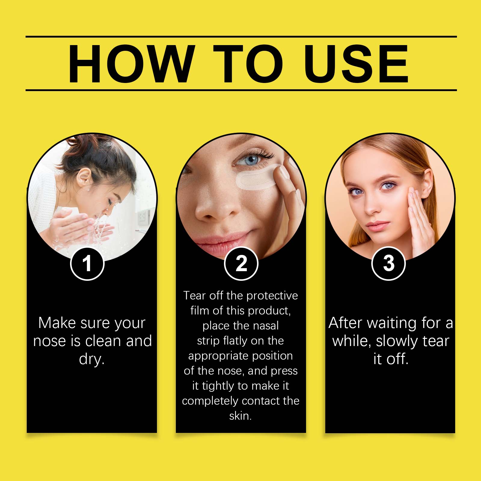 Our hydrocolloid nasal strips contain hydrocolloid. It can effectively absorb dirt in the pores and restore skin freshness. The way to use it is simple: make sure your nose is clean and dry. Remove the protective film of the product and place the nose patch flat on the nose, and press firmly so that it fully touches the skin. After a while, slowly peel it off. And simple to use design, easy to use.